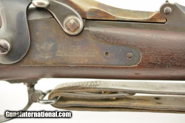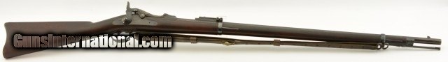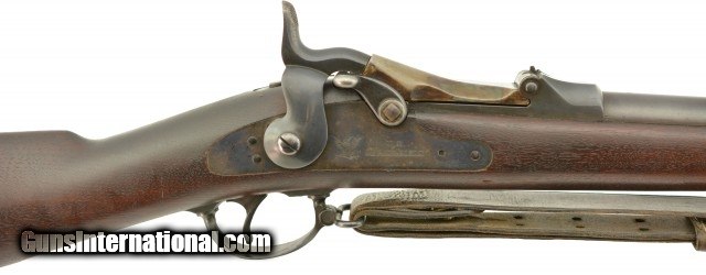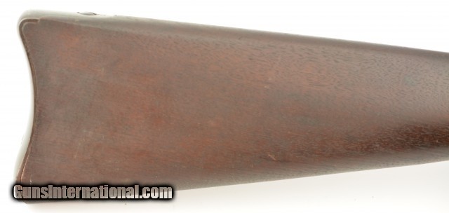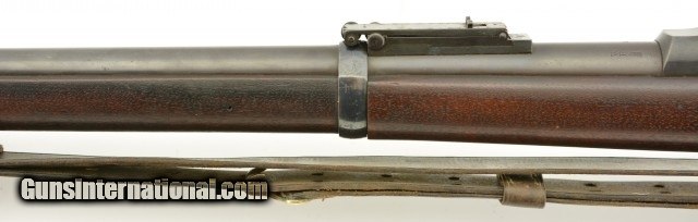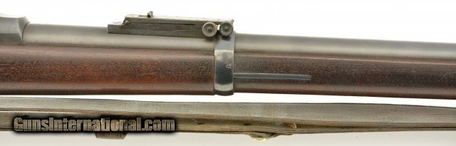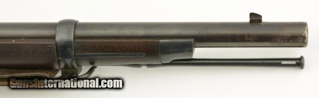 Description: Serial #446864, .45-70 Gov't., 32 5/8" barrel with an excellent, bright bore. This is an exquiste rifle that retains 97-98% of the original blue finish on the barrel, lock, hammer, and stock furniture. Only some gray fading at the muzzle, and some traces of mild freckling on the bands and trigger guard are present, while the breech-block retains a commensurate amount of bright, original color case-hardening. The walnut stock has a crisp "SWP / 1889" cartouche on the left side, and only minor handling marks in the otherwise excellent original oil finish. The rifle comes with a correct blued steel ramrod, and is equipped with a correct Buffington rear sight and also has an original leather sling installed in excellent condition. This is a splendid Model 1884 Trapdoor, and is in excellent, virtually unissued condition. Antique SOLD Antique: Yes |