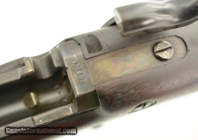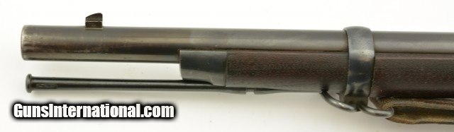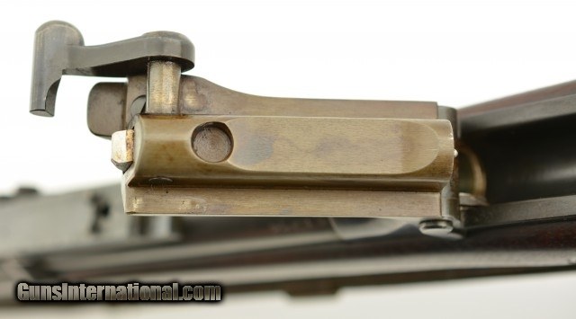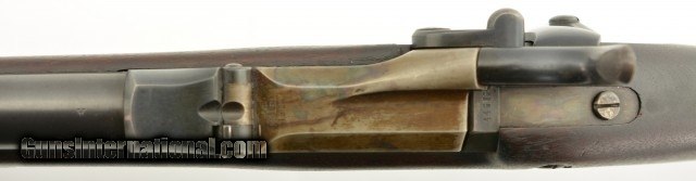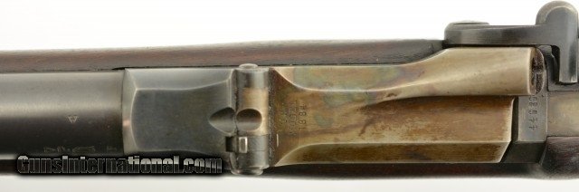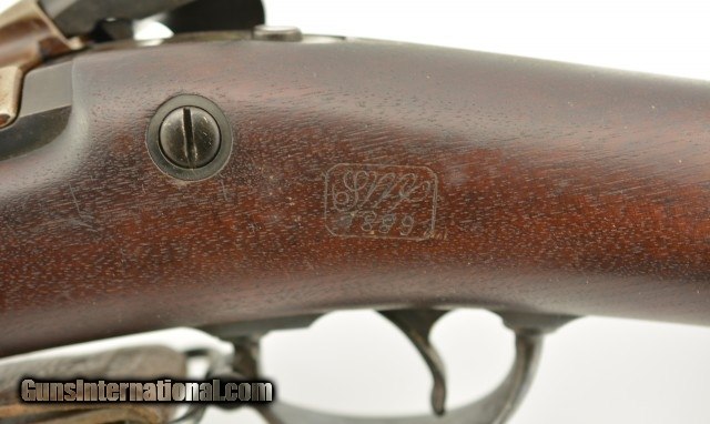Description: Serial #446864, .45-70 Gov't., 32 5/8" barrel with an excellent, bright bore. This is an exquiste rifle that retains 97-98% of the original blue finish on the barrel, lock, hammer, and stock furniture. Only some gray fading at the muzzle, and some traces of mild freckling on the bands and trigger guard are present, while the breech-block retains a commensurate amount of bright, original color case-hardening. The walnut stock has a crisp "SWP / 1889" cartouche on the left side, and only minor handling marks in the otherwise excellent original oil finish. The rifle comes with a correct blued steel ramrod, and is equipped with a correct Buffington rear sight and also has an original leather sling installed in excellent condition. This is a splendid Model 1884 Trapdoor, and is in excellent, virtually unissued condition. Antique SOLD Antique: Yes |