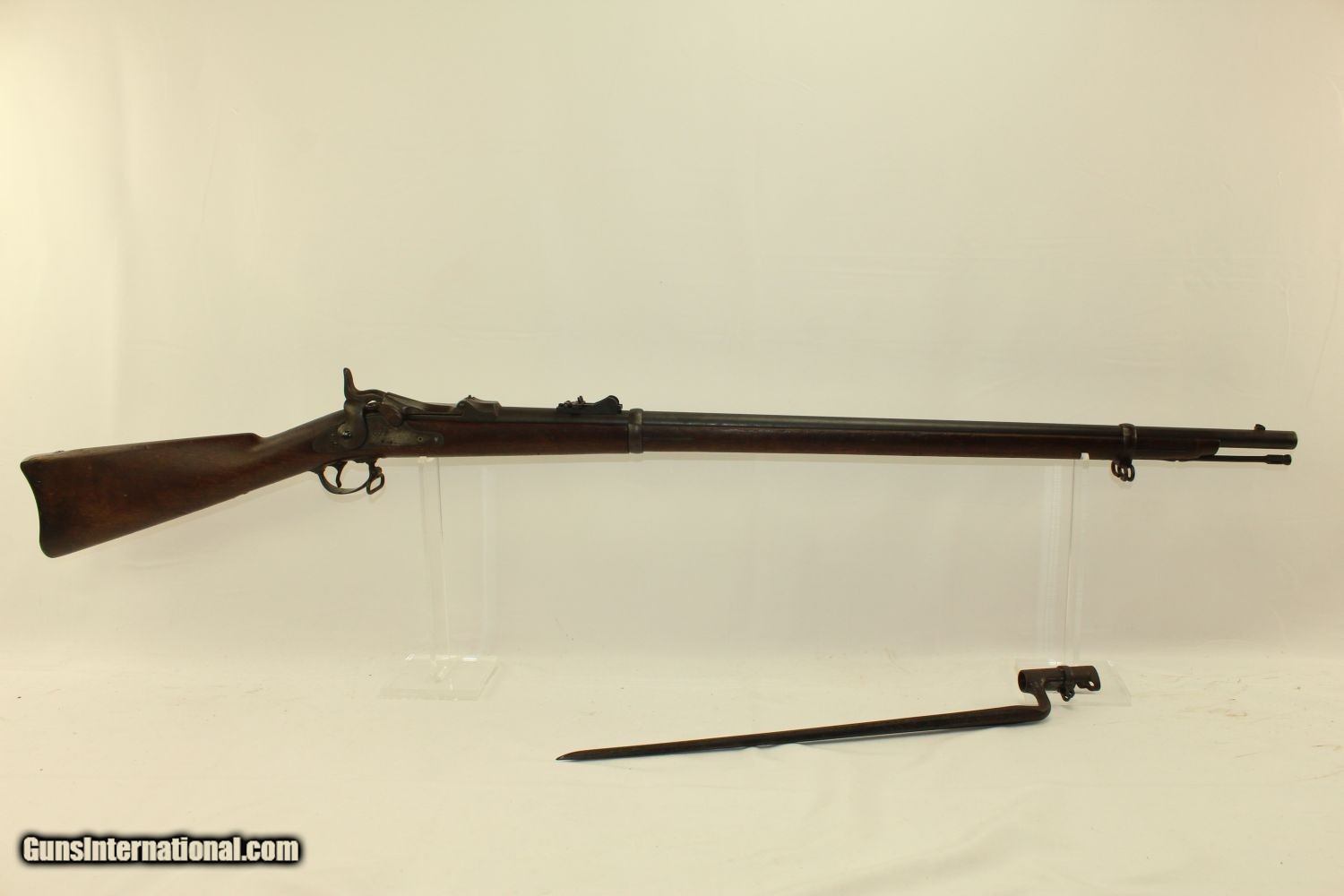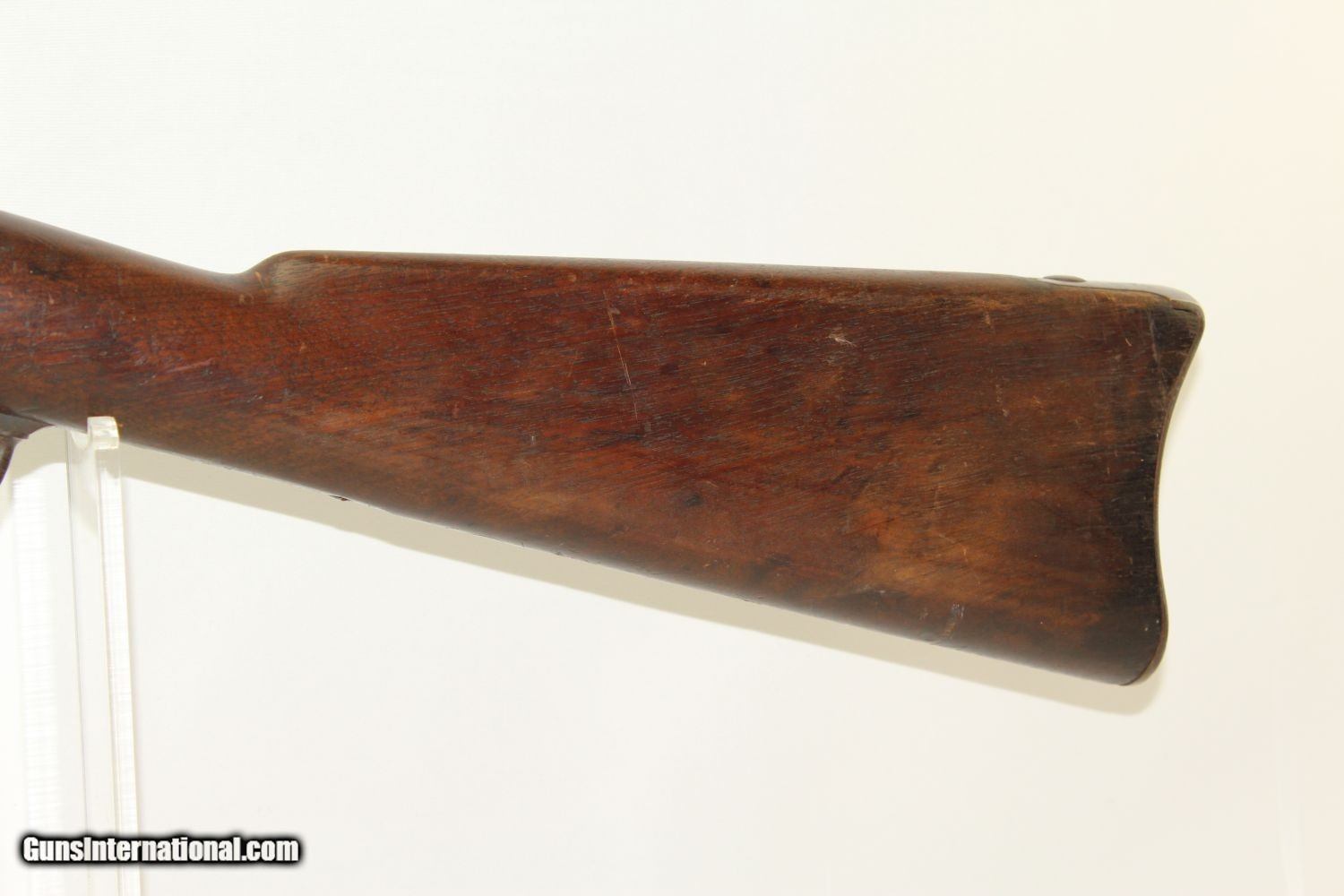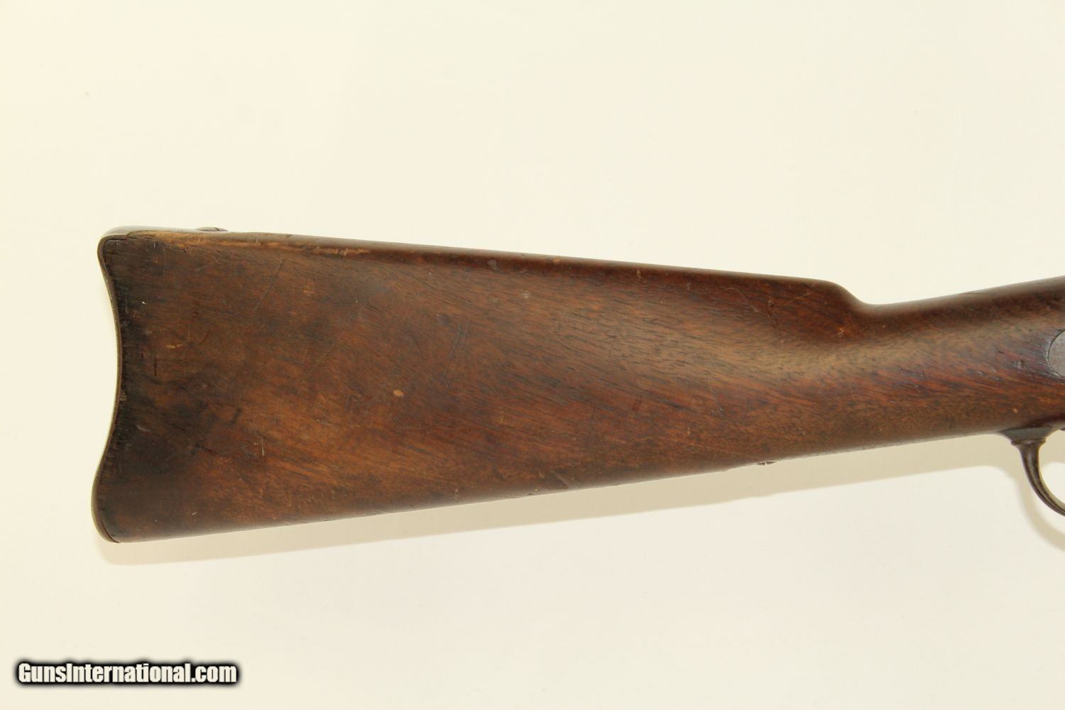 Description: INDIAN WARS Antique SPRINGFIELD M1879 TRAPDOOR Rifle Dated 1884 .45-70 GOVT The Original .45-70 GOVT! Dated 1884! Here we present an antique U.S. Springfield Model 1879 Trapdoor Rifle, made circa 1884 by the Springfield Armory. After the Civil War, the War Department wanted a breech-loading rifle. To be specific, it wanted a breech-loading rifle that would chamber a self-primed, metallic cartridge. Amazingly, despite the adoption of the ill-fated Model 1882 Chaffee-Reese Bolt Action Magazine Rifle, new models of trapdoor rifles continued to be produced and used all the way through the mid-1890s, until finally, the Krag-Jorgensen was adopted. The U.S. continued to see unrest and conflict with the displaced Native Americans during this time, including the Wounded Knee Massacre on December 29th, 1890. Trapdoors continued to see use all the way through the Spanish American War. This specimen is marked “U.S./MODEL/1878” on the breech block. The lock is marked “Eagle/U.S./Springfield”. The left side of the barrel bears the “V/P/Eagle head” proof marks. The left side of the stock bears the inspector cartouche of “SWP/1884, for Chief Ordnance Inspector Samuel W. Porter. The overall condition is Near Fine. The action is as strong as ever! The bore is bright! The bayonet attaches firmly and easily. Here is a very solid US government issue rifle from the Indian Wars! Own the original! This is a legitimate antique and not a reproduction. Barrel is 32-5/8 inches. Caliber: .45-70 Government Overall condition as seen in photos. Very Fast. Very Safe. FREE SHIPPING WORLDWIDE. Delivered directly to your door by express mail! Guaranteed AUTHENTIC & Includes CERTIFICATE OF AUTHENTICITY. ancestryguns $1400 #190916 SOLD Antique: Yes |