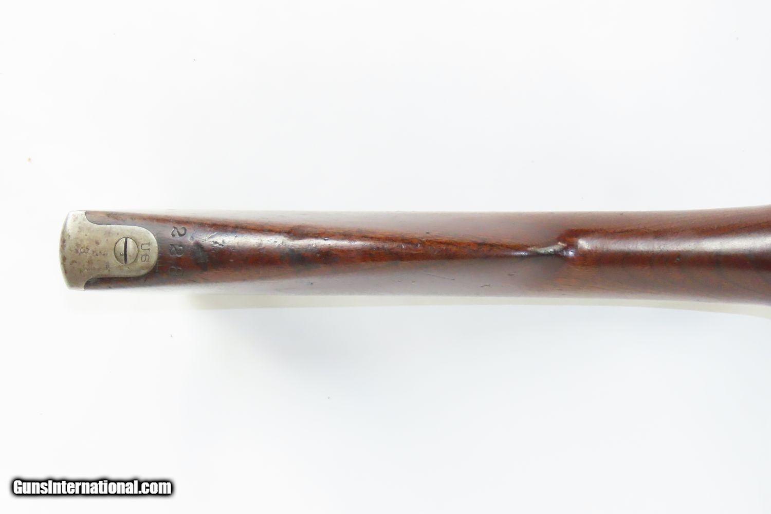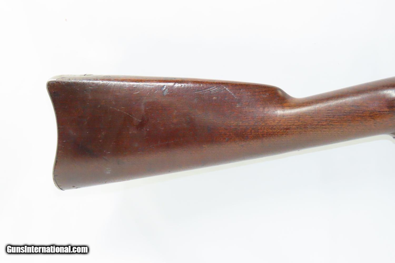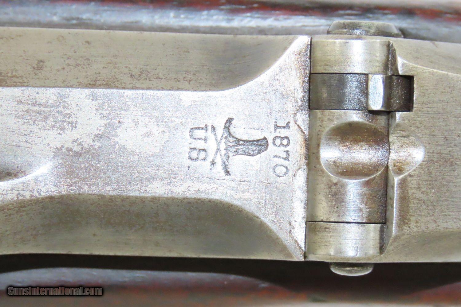 Description: INDIAN WARS Antique SPRINGFIELD Model 1868 Breech Loading TRAPDOOR Rifle 1863 Dated Lock & 1870 Dated Breech with SLING! Here we present a Springfield U.S. Model 1868 Trapdoor Rifle, made circa 1870 in Springfield, Massachusetts for the U.S. Military. Over 51,000 Model 1868 rifles were produced at the Springfield Armory between 1868 and 1872. These arms feature the distinctive “Trap Door” breech loading system designed by Master Armorer Erskine S. Allin, who was the key to many military issued and experimental arms between 1865 and 1894. Some Model 1868 rifles, including this one, were produced with lock plates bearing the dates of 1863 or 1864, while barrels are dated 1869 or 1870. The Trapdoor Rifle was the primary weapon in the U.S. military from the end of the Civil War to the end of the 19th Century, encompassing the Indian Wars and even the Spanish-American War in Cuba. It was still being used when the Springfield 1903 was adopted. These rifles were initially made by converting muzzle loading Civil War muskets to single load cartridges from the breech by installing a “trapdoor”. Later iterations were purpose built from the ground up and chambered for .45-70 GOVT, but these early conversion examples were chambered for the even more massive .50-70 GOVT. The overall condition is very good. Strong and tight action. Mostly bright bore throughout. The walnut stock is solid with two visible cartouches, one of which is legible and contains the initials of inspector Erskine S. Allin, for which this system happens to be named. “1863” dated lock from the original Civil War era musket and “1870” on the breech block of the conversion. Every collection deserves a Trapdoor rifle from Springfield! Own the original! This is a legitimate antique and not a reproduction. Barrel is 32-1/2 inches. Caliber: .50-70 GOVT Overall condition as seen in photos. Very Fast. Very Safe. FREE SHIPPING WORLDWIDE. Delivered directly to your door by express mail! Guaranteed AUTHENTIC & Includes CERTIFICATE OF AUTHENTICITY. ancestryguns $2465 #210853 SOLD Antique: Yes |
