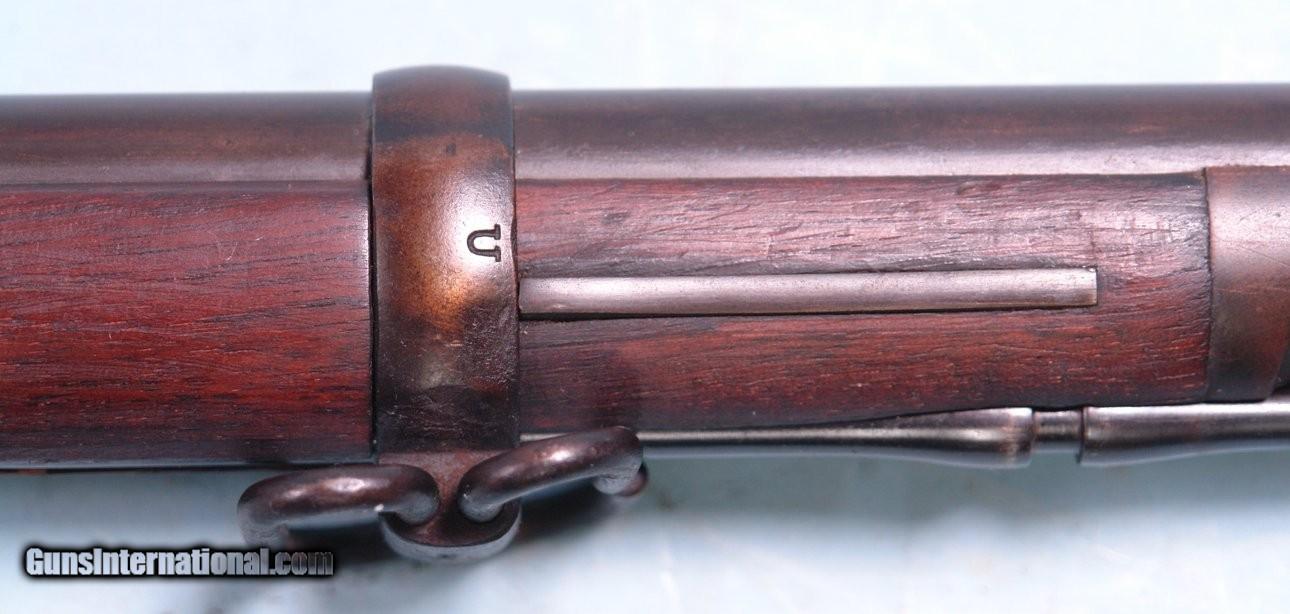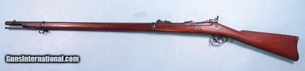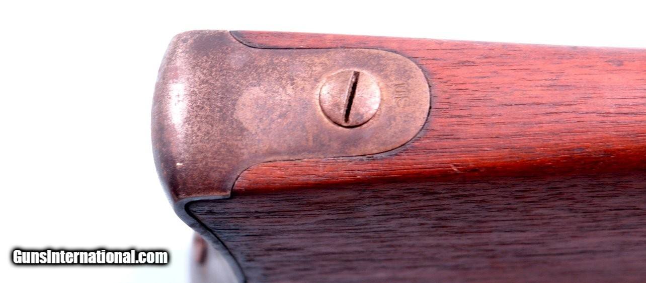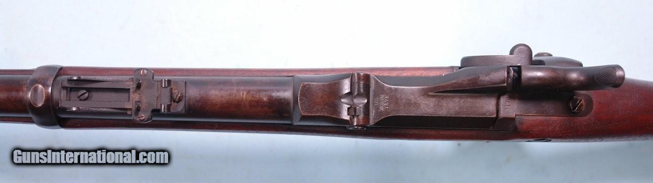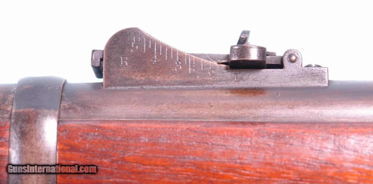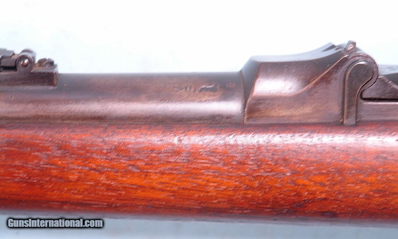 Description: INDIAN WARS SPRINGFIELD U.S. MODEL 1884 TRAPDOOR .45-70 CAL. RIFLE. All original 1886 production date during the Geronimo-Apache War and has the Model 1879 rear sight seen on these transition Model 1884 rifles. Very good to fine with even 50-60% blue and patina. Excellent markings on metal faint trace of cartouche on left side of stock. Extra nice bore and perfect working order. SOLD Antique: Yes Rifle Caliber: .45-70 Government |