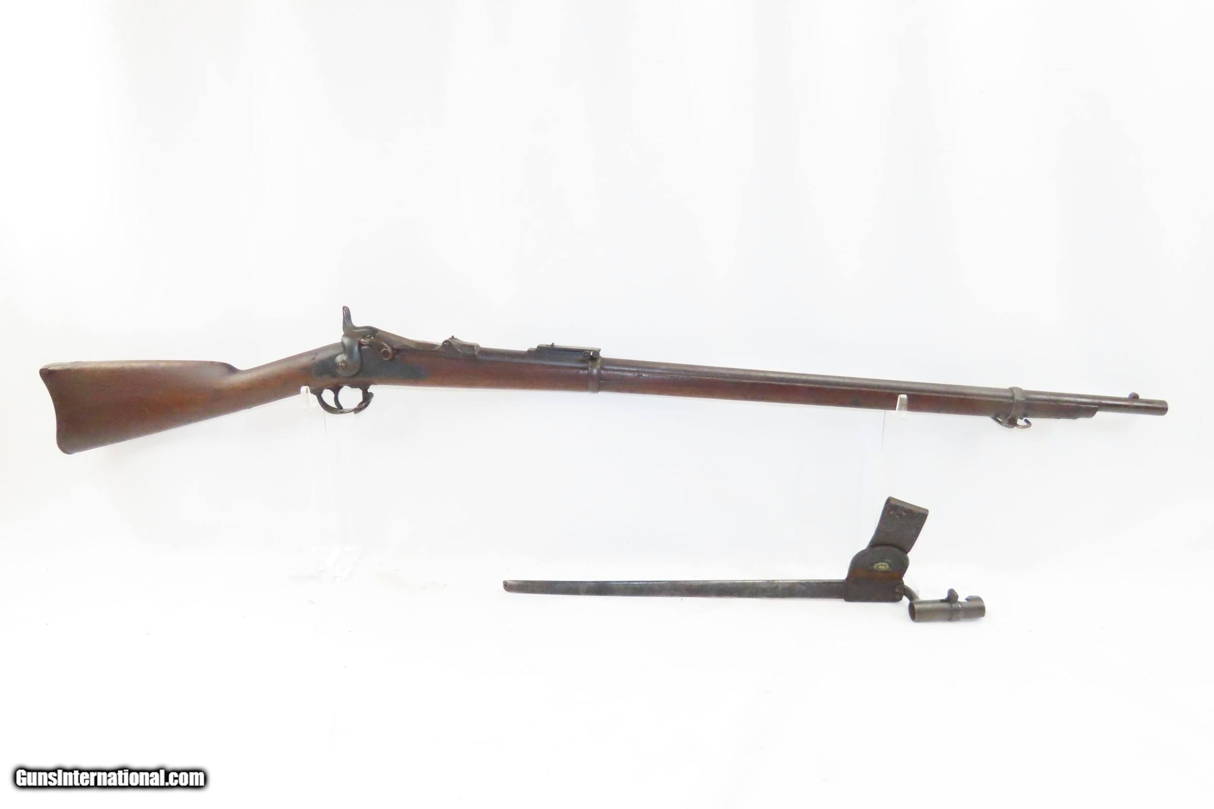 Description: Indian Wars U.S. SPRINGFIELD Model 1873 TRAPDOOR .45-70 GOVT. Caliber Rifle Manufactured at the Start of the RED RIVER WAR! Here we present an antique U.S. Springfield Model 1873 Trapdoor Rifle, made by the Springfield Armory in 1874. After the Civil War, the War Department wanted a breech-loading rifle. To be specific, it wanted a breech-loading rifle that would chamber a self-primed, metallic cartridge. Amazingly, despite the adoption of the ill-fated Model 1882 Chaffee-Reese Bolt Action Magazine Rifle, new models of trapdoor rifles continued to be produced and used all the way through the mid-1890s, until finally, the Krag-Jorgensen was adopted. As settlers moved into the Great Plains region, they battled the Plains Indian tribes in a series of conflicts known as the Sioux Wars, which lasted from 1854 to 1890. In 1875, the discovery of gold in the Black Hills region of South Dakota brought prospective miners into the area and onto the hunting grounds of the Sioux Indians. The US Army responded to the pleas of the settlers and miners for protection against the Sioux, and the Great Sioux War of 1876-77 erupted. It was the last major conflict between the US Army and the Sioux tribe. The U.S. continued to see unrest and conflict with the displaced Native Americans during this time, all the way through to the Wounded Knee Massacre on December 29th, 1890. Trapdoors continued to see use all the way through the Spanish American War. The overall condition is good. Strong action. The bore is in good shape and remains clear. Solid stock with an average amount of wear (minor scuff and dings) and a legible cartouche on the left wrist. “1873” dated lock. “US” stamped buttplate tang. The cleaning rod is absent. This example included the bayonet and scabbard. Own the original! This is a legitimate antique and not a reproduction. Barrel is 32-5/8 inches. Caliber: .45-70 GOVT Overall condition as seen in photos. Very Fast. Very Safe. FREE SHIPPING WORLDWIDE. Delivered directly to your door by express mail! Guaranteed AUTHENTIC & Includes CERTIFICATE OF AUTHENTICITY. ancestryguns $1200 #217765 SOLD Antique: Yes |
