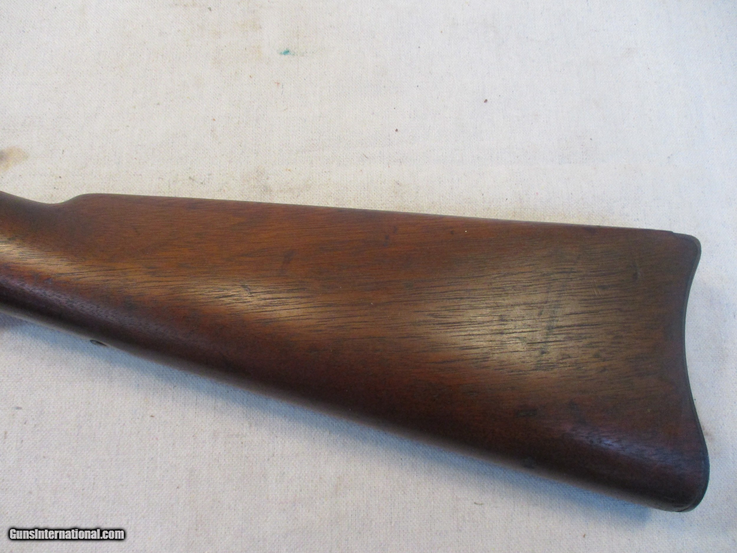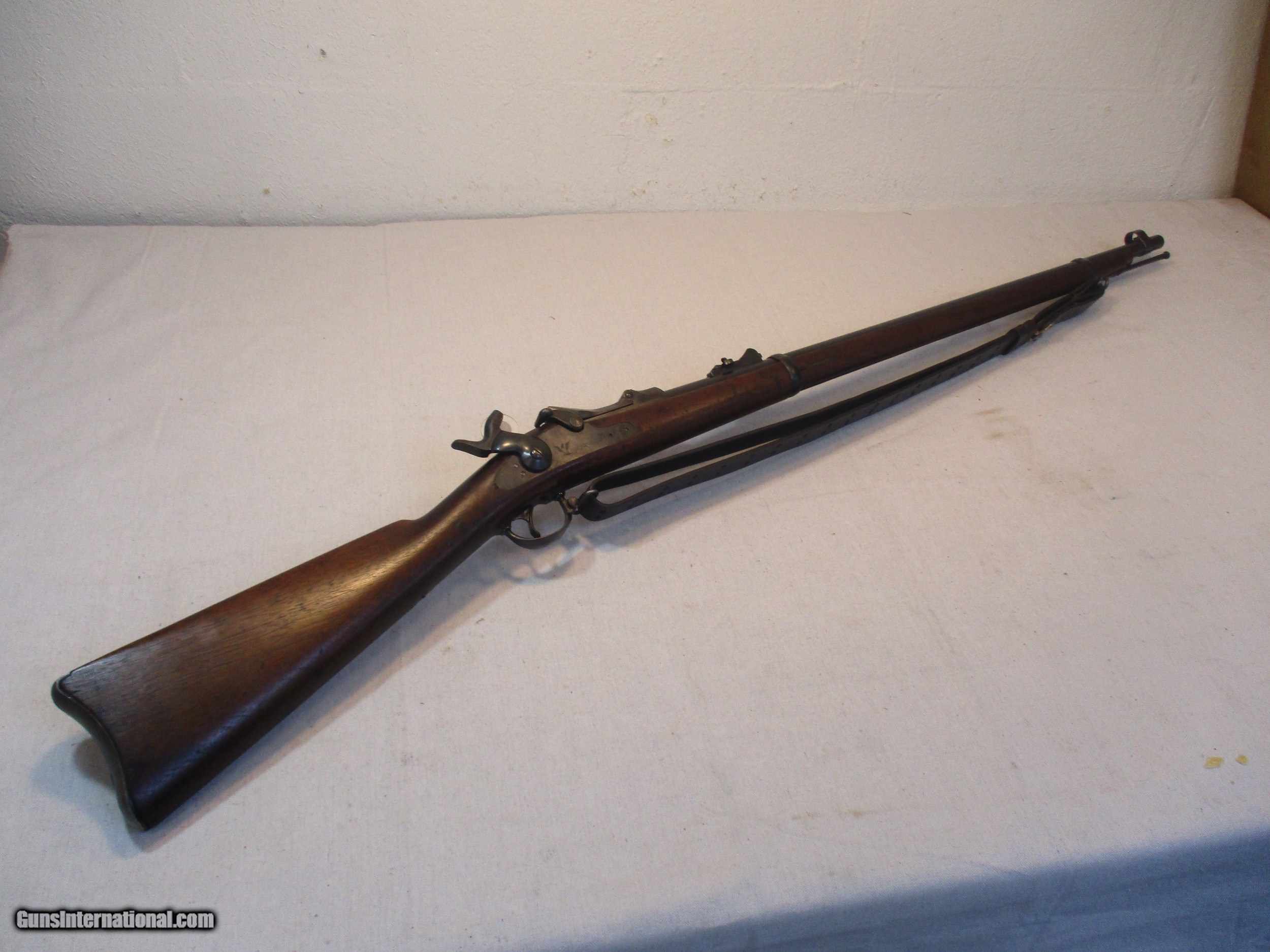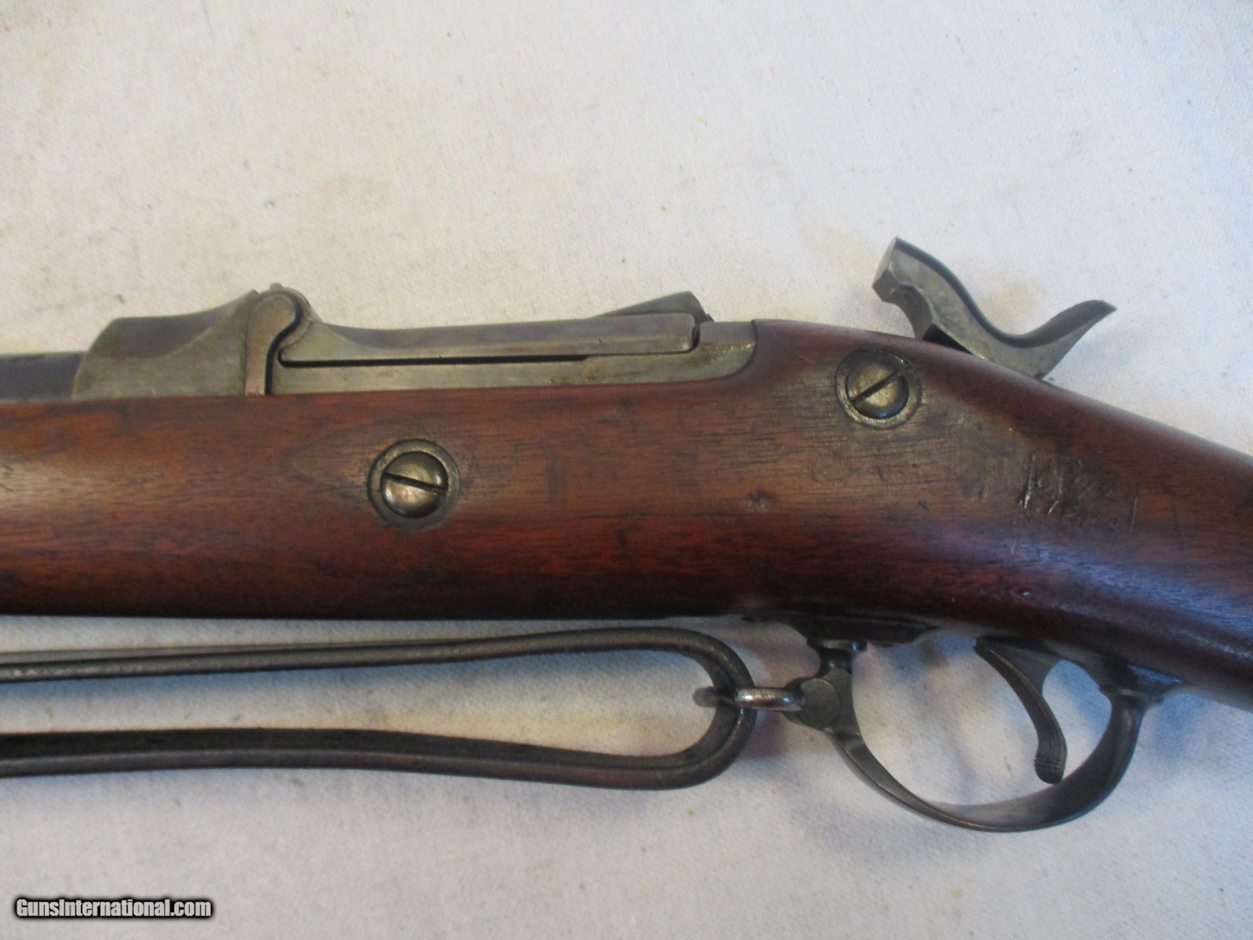 Description: Make: Springfield Armory Model: U.S. Model Springfield 1873 .45-70 Govt. Trapdoor rifle Serial Number: 267010 Year of Manufacture: 1884 Caliber: .45-70 Govt. Action Type: Single Shot with Trapdoor Breech Markings: The lock plate is marked U.S. over SPRINGFIELD with an eagle to the rear of this marking. The top of the breech block is marked U.S./Model/1873. The barrel has a V over P over eagle over P at the breech. Left side of barrel in front of breech is marked "R". The rear sight is marked "R" The two barel bands are marked with "U". The top of the butt plate is marked "US". The stock has a cartouch with initials and stamped 1884 on left wrist area. There is a cicle P behind the rear trigger tang. Barrel Length: Approximately 32 5/8" Sights / Optics: The front sight is a blade atop a raised base, with an added hood. the rear is a ladder sight with 1-5 graduation. Stock Configuration & Condition: The stock is hardwood with a straight grip, cutout for the included ram rod, metal nose cap, two sling loops, two barrel bands and a metal buttplate. The stock is in very nice condtion with only minor handling marks, and one thin crack next to right barrel tang. Type of Finish: The barrel finish is deep blue with very light areas of corrosion. No signs of wear, nicks or pitting. The case hardening on the trapdoor, and rear tang are in very fine condition. Finish Originality: See picture Bore Condition: The bore and breech are in excellent condition, very bright and shiney. Overall Condition: The finish shows only very minor corrison. The lock plate shows no rust or pitting. The case hardening is very strong. The buttplate shows some swear and surface erosion.The screw heads are still crisp. The markings are very readable. Comes with reprouction leather sling . Overall, this rifle is is in very fine condtion. Mechanics: The action functions correctly with very strong hammer spring and 3 cocking position. Box, Paperwork& Accessories: None ******************************************************rcf PLEASE READ OUR FULL DISCLAIMER! Customer Service is available Monday - Friday 10 AM to 5 PM Central Time, to answer questions and emails, or take payments. Reserve prices are not disclosed, so don't ask. Layaway is not offered. Shipping available only within the lower 48 states. We do our best to show everything in the pictures so you know exactly what you are getting. Check out our feedback & purchase with confidence. All items are sold AS IS with NO warranty or guarantees, implied, expressed, or otherwise (Inquire with manufacturers to verify any warranties they may offer). The buyer is ultimately responsible for determining the condition of the item, please ask for additional information or more photos before purchasing if you're unsure. A valid FFL is required for most transactions (C&R Type 3 FFL's are not accepted, NO EXCEPTIONS), and a file copy of the seller FFL will be shipped with the item. Shipping rates will vary based on final sale value, and include ground rates with insurance and signature. Shipping is available within the lower 48 states only. Local pickup is available Monday - Friday, from 10 AM to 5 PM. Accepted forms of payment are charge/debit cards (All Major Credit Cards Accepted), cash (Wire Transfer), money order, Cashiers/Teller/Certified Check or personal check (Item is held for 10 business days to allow ANY checks or money orders (except USPS money orders) to clear). A 3% convenience fee will be added to purchases made with charge/debit cards. Returns are only accepted on a case by case basis depending on the circumstances, and a 20% restocking fee will be charged on all returned or incomplete sells. Have questions, ask. Buyers are solely responsible for determining the safety of items purchased. No firearm should be fired without having the weapon initially inspected by a qualified gunsmith. The firearms offered have NOT been TEST FIRED unless otherwise stated, but have been given a visual inspection for sale purposes only. We are not gunsmiths and can sometimes miss things. It is recommended that buyers have all firearms inspected by a competent gunsmith prior to use. Buyers are solely responsible for their awareness of and compliance with all laws and regulations in their state of residence regarding firearms, ammunition, magazines, accessories, and blades. By purchasing, buyer agrees to release seller from all liability, whether criminal or civil, arising from the purchase, ownership, possession, or use or misuse of items, and against damages, injury or death caused by use or misuse, or defective merchandise. Thank you for your interest & please check out my other listings. SOLD Antique: Yes |