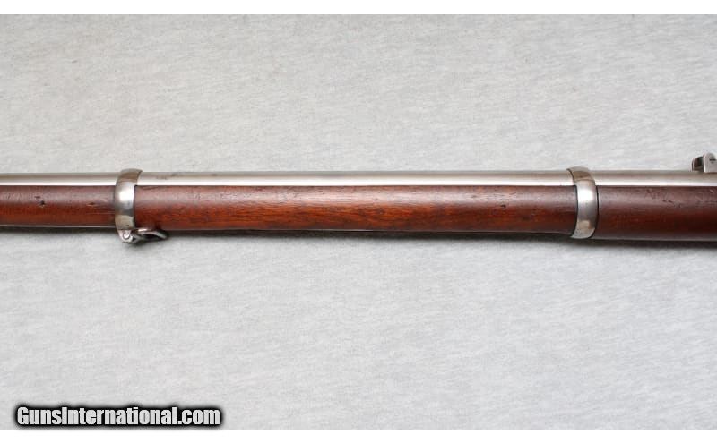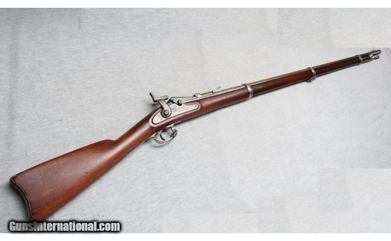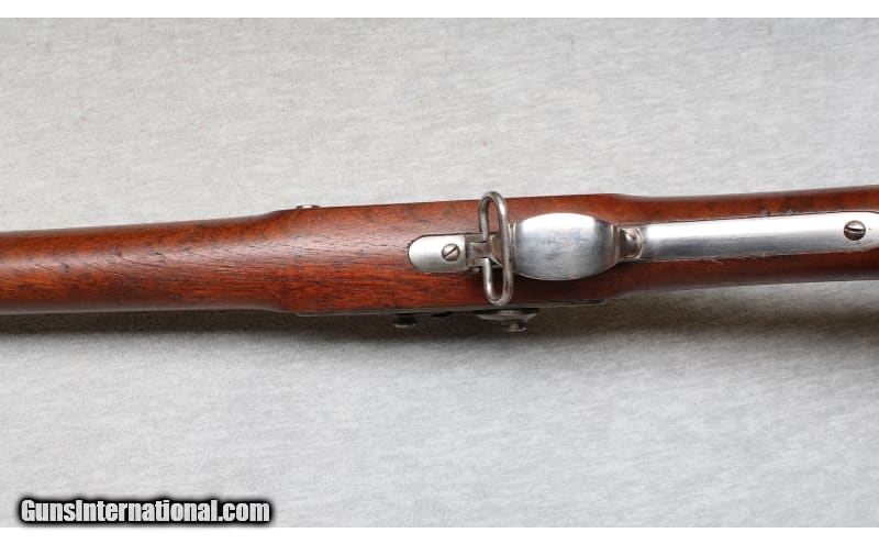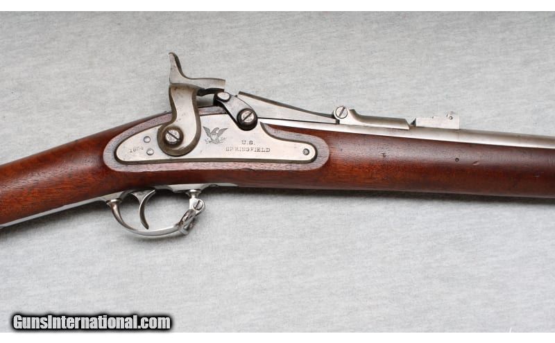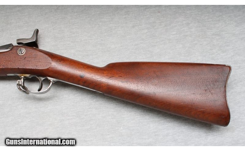Description: US Springfield 1866 2nd Allin Trapdoor Single Shot chambered in .50-70 Government. This rifle features a 36 5/8" with barleycorn front sight and 700-yard graduated leaf rear sight. 1866 Dated breechblock with eagle head. 1864 Springfield lock. Left side of barrel has "JB" inspector's mark. 3 Band walnut stock with visible cartouche on left side and markings behind trigger guard tang that appear to be "F" and "N". Slotted tip cleaning rod. Estimated 25,000 were converted from Model 1863 percussion muskets. CONDITION: very fine. Barrel and fittings were finished in the white and remain largely so showing scattered dark spots. Lock retains 40% lightly visible case colors. Breechblock has fading blue. Exceptionally good original wood finish showing scratches and marks. Bore is generally bright with strong rifling showing scattered light pitting. .50-70 Government SOLD Antique: Yes Metal Condition: Very Fine Wood Condition: Exceptionally good original wood finish Bore Condition: Bore is generally bright with strong rifling showing scattered light pitting. Barrels: 36 5/8 Inches Triggers: Factory Stock Dimensions: LOP 13 1/4 Inches Fore End: Smooth Walnut Butt Pad: Crescent steel Sights: Barleycorn front sight and 700 yard graduated leaf rear sight Item Location: La Vista, NE |