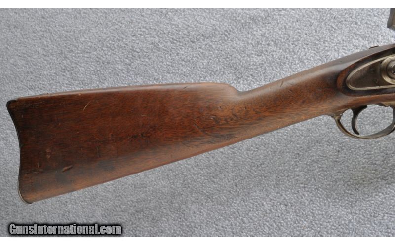Description: The 1866 second Allin conversion rifles were produced at the Springfield Armory beginning early in 1867.About 52,000 rifles were converted between 1867 & 1869. About half of these were sent to Europe for use inthe Franco - Prussian War and were later destroyed. About 26,000 stayed in the U.S. SOLD Antique: Yes Manufacturer: 1867 Caliber Info: .50-70-450 Metal Condition: Barrel is in the white with patches of surface rust, lock plate, hammer and other external metal is peppered with rust spots Wood Condition: Stock shows many dents, gouges and creases but, no cracks are visible Bore Condition: Strong rifling with trace rust visible near the muzzle Barrels: 36.6" Three Lands & Grooves 1:42" twist Stock: Uncheckered straight grip Stock Dimensions: 13" LOP Fore End: Full length with three barrel bands Butt Pad: Metal Weight: 9 lbs 6 oz Sights: Barley corn front, Single flip-up leaf rear Item Location: Grand Junction, CO |