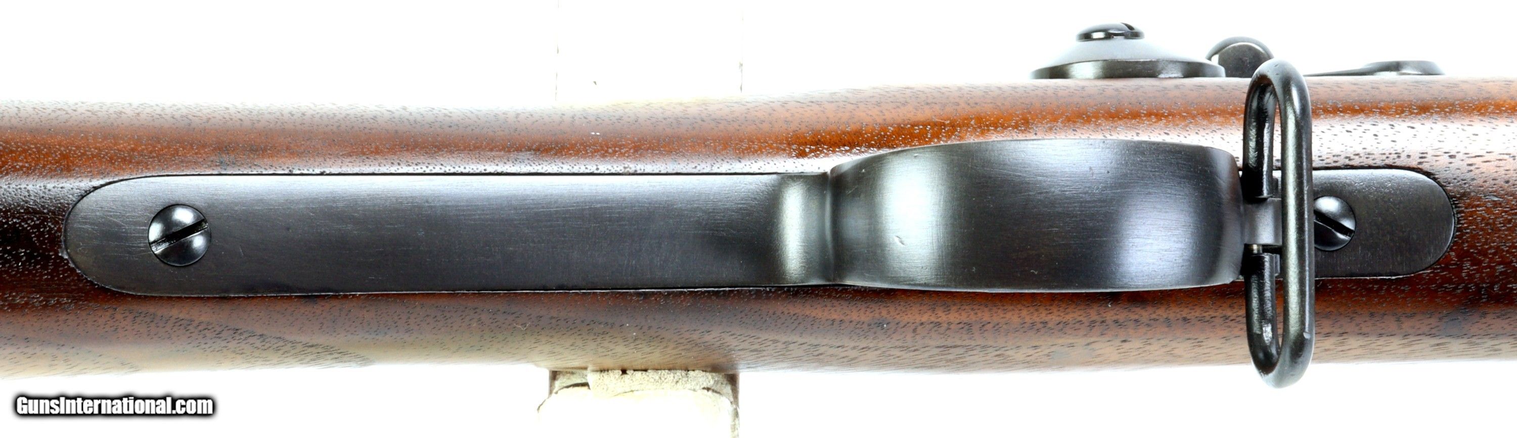 Description: SPRINGFIELD ARMORY MODEL 1884 TRAPDOOR RIFLE chambered in 45/70 and mfg in 1892. S/N: 547623 BEAUTIFULLY RESTORED BY SHOOTER'S EXCHANGE!!! The 32.5" barrel has great bluing and a bright, clean bore with STRONG RIFLING! The metal bluing looks awesome, the firing pin has been strawed and the CASE COLORED TRAPDOOR HAS BRILLIANT COLORS!!! Iron sights are a blade front with a Buffington sight leaf for the flip up adjustible rear. The stock is in very good condition and only has light handling marks and one ding right behind the hammer(shown in pics). Gun weighs 9lbs 11oz, LOP is 13 3/8" and the trigger breaks at 5lbs. This rifle features the ROUND ROD TYPE BAYONET that extends out from under the barrel that doubles as a cleaning rod and has sling swivels present at both ends. The blued metal butt plate is engraved at the top with U.S. 46 97 and features a storage compartment for a segmented style cleaning rod which also coincedently also fits 2 spare rounds of 45-70! SOLD Curio/Relic: Yes Antique: Yes Rifle Caliber: .45-70 Government Manufacturer: Springfield Armory Model: 1884 TRAPDOOR Serial Number: 547623 Barrel Length: 32.5 Bore: Excellent Condition: Excellent Metal Condition: Refinished Wood Condition: Refinished Bore Condition: Excellent Action: Single Shot LOP: 13 3/8 Finish: Blue / Case Colored Weight: 9LBS 11OZ Sights: Buffington sight leaf Manufacture Date: 1892 Extras: ROUND ROD EXTENDABLE BAYONET |