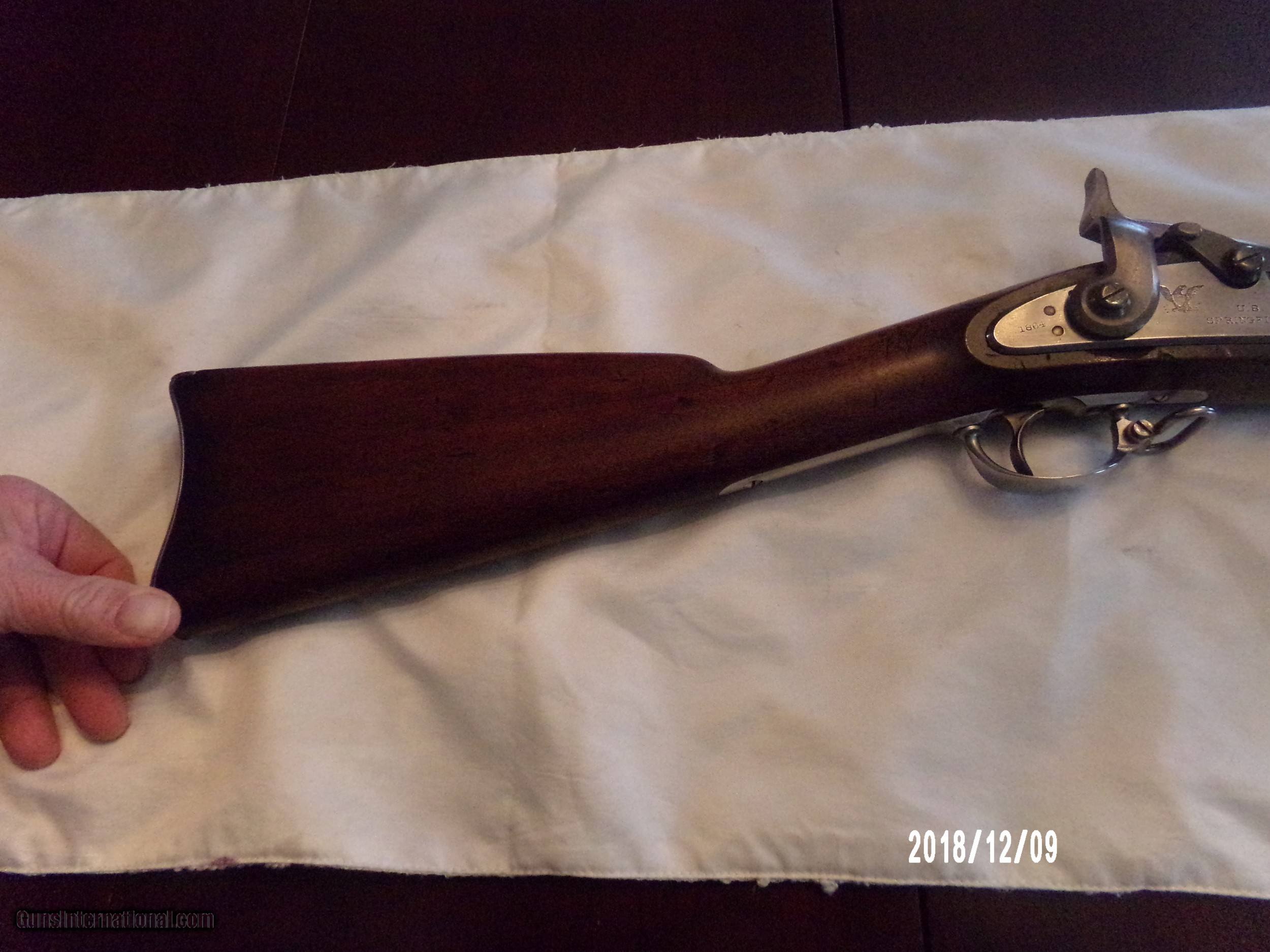 Description: Springfield 1866 2nd Allin conversion in fine plus Cond. Gun is 100% complete and original. Barrel, lock plate, barrel bands, and butt plate retain bright civil war finish. Bore is bright and clean with zero pitting. All metal parts have no pitting. Stock is great with a few scratches and dings and a chip under the lock plate. Stock has sharp unworn edges and two sharp cartouches on left flat. Original cleaning rod is like new. Hammer and trigger work like a charm. This historic gun has been well preserved and you would be hard pressed to find one better for the money. SOLD Antique: Yes |
