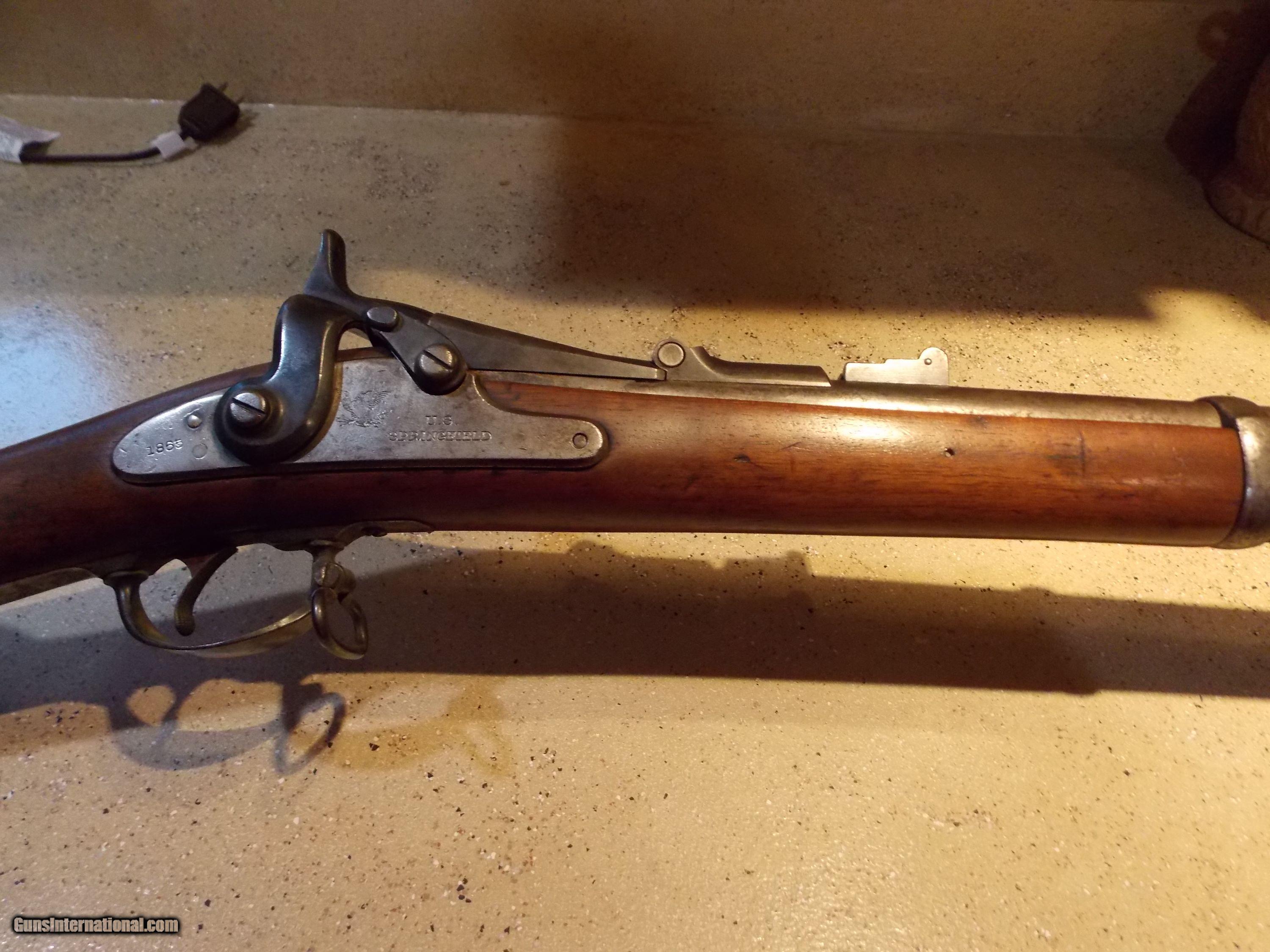 Description: Springfield 50 caliber 2nd Allin conversion in overall very good condition. Civil War musket altered to breech loader. This gun has a 32 inch barrel with 2 barrel bands that are properly spaced indicating armory alteration. All markings are sharp and clear. Hammer and breech retain 90% original finish. Barrel and bands are smooth but age stained and bore is near fine with a lot of sheen. Stock is fine with wood filled in where middle band was before alteration. In excellent working order. Selling at near my cost. SOLD Antique: Yes |