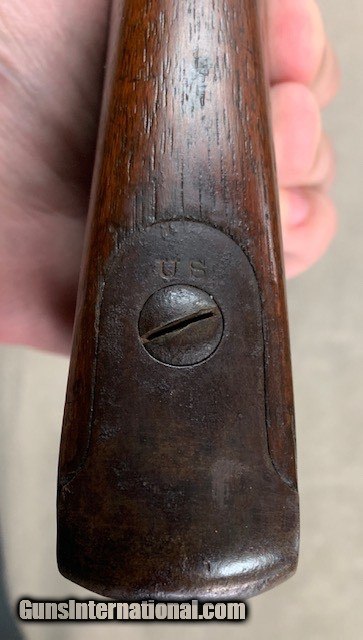 Description: A very nice overall condition Springfield Model 1873 Trapdoor Rifle in caliber .45-70 with bore that is not great but it is shootable and excellent original wood and metal finish overall. Barrel is 29.5 inches. US marked buttplate. Correct proofs on breechblock and lockplate - both dated 1873. A very nice representative piece but due to bore condition I don't think it will win any matches. SOLD Curio/Relic: Yes Antique: Yes |