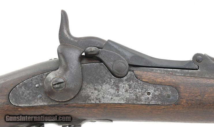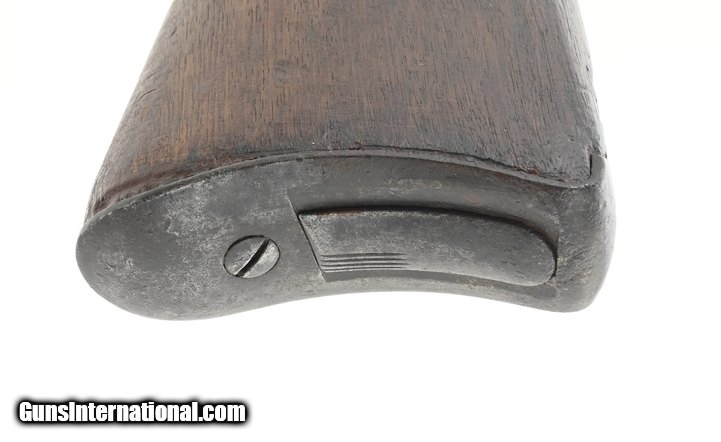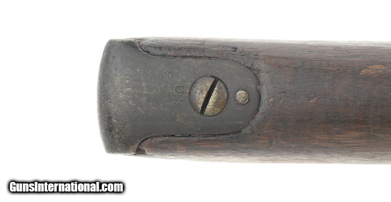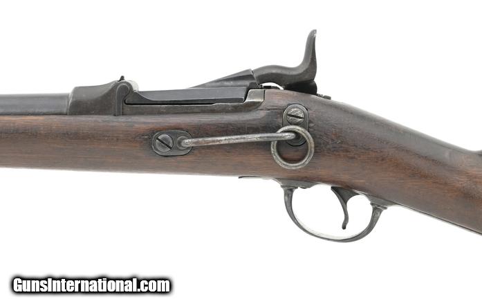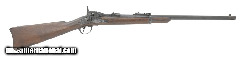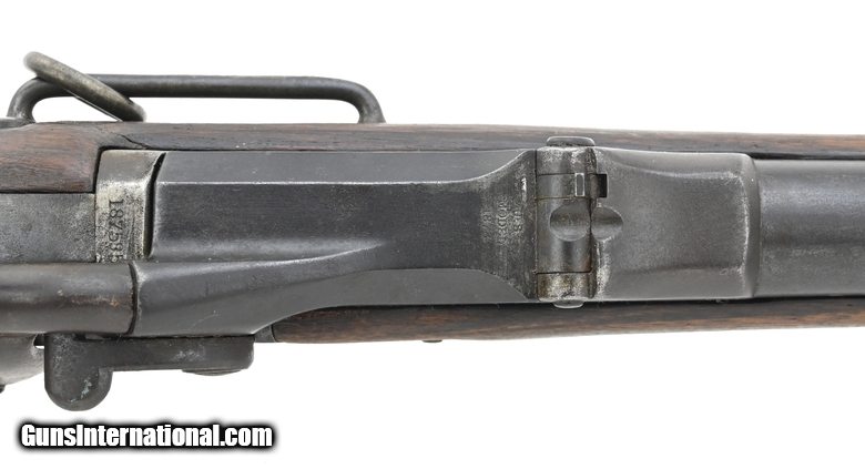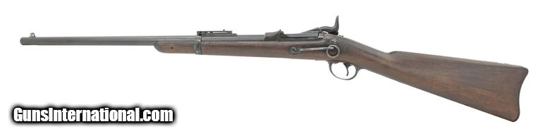Description: Springfield Model 1873 .45-70 caliber Trapdoor Saddle Ring Carbine. With 1884 upgrades. The overall length is approximately 41”. The 22” round barrel has a good bore with strong rifling and areas of light pitting. The barrel and action have a blue-brown patina. The lock is gray/brown. The US/Springfield is barely visible. The lightly sanded stock is good with a crack at the left forend tip. The barrel band has pitting at the edges. A correct 1884 Buffington carbine sight is present. The sling ring and bar are present. The action functions correctly. This is a good example of an Indian Wars carbine. SOLD Antique: Yes |