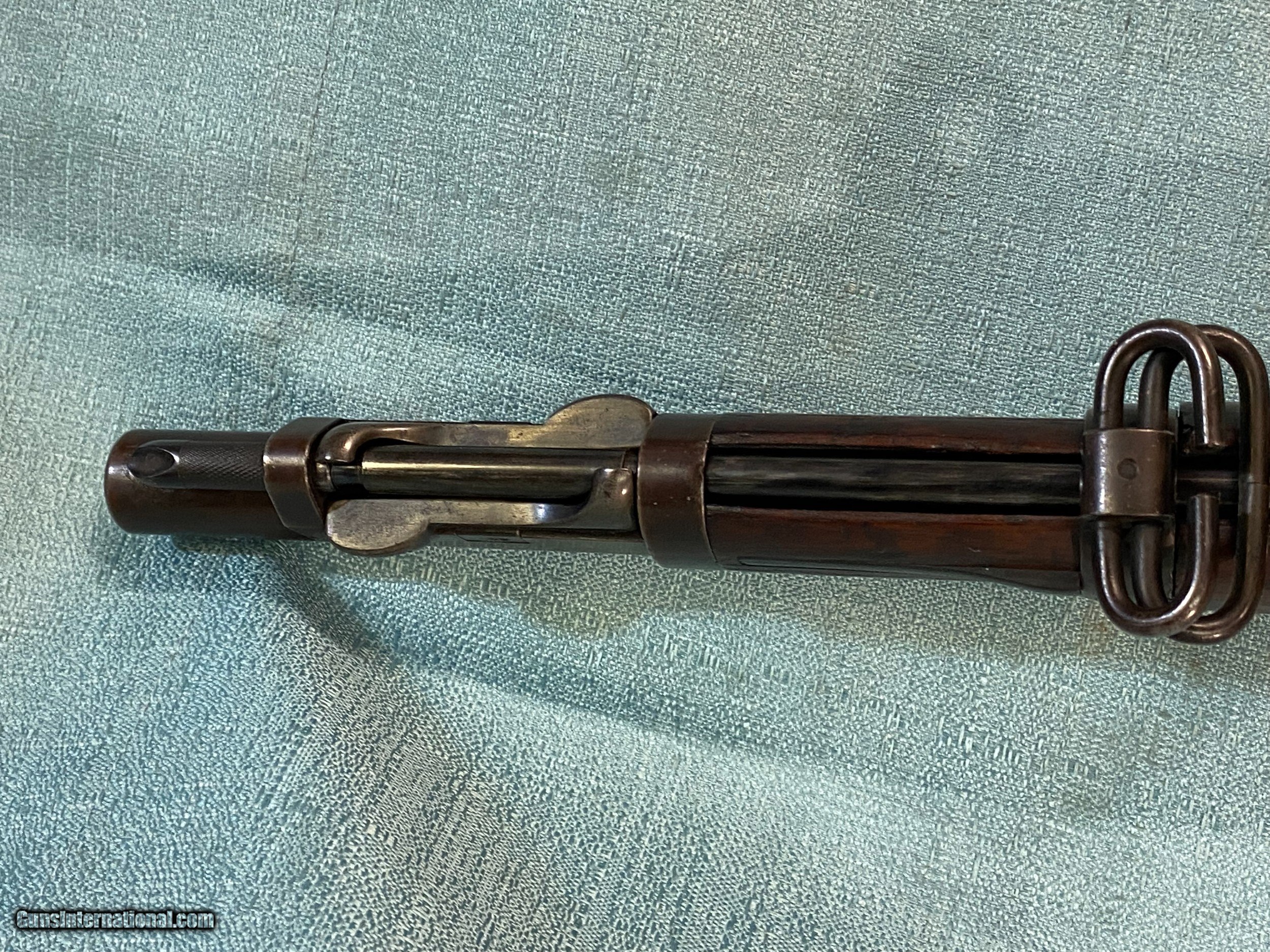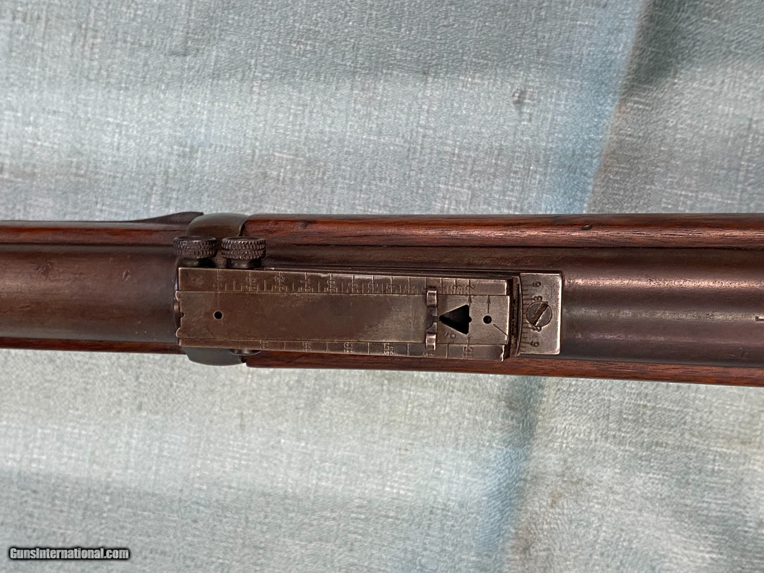 Description: This is a model 1894 Springfield Trap door in 45-70 govt with a ramrod spike bayonet. The bore is shinny and looks to make a good shooter. The Serial # places it being manufactured Jan-Mar of 1891 which matches the cartouche on the stock that is 1891. This trap door is in very good condition, there are some small dings in the barrel in front of the rear barrel band where it looks like the band was tapped with a tool during reassembly at some point can be seen in the pictures. The barrel has a nice blue brown patina. I personally really like the butt stock sliding cover on the "tool holder" instead of the thumb nail killing spring loaded round cover. Feel free to contact me if you need me to look at any particular item on the rifle that the photoes may have missed. Maine Residents add 5.5% sales tax Free Shipping Price reflects a 3.5% Cash discount (This discount is voided if a credit card is used.) Credit card, Check, or Money order accepted SOLD Curio/Relic: Yes Antique: Yes Rifle Caliber: .45-70 Government Manufacturer: Springfield Model: 1884 Serial Number: 515871 Barrel Length: 32.5 Condition: Very Good Metal Condition: Very Good Wood Condition: Very Good Bore Condition: Very Good Finish: Blued Manufacture Date: 1891 Extras: Ramrod Spike bayonet Item Location: Buxton Maine |