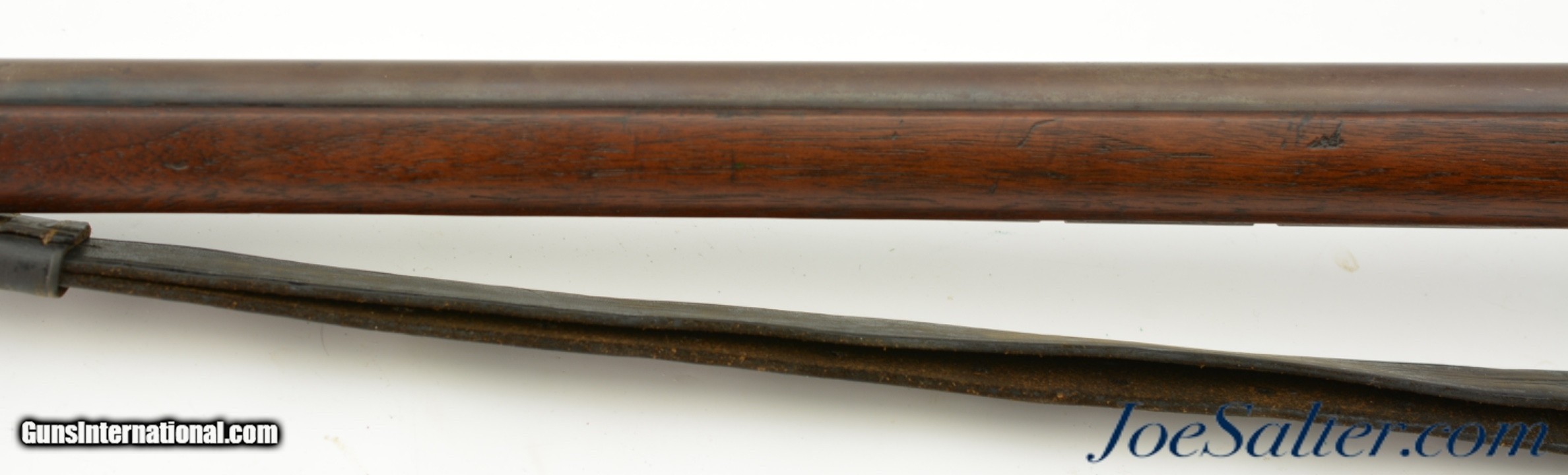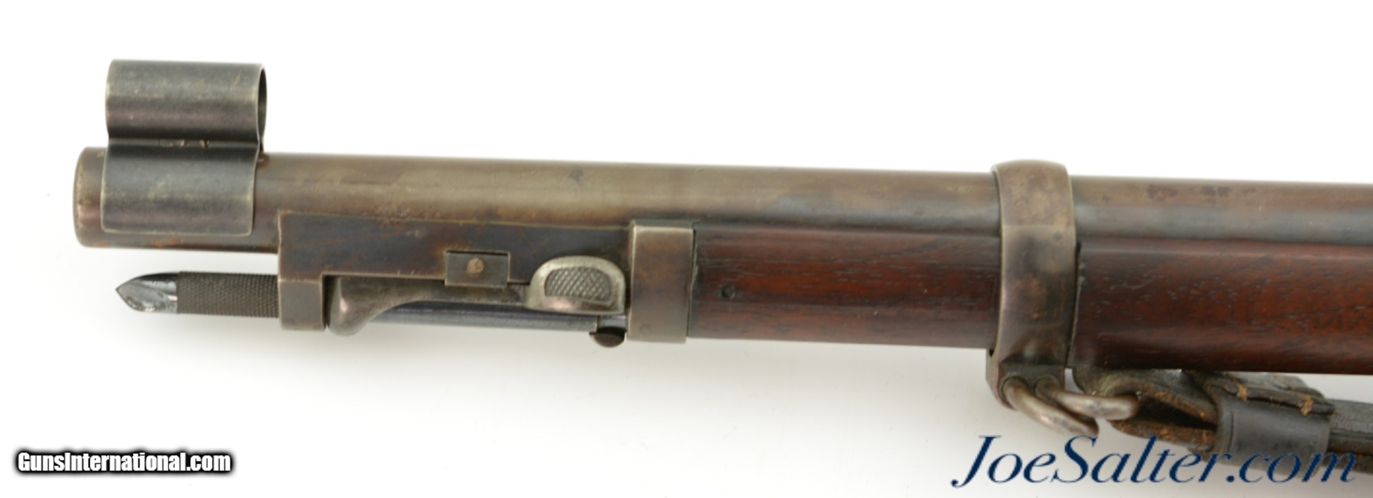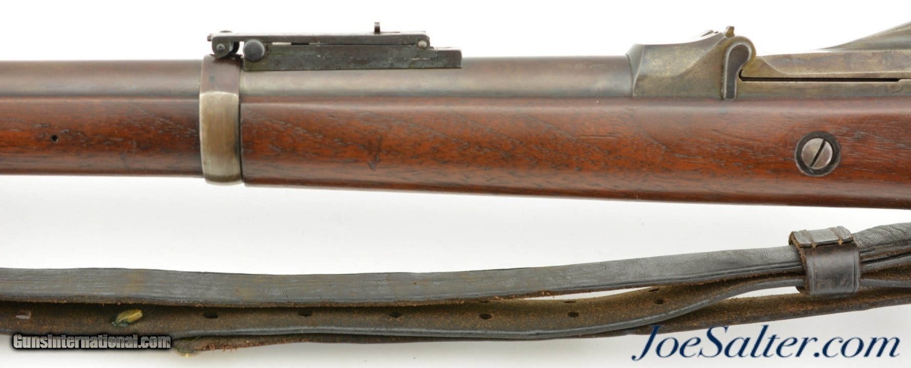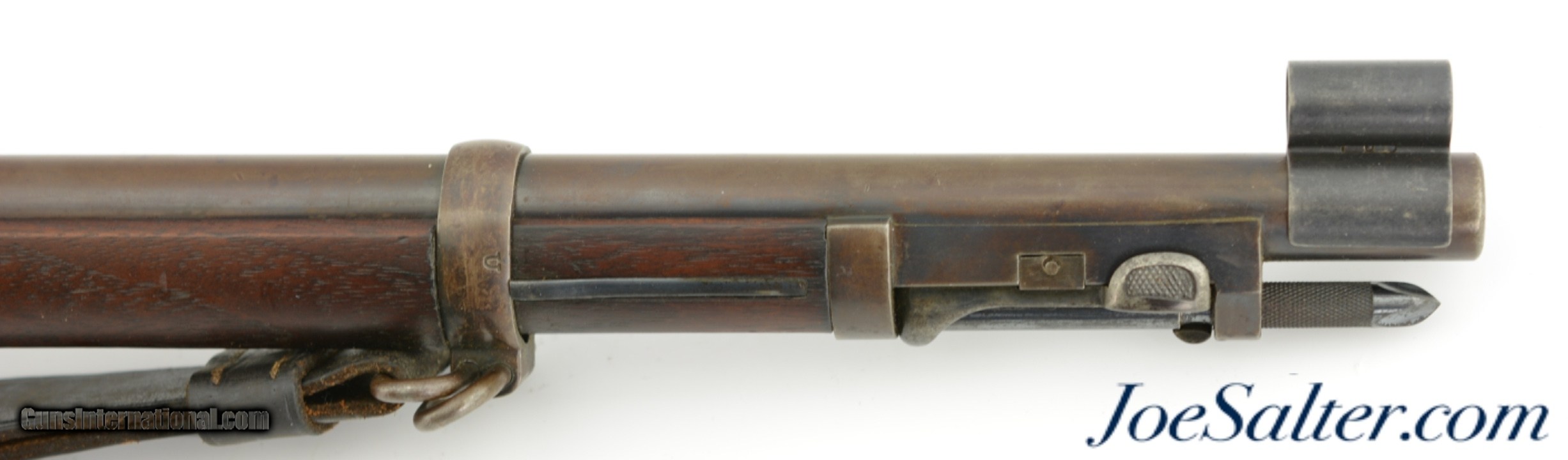 Description: Serial #562268, .45-70, 32 1/2" barrel with an excellent, bright bore. This ramrod bayonet-equipped rifle has retained 60-70% of the original blue, with most of the loss occurring on the barrel, which now has a smooth, mostly plum-brown patina. The receiver, and lock retain much of the original blue finish, with some light freckling around the edges of the lockplate. The 1884 dated breech block has most of the vivid original color case-hardening remaining. The walnut stock is in fine condition with some handling marks in the military oil finish, and a still crisp and legible "SWP/1890" cartouche on the left side of the wrist. The stock compartment contains both an original combination tool, and an original headless shell extractor. Additionally, the rifle is outfitted with both an original leather sling and front sight hood. This is an extremely nice Trapdoor that rates about fine overall. Antique; SOLD |