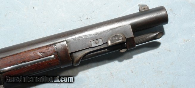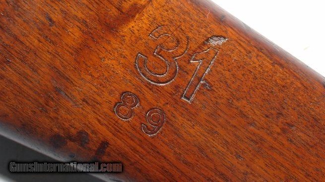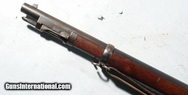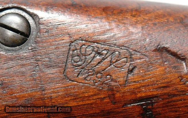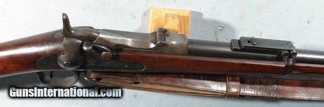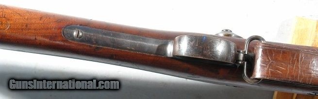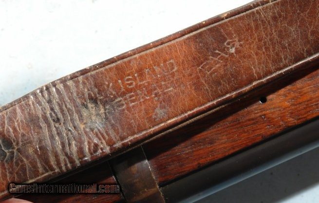 Description: SUPERIOR SPRINGFIELD U.S. MODEL 1888 RAMROD BAYONET TRAPDOOR RIFLE W/ORIG. ROCK ISLAND MODEL 1888 ONE PIECE SLING. 45-70 caliber. All original and excellent overall. 95% original blue on barrel, mounts and lock. Case hardened breech and barrel tang. Stock with the original finish and crisp “SWP/1892” cartouche. Regiment marked on butt “31/89”. Mint bore and perfect working order. Exceptional sling with nice “Rock Island” stamp and “E.H.S.” Ordnance Inspector’s stamp. Sling very hard to find and extra nice Model 1888. SOLD Antique: Yes |