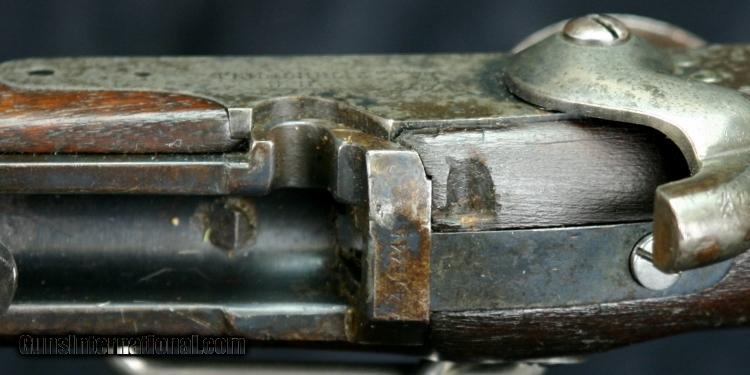 Description: .45-70, #415445, 22 inch barrel, strong rifling, plum blue overall, excellent wood, no cartouche, "George Horn-7th Cav Troop D" stamped on left side of stock under sling bar, '79 sight has "ears" filled down during period of use, 1st model hammer, high arch block. SOLD Antique: Yes |