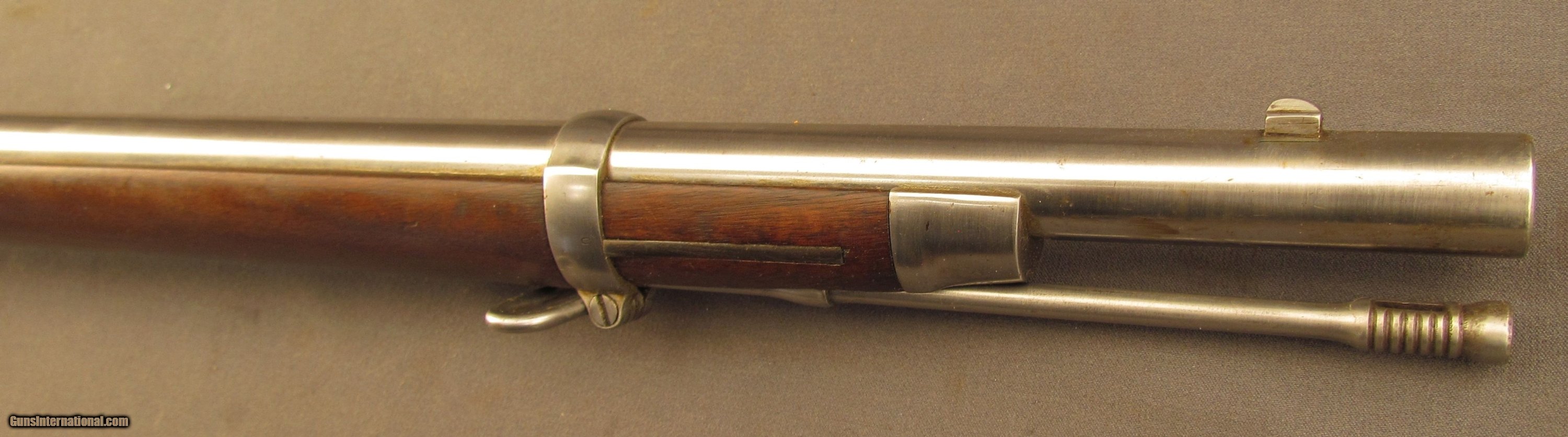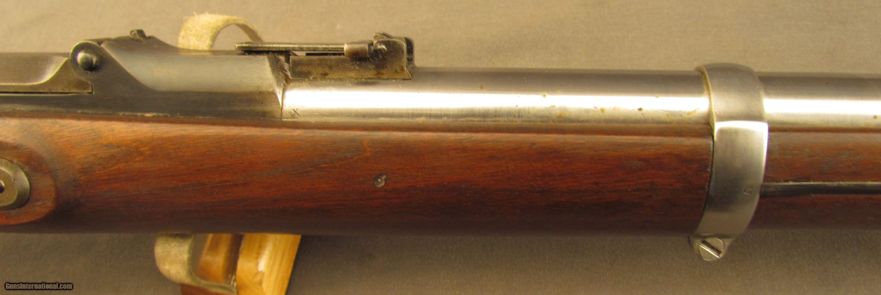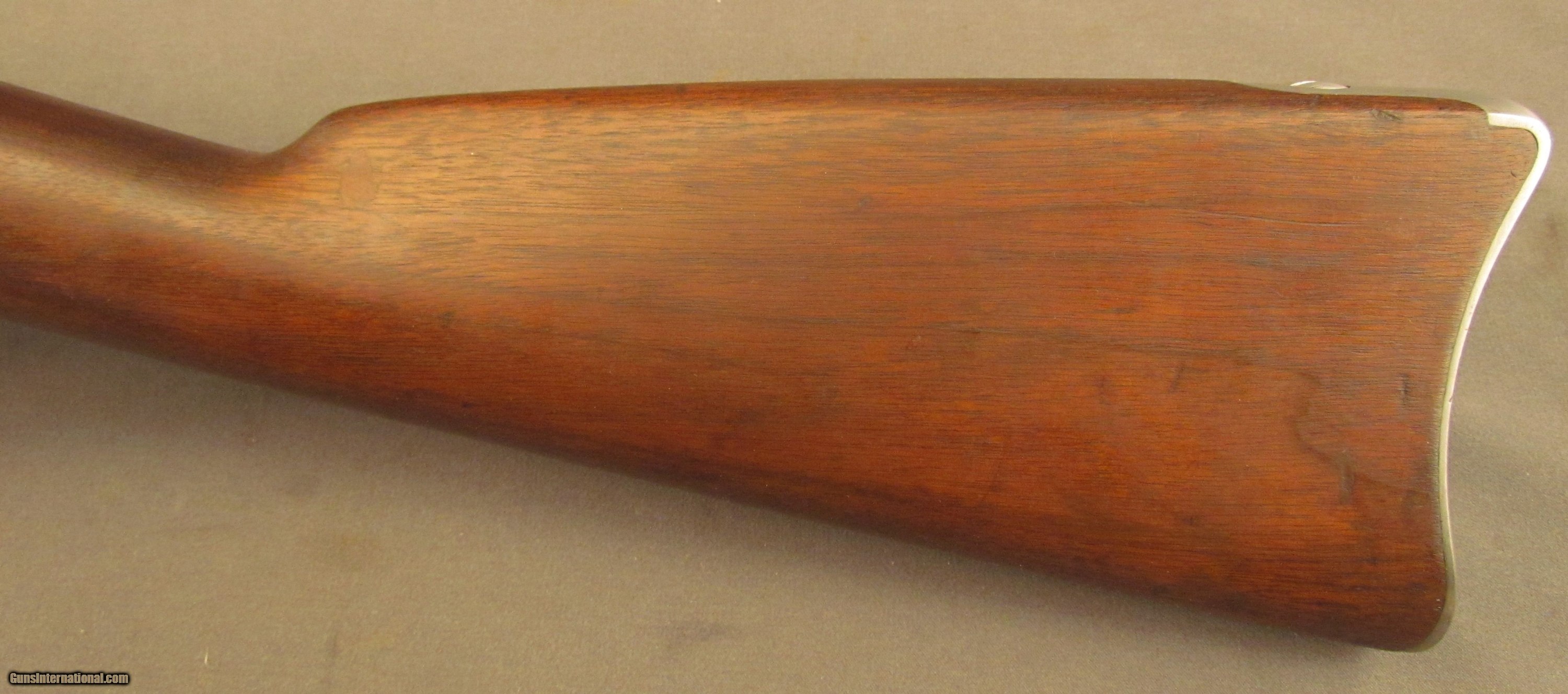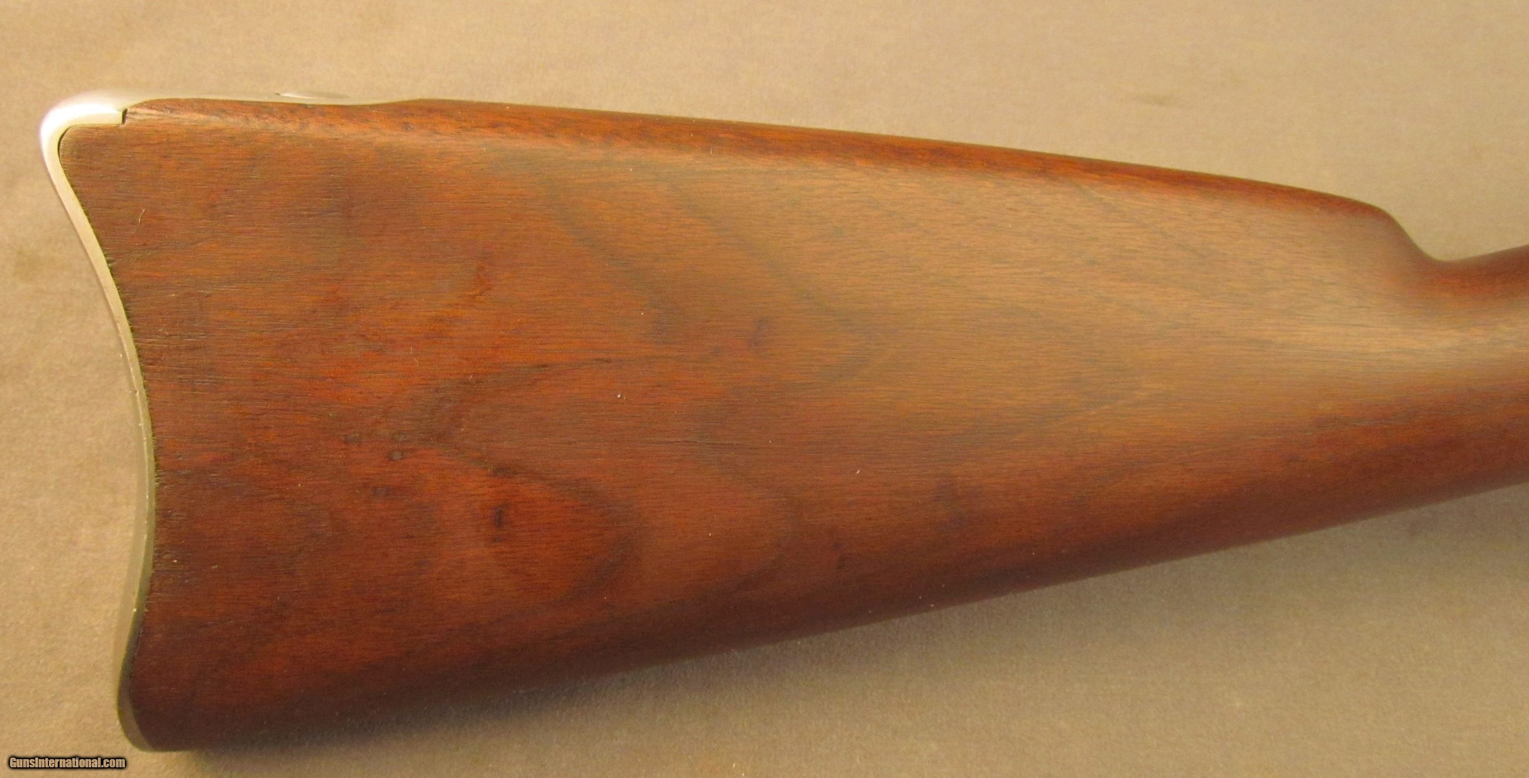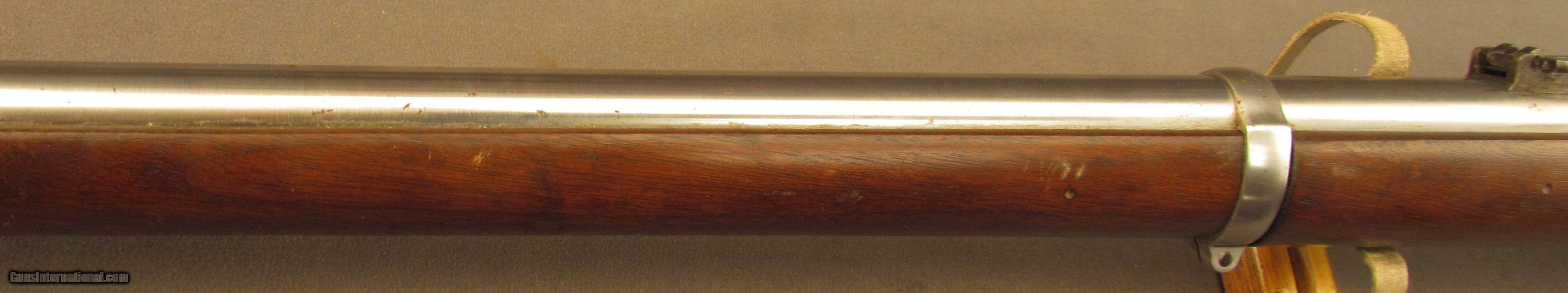 Description: Serial #8894, .50-70, 32 1/2" barrel with a fine, bright bore that has some light-medium freckling within the grooves at the muzzle. This rifle has an 1863 dated lockplate with the barrel and bands retaining an armory bright finish with traces of brown freckling along the wood border. The receiver and breech-block have visible original case-hardening with the balance faded to a rich, plum-brown patina. The serial numbers on the barrel and receiver are matching, the breech block lock-up is tight, and the action functions flawlessly. The walnut stock has an added oil finish over lightly cleaned wood and a few scattered minor surface marks and handling blemishes, including a small repair just ahead of the comb on the left side. The “ESA" inspector cartouche is faint, but still legible, and there is a small rack number stamp on the left side: “20". The rifle comes with a correct metal ramrod and is in fine condition overall. Antique SOLD Antique: Yes Manufacturer: Spfld Model: Trapdoor Serial Number: 8894 Caliber Info: .50-70 Gauge Info: .50-70 |