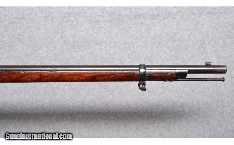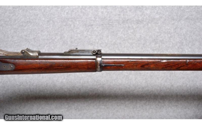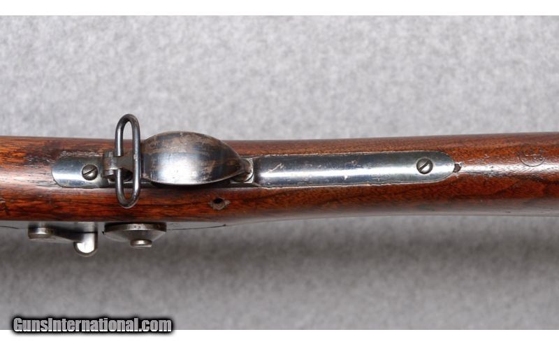 Description: U.S. Springfield Armory Model 1884 Trapdoor in .45-70 Government. 32 1/2" barrel with a square post and pinned blade front sight and rear Buffington sight with the correct R stamped on the sight leaf. There are two barrel bands, the one closest to the action is grooved at the top for the sight leaf to rest, the second sports sling swivels, and the trigger guard supports a sling swivel and has an extended tang. The top of the trapdoor is stamped "U.S./MODEL/1884", and the top of the metal butt plate is "US" stamped. The one piece walnut stock has a cartouche on the left side with three letters, "LWP" and the date, "1889", and the wood at the end of the extended trigger guard is stamped with a P inside of a circle. Metal Condition: There is considerable amount of blue remaing with some beginning to brown, and there are scratches and worn areas in the blue finish, and the barrel has small scratches and shallow dings. Wood Condition: There is an unusual round hole in the stock on the left side next to the trigger guard (see third photograph). It measures approximately 3/16" in width, 1/2" deep and is thread. Very odd! Also, there are a couple of very short age cracks in the stock and numerous scratches and dings, and a number of chips and gouges. Bore Condition: The bore is in very good condition with good lands and grooves and good shine, has just a light hint of frosting here and there. Manufactured: Circa 1886-1891 and serialized 465200. Please note: There are a total of 11 photographs for the rifle and all can be viewed and supersized at Cabela's Gun Library . SOLD Antique: Yes Manufacturer: Circa 1886-1891 - S# 465200. Caliber Info: .45-70 Government Metal Condition: Good with lots of blue. More info in "Description". Wood Condition: Good wood for age. More info in "Description". Bore Condition: Very good bore. More info in "Description". Barrels: 32 5/8" Barrel. Triggers: Single with grooves. Stock: Walnut. Stock Dimensions: 13 1/4" Length of pull. Butt Pad: Metal butt plate. Weight: 9 1/2 Lbs. Sights: Original front sight and Buffington rear sight. Item Location: Boise, ID |