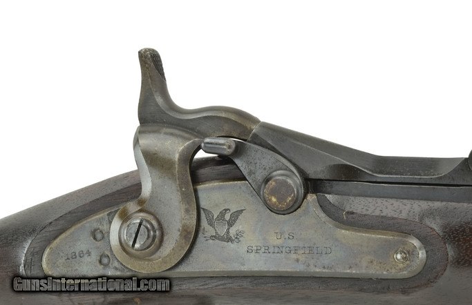 U.S Springfield Model 1868 Trapdoor .50-70 caliber rifle. Metal has areas of brown patina. Breech block and receiver is in the black. Lock plate has beautiful case coloring has dated 1864. Wood is good. Has two sharp cartouches, shows handling and storage marks. Butt plate does have surface pitting. Bore is good, bright with a few small areas of pitting and frosting.