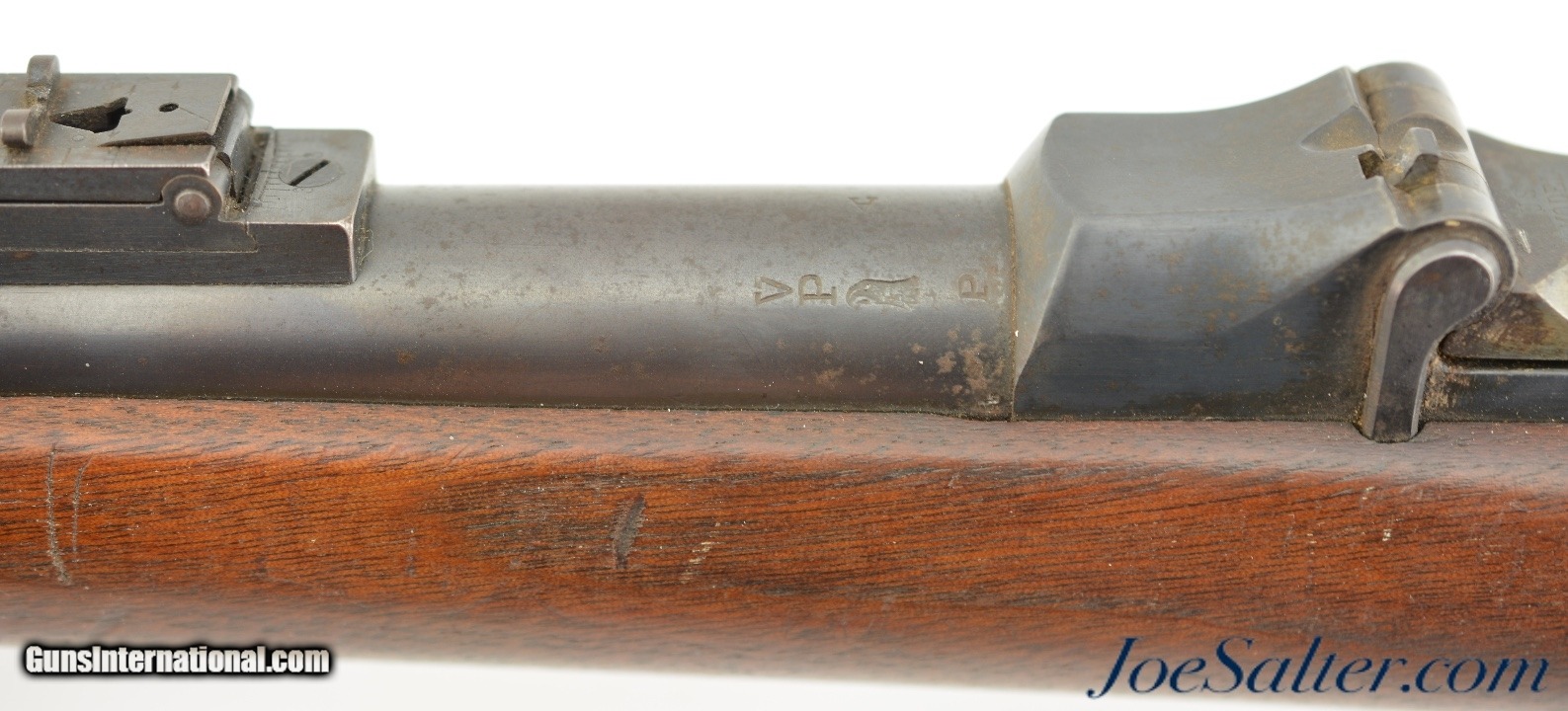 Description: Serial #231615, .45-70, 32 1/2" barrel with an excellent, bright bore. This is a handsome rifle that has a Model 1873/79 serial number, but Model 1884 breechblock and rear sight. The barrel and metal has retained 90-92% of the original blue on the barrel, receiver, lock, and hammer, with some mild fading present at the muzzle and thin freckling throughout. Further areas of plum-brown freckling are present on the trigger guard as well. The breechblock has bright original color case-hardening, especially on the underside, with brown freckling about the top surfaces. The Buffington rear sight is intact, but the bottom edge of the slider is slightly bent. The walnut stock is in fine condition with minor handling marks and surface blemishes scattered about the otherwise fine military oil finish, and a crisp "SWP/1889" cartouche is present on the left side of the wrist. This is a very nice Trapdoor that rates fine-near excellent overall. Antique SOLD |