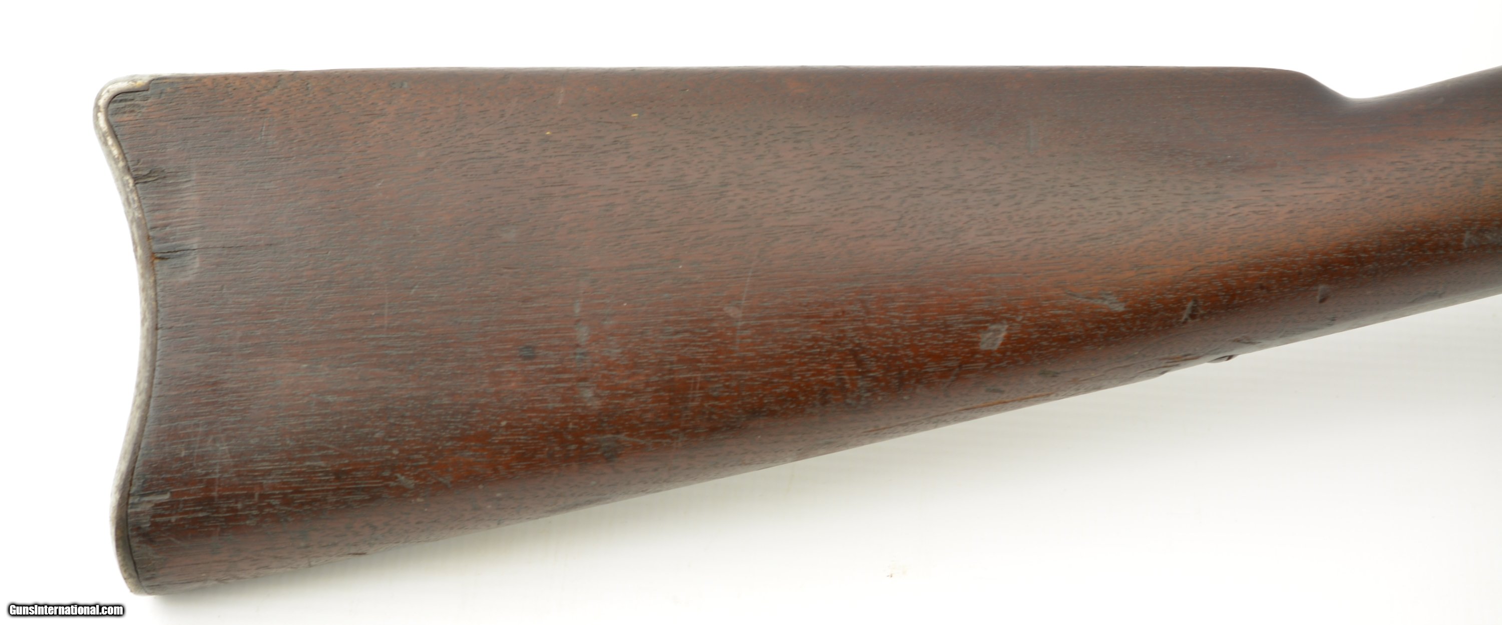 Description: Serial #236459, .45-70, 32 1/2" barrel with a fine, bright bore that has some minor freckling along its length. This rifle has an 1873 dated, low-arch breech, and has retained about 75-80% of the original blue on the barrel with some fading and freckling at the muzzle, as well as on the high edges and projections of the 1873 rear sight. The breechblock and receiver have traces of original color case-hardening remaining, along with a mottled patina which that over onto the lock and hammer (original color case-hardening is present on the underside of the breechblock). The ramrod and barrel bands likewise have some of their original blue finish, with the balance of the metal having turned to a freckled plum-brown. The three-click lock is tight and functions flawlessly. The walnut stock has kept its original military oil finish with a crisp, “SWP / 1883" cartouche and minor handling marks and bruises scattered throughout the wood. This is a very nice, representative example of a U.S. Trapdoor rifle, and is in fine plus overall condition. Antique SOLD Antique: Yes Manufacturer: Spfld Model: Trapdoor Serial Number: 236459 Caliber Info: .45-70 Gauge Info: .45-70 |