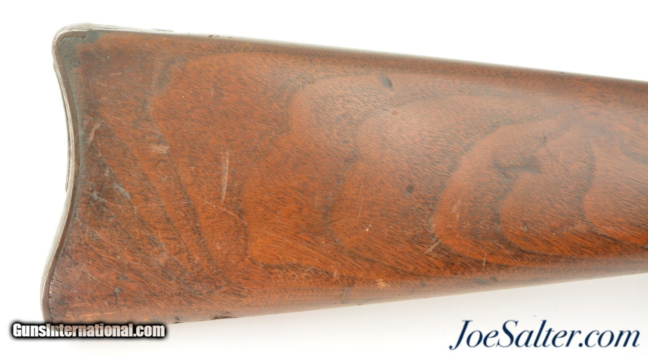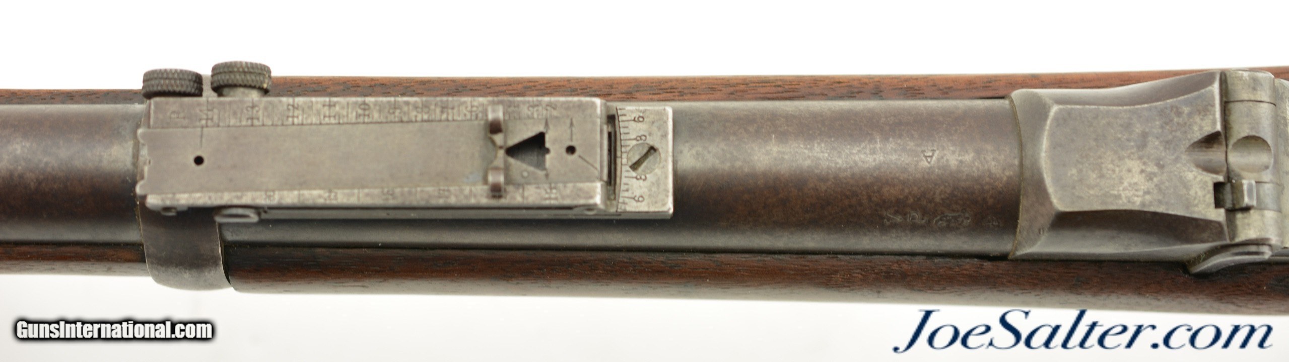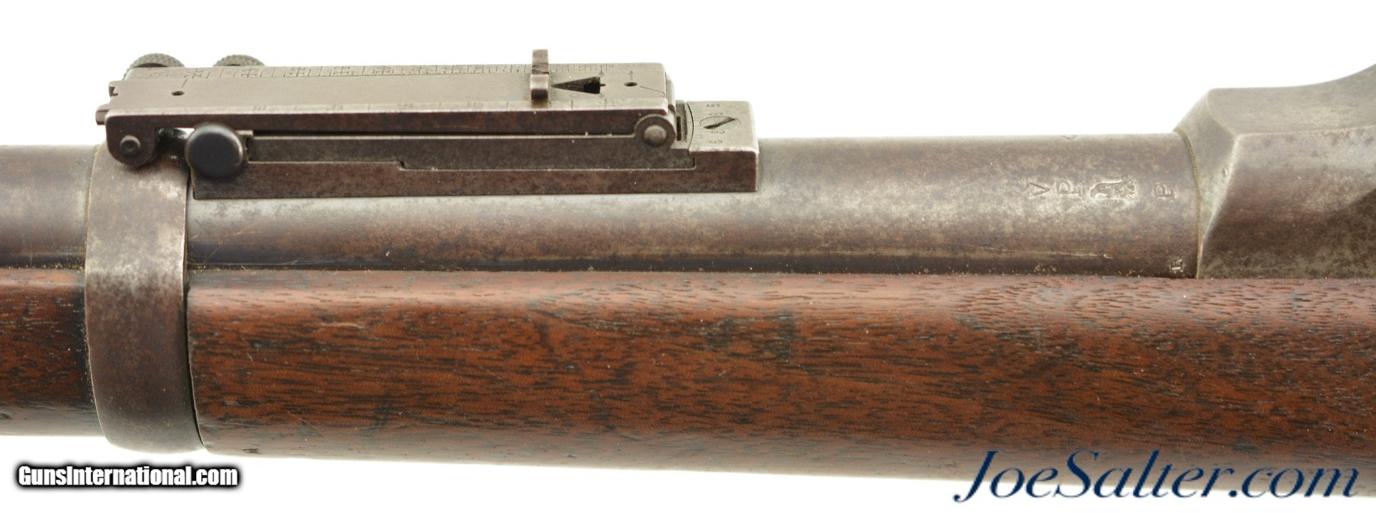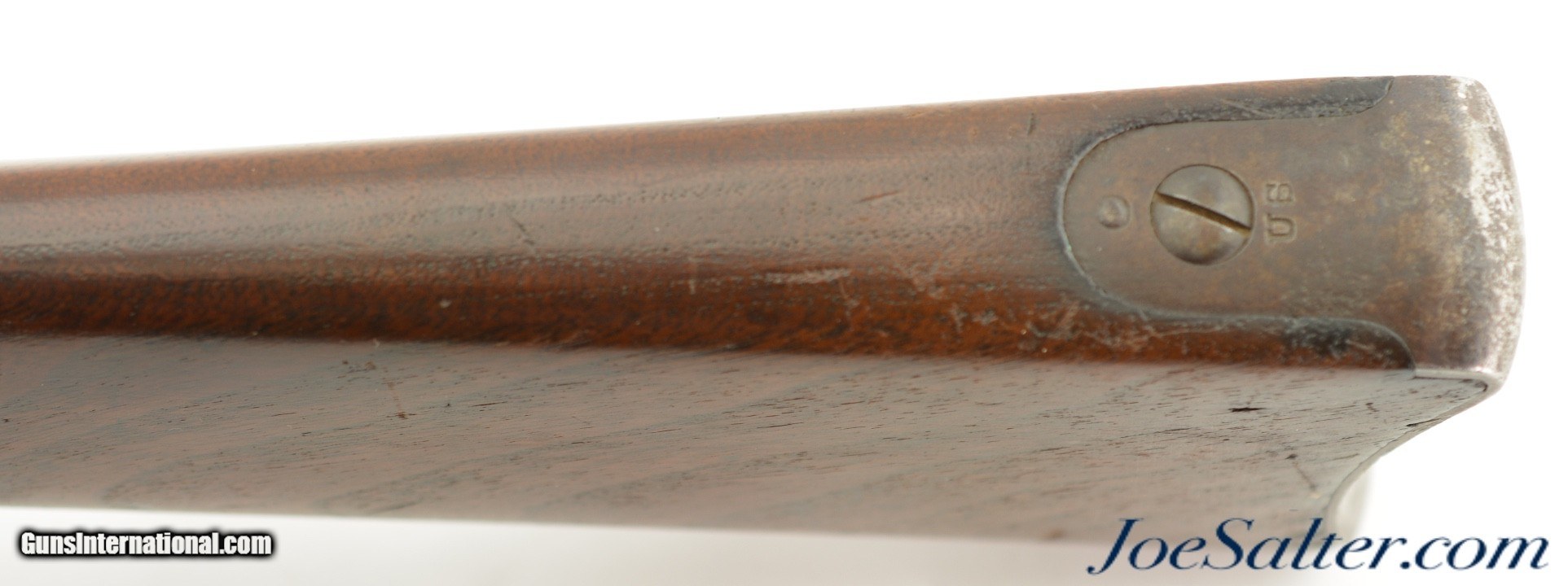 Description: Serial #561174, .45-70 Gov’t., 32 1/2" barrel with a very good bore that has mild freckling within the grooves. This late model Trapdoor has an overall plum-brown patina along the barrel, with a slightly more mottled gray on the receiver, bronze firing pin-equipped breechblock, and lock. Some faint traces of original blue can still be seen on protected areas, and traces of the original oil-quenched color case-hardening are still present on the underside of the breechblock, with mottled freckling on the top surfaces. A newer, untarnished brass front sight blade is installed, and a correct Buffington rear sight is present. The walnut stock rates very good with numerous small handling marks and surface blemishes scattered throughout the reapplied military oil finish. The "SWP / 1888" cartouche is faint, but still legible on the left side of the wrist. This is a nice looking Trapdoor, and is in good-very good condition overall. Antique; Antique: Yes Price: $850.00 Contact Seller |