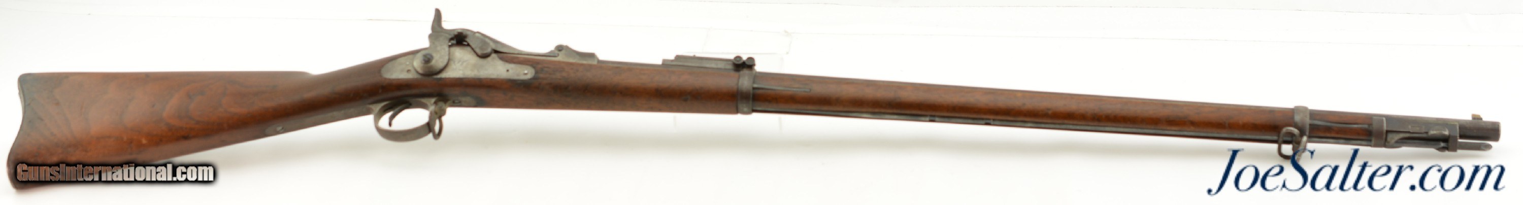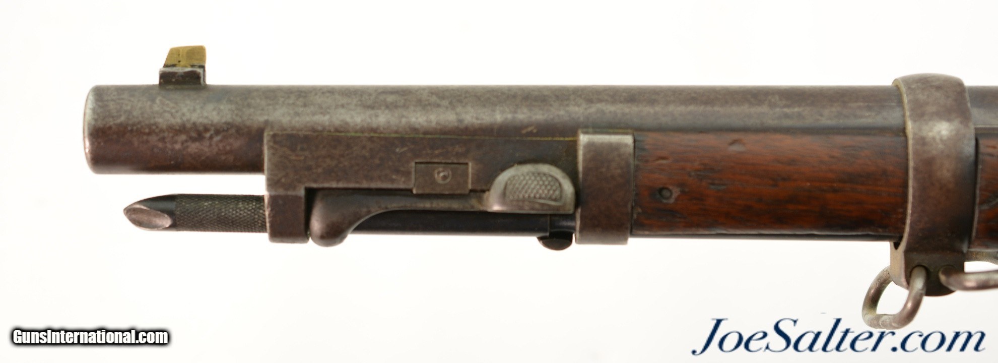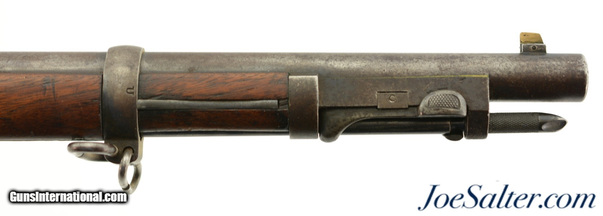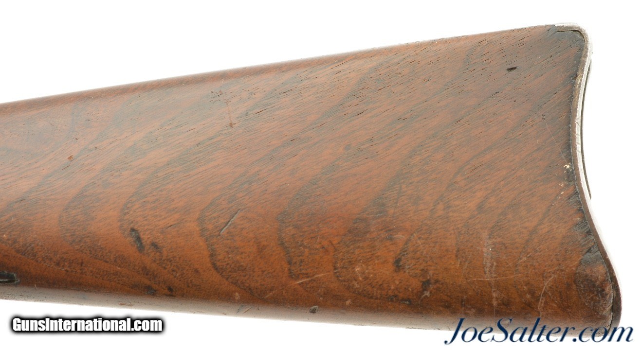 Description: Serial #561174, .45-70 Gov’t., 32 1/2" barrel with a very good bore that has mild freckling within the grooves. This late model Trapdoor has an overall plum-brown patina along the barrel, with a slightly more mottled gray on the receiver, bronze firing pin-equipped breechblock, and lock. Some faint traces of original blue can still be seen on protected areas, and traces of the original oil-quenched color case-hardening are still present on the underside of the breechblock, with mottled freckling on the top surfaces. A newer, untarnished brass front sight blade is installed, and a correct Buffington rear sight is present. The walnut stock rates very good with numerous small handling marks and surface blemishes scattered throughout the reapplied military oil finish. The "SWP / 1888" cartouche is faint, but still legible on the left side of the wrist. This is a nice looking Trapdoor, and is in good-very good condition overall. Antique; Antique: Yes Price: $850.00 Contact Seller |