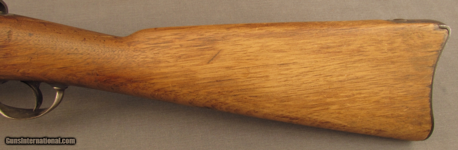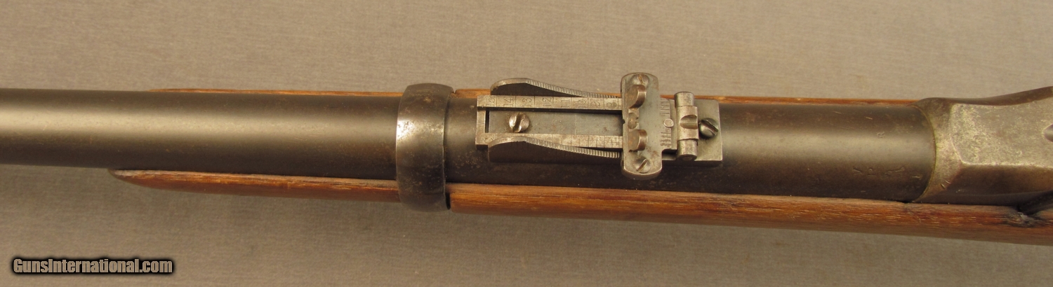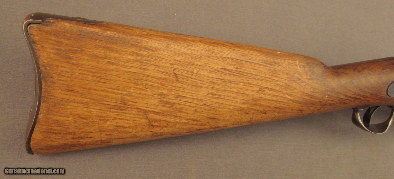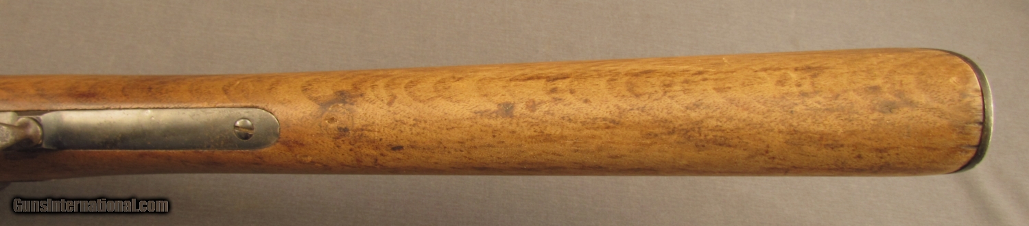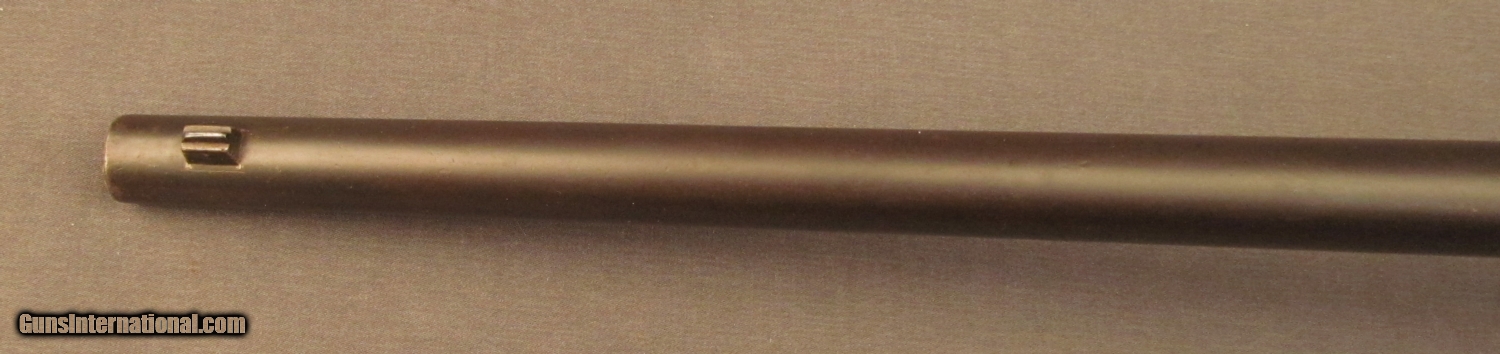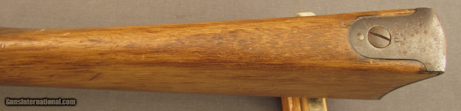 Description: Serial # 127573, 45-70, 22” barrel with a mostly very good bright strong bore that has a small patch of moderate pitting near the muzzle and some fine pitting forward of this spot. This early (1880 manufactured) carbine has an “US/MODEL/1873 marked low arch breechblock, 3 click tumbler and the lock is marked “EAGLE/US/SPRINGFIELD” Stock has a compartment in the butt for cleaning rods and the sliding door buttplate is marked “US”. Saddle ring and bar left side. Rear sight is properly marked “1-6 & C” left side base and “8-15 & C” on the ladder. Metal surfaces are blued, fading and thinning to a blue/gray patina with scattered light rust spots and pinprick to fine pitting. Stock has been sanded with no visible cartouche and a faint circle P proof. ANTIQUE SOLD Antique: Yes Manufacturer: Spfld Model: Carbine Caliber Info: .45-70 Gauge Info: .45-70 |