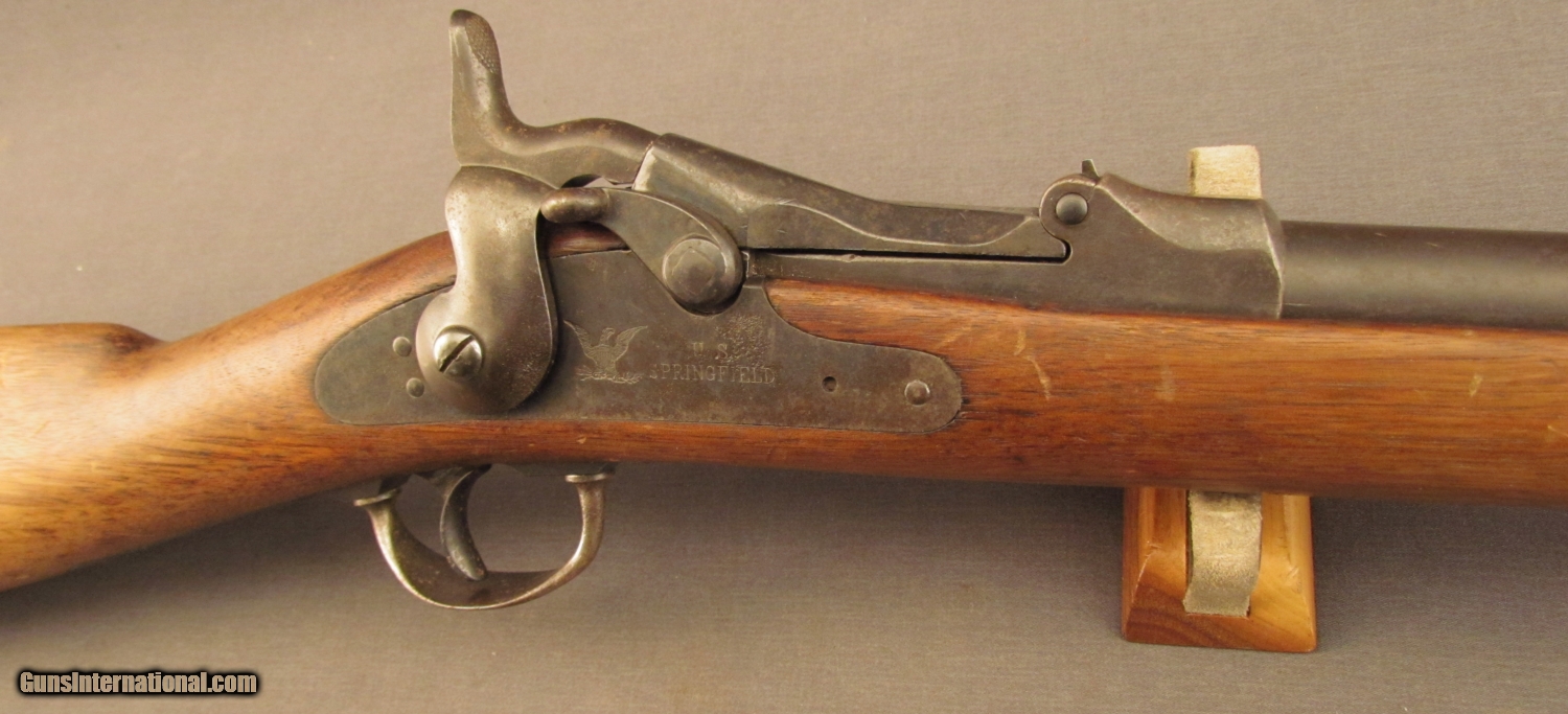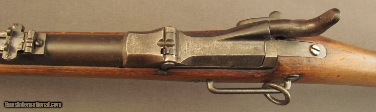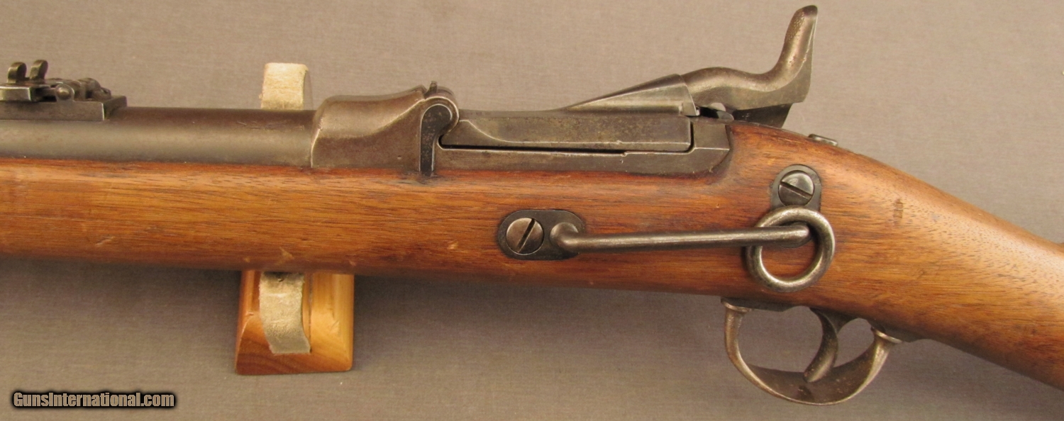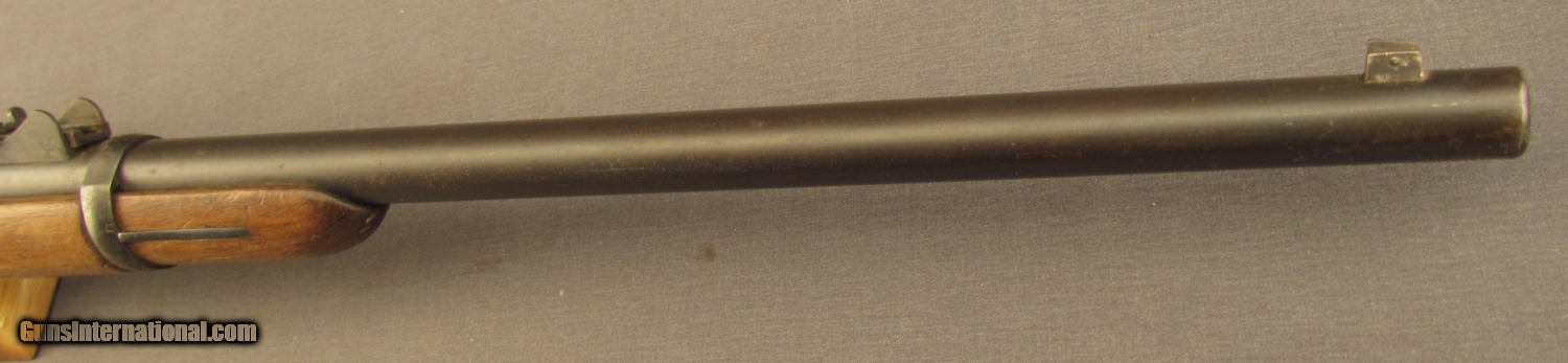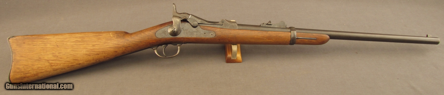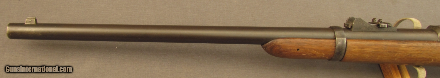 Description: Serial # 127573, 45-70, 22” barrel with a mostly very good bright strong bore that has a small patch of moderate pitting near the muzzle and some fine pitting forward of this spot. This early (1880 manufactured) carbine has an “US/MODEL/1873 marked low arch breechblock, 3 click tumbler and the lock is marked “EAGLE/US/SPRINGFIELD” Stock has a compartment in the butt for cleaning rods and the sliding door buttplate is marked “US”. Saddle ring and bar left side. Rear sight is properly marked “1-6 & C” left side base and “8-15 & C” on the ladder. Metal surfaces are blued, fading and thinning to a blue/gray patina with scattered light rust spots and pinprick to fine pitting. Stock has been sanded with no visible cartouche and a faint circle P proof. ANTIQUE SOLD Antique: Yes Manufacturer: Spfld Model: Carbine Caliber Info: .45-70 Gauge Info: .45-70 |