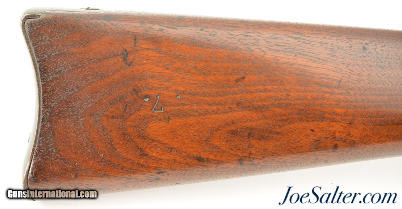Description: Serial #270439, .45-70, 32 1/2" barrel with a fine, bright bore that has a partial ring of mild pitting a few inches back from the muzzle. This is a handsome trapdoor rifle, the so-called "Model 1879" variant, that has retained some of the original blue on protected areas, but has a smooth, plum-brown patina on the balance. The 1873-dated breech block has a mottled gray-black patina with some original color case-hardening still present on the underside. The walnut stock is in fine condition with some scattered small handling marks and bruises in the reapplied military oil finish, and a clear "SWP/1884" cartouche on the left side of the wrist. Additionally, there is a repaired diagonal crack through the forend just behind the nosecap. The rifle has a correct ramrod, and is fitted with a period leather sling that has some minor crazing and flaking, but is still serviceable. This is a very good-near fine example of a desirable Trapdoor variation. Antique SOLD Antique: Yes |