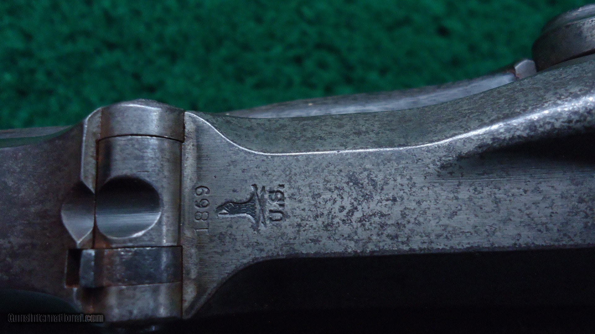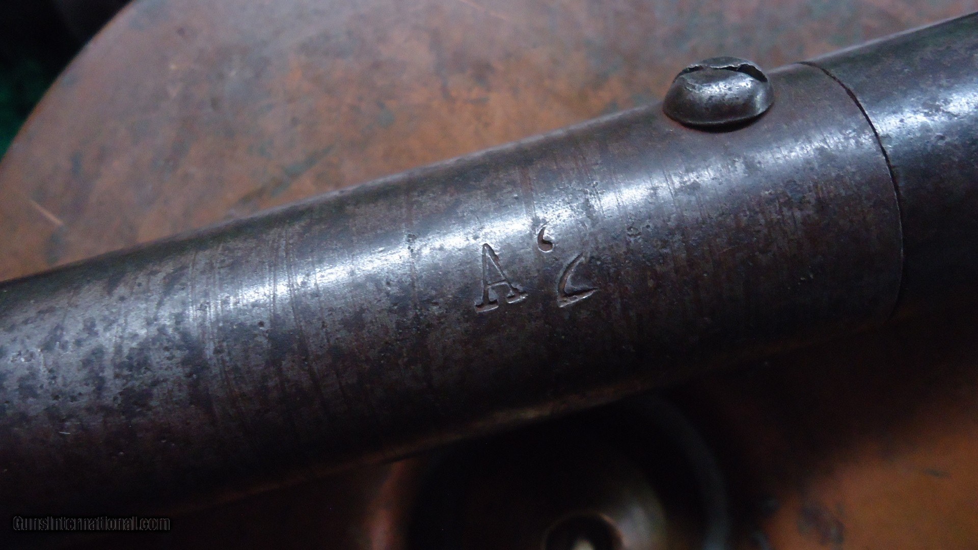 Description: 5300 serial range. I believe this is the only time I have seen a trapdoor converted to a line throwing gun. They have used just about anything for line throwing guns. Wood shows a fair amount of use and has an age crack coming back from the lock plate. It is pinned and is sound and solid. The metal is a brown patina with traces of case color on the lock and plum/brown on the barrel. Mechanically fine. Comes complete with a six inch projectile that goes over the barrel that you tie your line through. These are usually lost. I don't think I have ever had one before. It matches the condition of the gun being a plum/brown color. It also has a copper spool of line. The plate on it says " Remove This Cover And Shoot End Of Line In Center". Comes complete with a device for locking it down. A very interesting scarce old item. Leroy Merz Antique Firearms specializes in antique and vintage Winchesters and other fine American firearms. Since 1965 Mr. Merz has taken part in the world of firearms and has been a contributor to many well known reference books. We have hundreds of additional guns in every price range at our home online. Search for Merz Antiques in google. SOLD Antique: Yes |