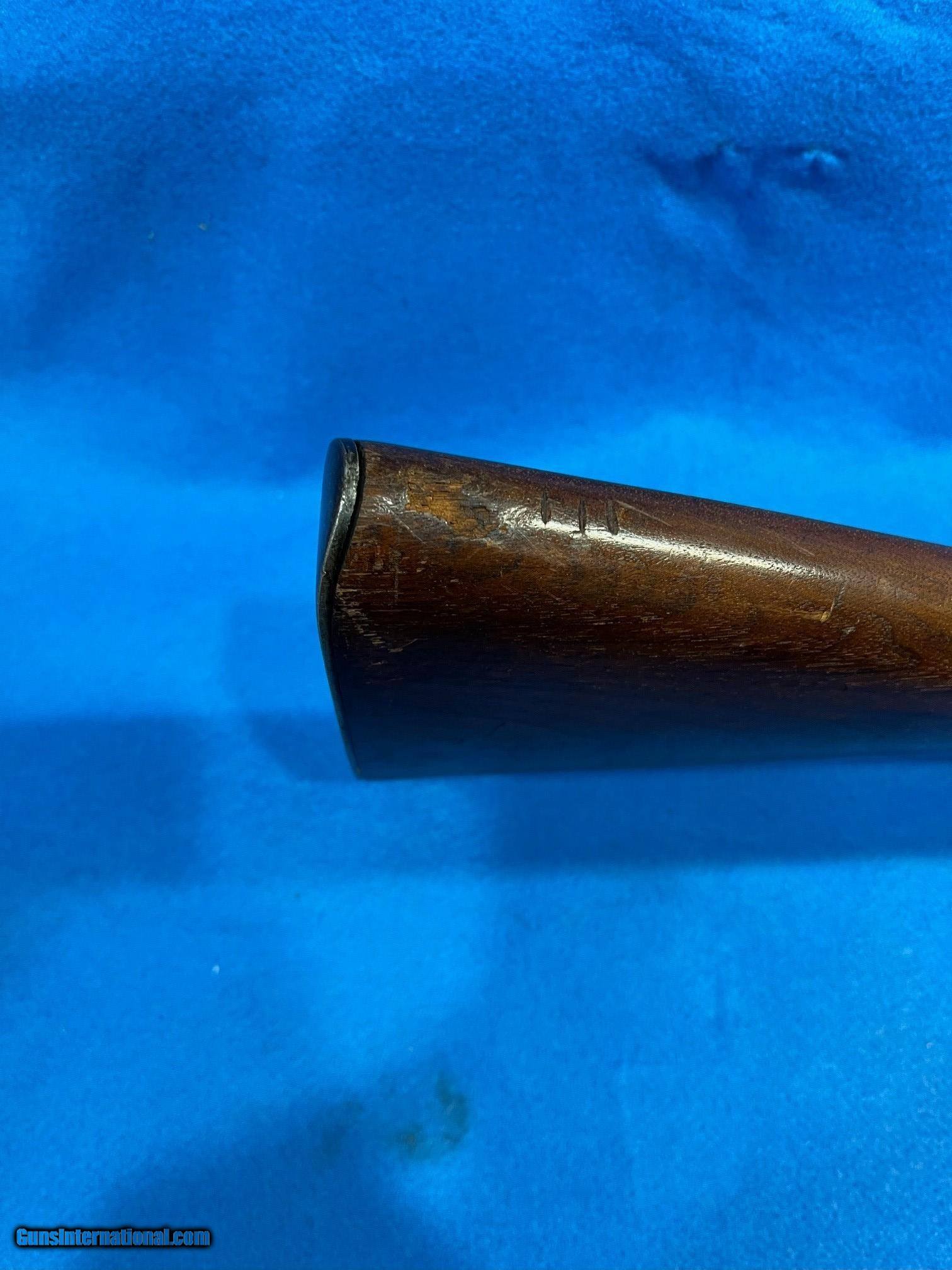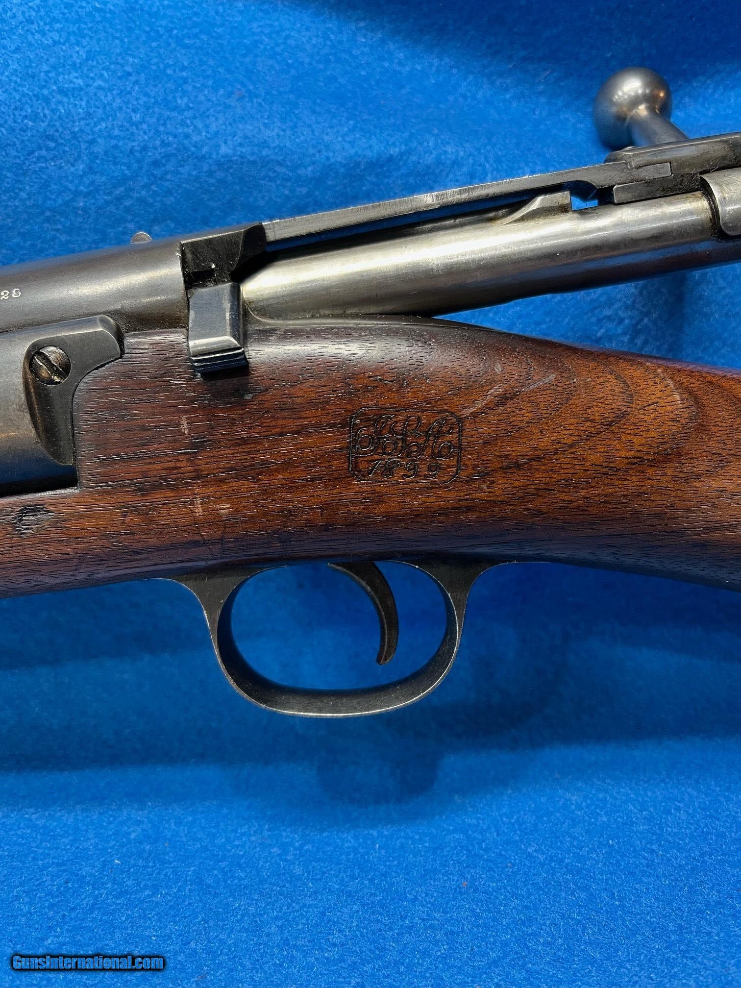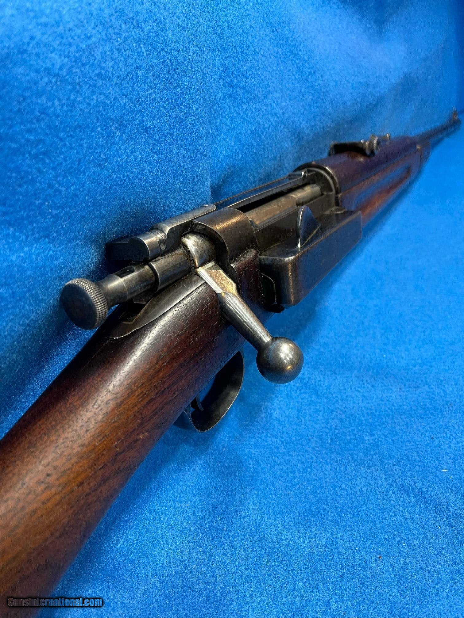 Description: AWESOME: U. S. SPRINGFIELD "KRAG" MDL 1899.CARBINE. CAL. .30-40 KRAG. SER. 3229828 AWESOME IS LITERALLY THE WORD FOR THIS "ARSENAL QUEEN. IT HAS RETAINED ABOUT 95-96% OF THE ORIGINAL ARSENAL BLUE. THE LITTLE LOSS THERE IS, IS DUE TO SHARP EDGE SILVERING AND FADING FROM BEING TUCKED AWAY IN AN ARSEANAL OR SIMILAR FOR 123 YEARS. THERE ARE NO RUST PATCHES, RUB MARKS OR SCRATCHES. ALL PARTS ARE ORIGINAL TO THE GUN INCLUDING THE THE REAR SIGHT WHICH IS CORRECTLY STAMPED "C" FOR CARBINE". THE STOCK AND FOREARM HAVE RETAINED ABOUT 90-95% OF THE ORIGINAL FINISH. THERE ARE NO SPLITS, DENTS OR SCATCHES ANYWHERE. THE LEFT SIDE OF HAS THE SPRINGFIELD CARTOUCHE/ "1899", THE PISTOL GRIP, THE PROPER "CIRCLE P" AND INSPECTOR'S STAMP. THE BOLT HANDLE, SLIDE RAILS, BOLT FACE, MAGAZINE FOLLOWER AND FEED RAMP SHOW ONLY THE VERY SLIGHTEST IF ANY USE. THE IS BORE IS VERY BRIGHT WITH SHARP CRISP RIFLING. THIS "ARSENAL QUEEN" WOULD SATISFY EVEN THE MOST CRITCAL COLLECTOR. IT SHOULD EASILY EARN A PRIME SPOT IN ANY COLLECTION. INVESTMENT PRICED AT.... $1695.*** **THE HARMLESS WHITE CRAYON IS TO SHOW THAT ALL MARKINGS ARE CORRECT. IT IS EASILY REMOVED WITH LIGHTER FLUID AND A BRUSH. WE WILL DO IT ON REQUEST. *** 100% OF THE GUN'S PRICE IS SATISFACTION GUARANTEED. . SOLD Rifle Caliber: .30-40 Krag |