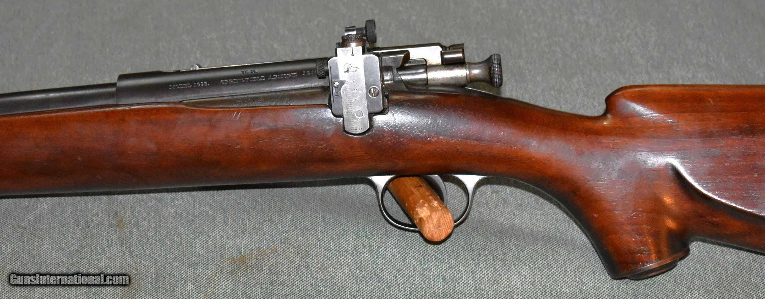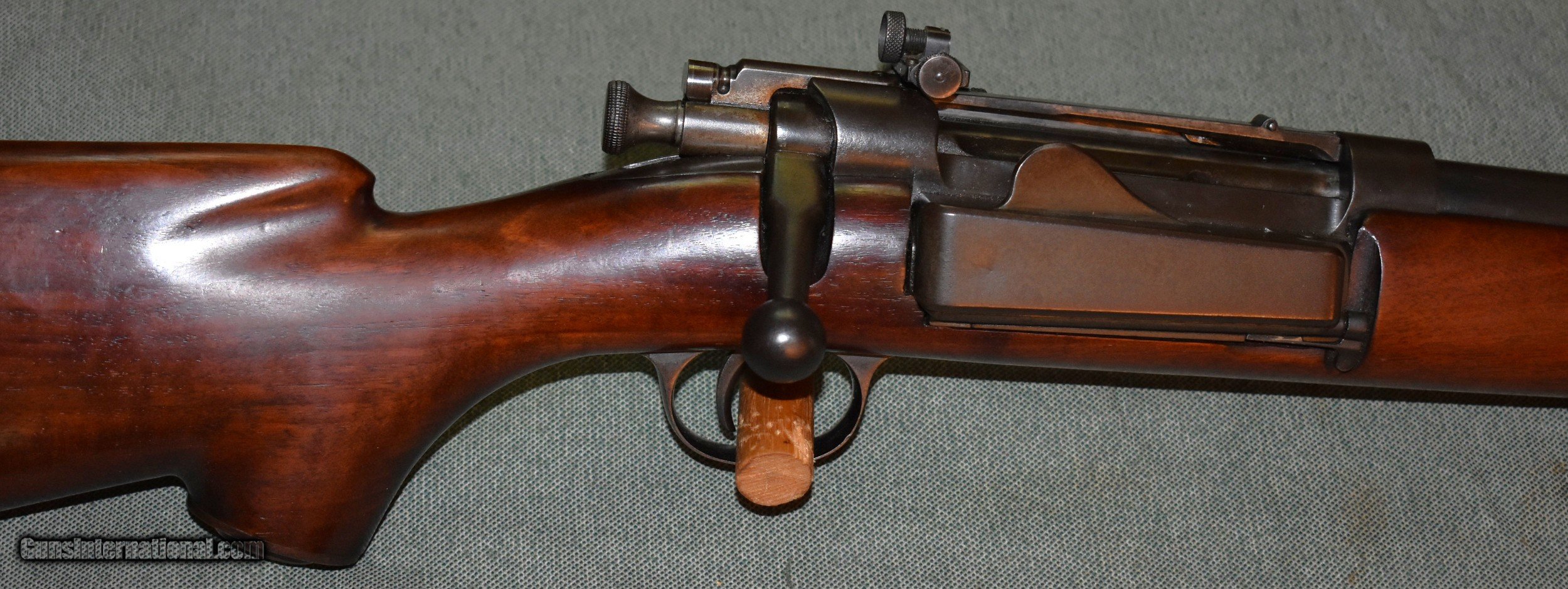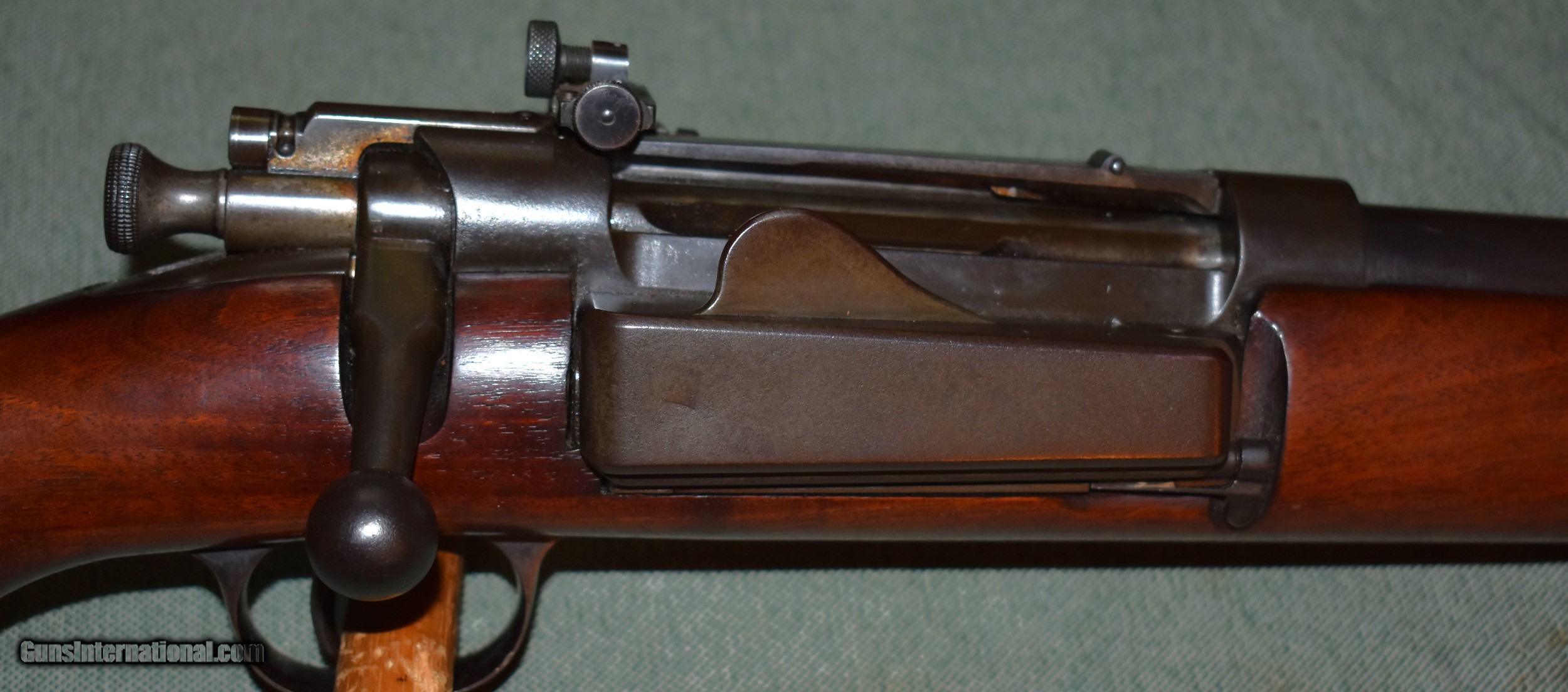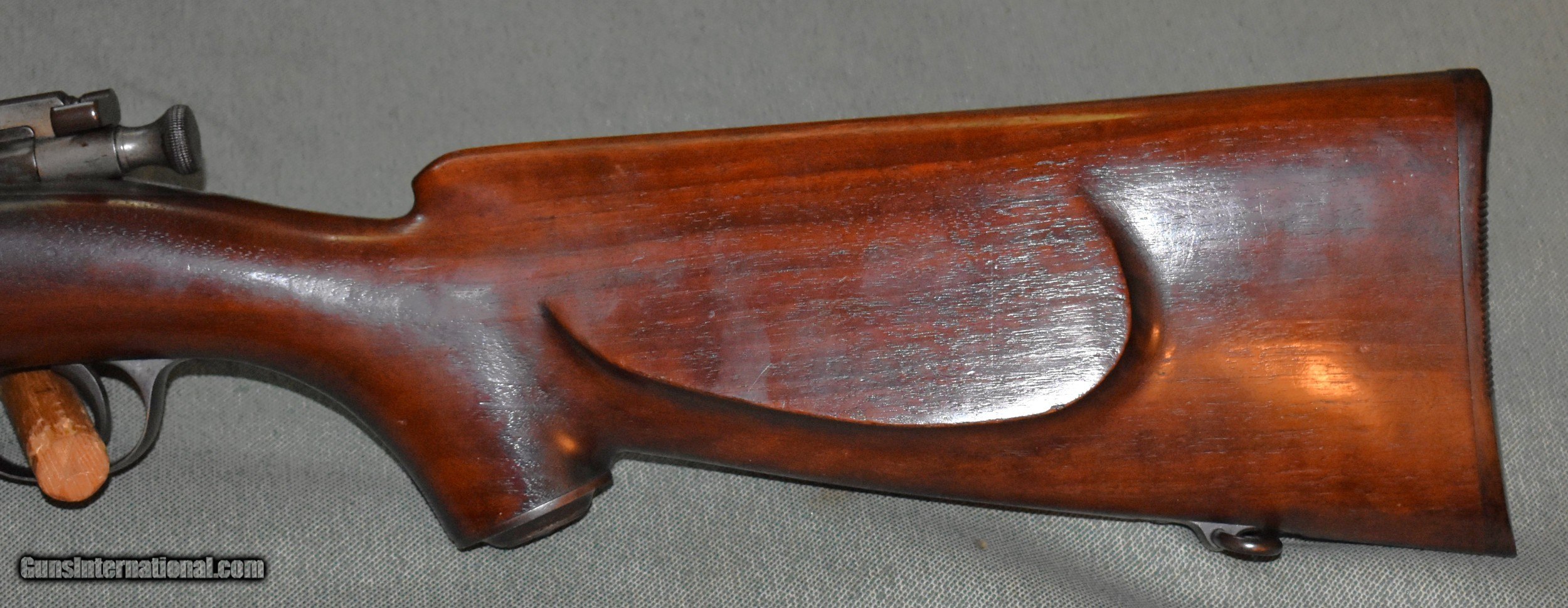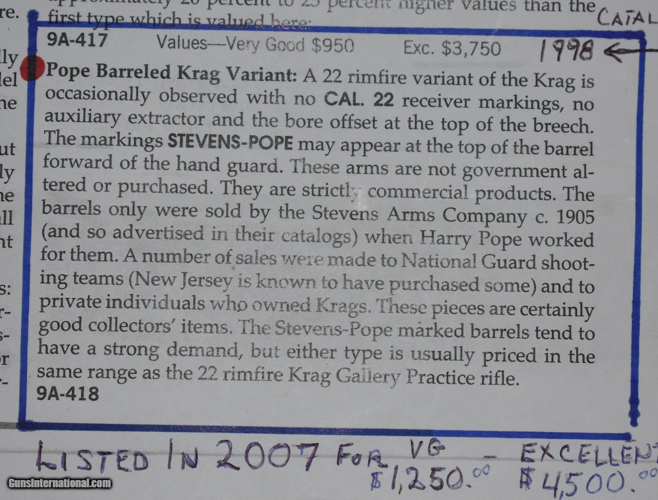 Description: Extremely rare Krag Jorgensen 22 caliber Gallery Practice sporter with a Stevens-Pope barrel. The barrel is 22" and has a mint bore. The rifle is in excellent condition retaining 95% of the original blue and wood finishes. It has a Lyman rear peep sight and Lyma target front sight. In 45 years of collecting,this is the only one like it I have seen. Note the article in the photos from Flaydermans 1998 catalog that tells a little about these rifles. They were appartently built for commercial sales to clubs,national guard teams, or owners of Krag rifles.A fine addition to any collection. C&R eligible. SOLD Rifle Caliber: .22 Long Rifle Manufacturer: Springfield Armory Model: Gallery Practice Barrel Length: 22 Condition: excellent Metal Condition: excellent Wood Condition: excellent Bore Condition: mint Barrel Type: Stevens-Pope Action: Bolt Butt Pad: Factory Buttplate Manufacture Date: 1905 |