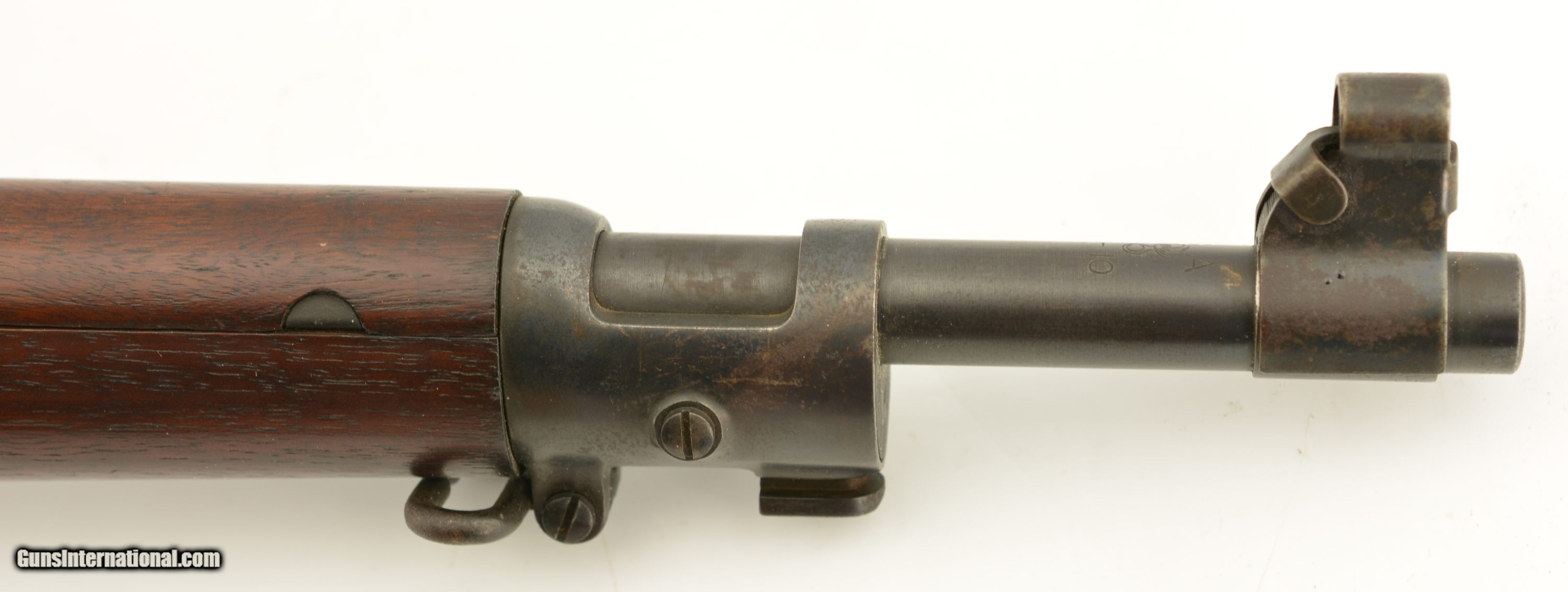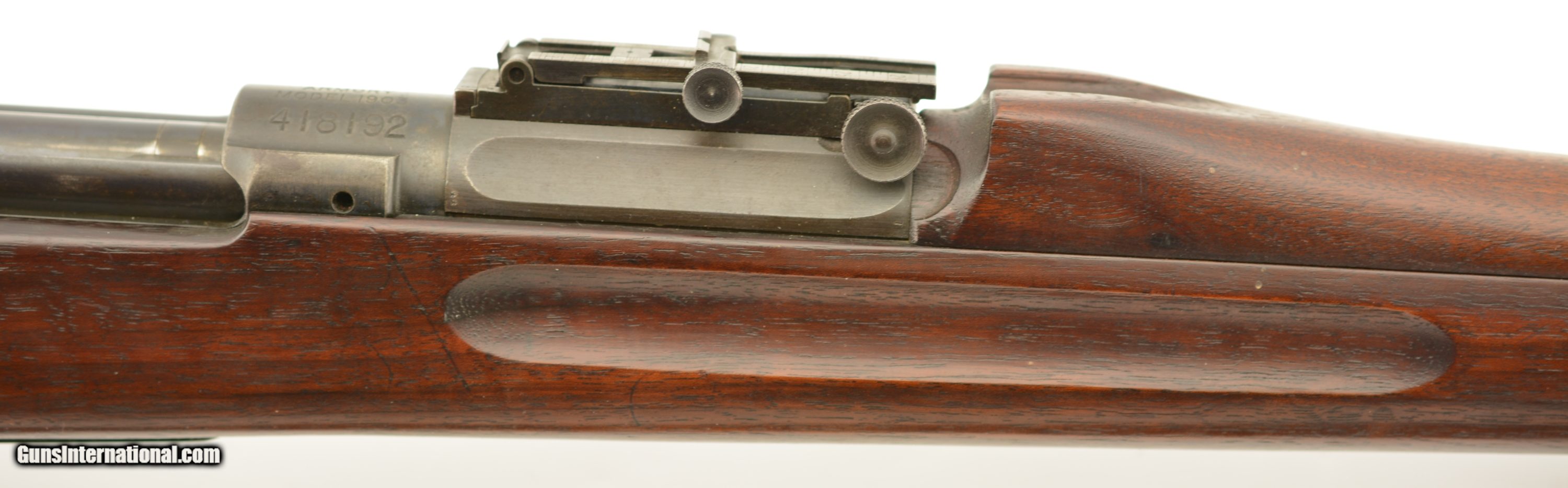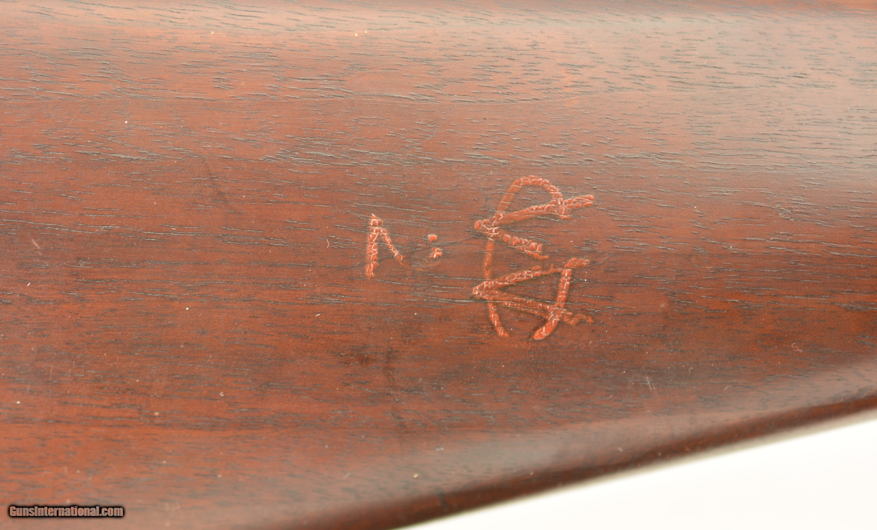 Description: Serial #418192, .30-06, 24" barrel with an excellent, bright bore. This is a 1910-manufactured rifle that has a 3-10 dated, “SA" barrel, and retains about 92-95% plus of the original blue on the receiver and barrel with some mild silvering at the muzzle and some dark gray fading along the top radius and rear of the receiver. Some further small spots of fading are present on the bearing surfaces of the bolt body and on the straight handle. The walnut stock and handguard have an excellent original oil finish with crisp “J.F.C." cartouche, and a stenciled, unit marking and number on the right side of the buttstock (“C/W" or “O/W" over “2"). There are some scattered minor handling marks and blemishes throughout but they are very mild and do not detract from the otherwise excellent wood. An original sheet metal front sight hood is installed, a well-worn "WDC" stamped M1907 leather sling is fitted, and an original nickel steel oiler is present in the stock trap. This is an excellent 1910 spec. '03 that would make a fabulous addition to any collection. FFL or C&R SOLD Curio/Relic: Yes Manufacturer: Spfld Model: 1903 Serial Number: 418192 Caliber Info: .30-06 Gauge Info: .30-06 |