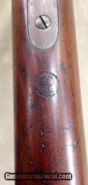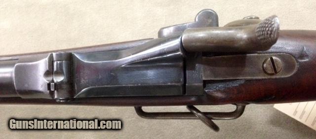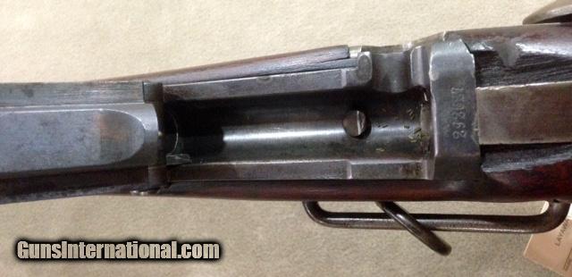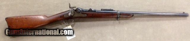 Description: Don't know much about Trapdoor Carbines but this appears to be a Model 1879 with Buffington Rear Sight, Breechblock marked 1873 and Lockplate marked 1873. US on buttplate, saddle ring and bar on left side, etc. Bore is good to very good would make a nice shooter. Stock an original carbine stock with never a hole for a ramrod. Barrel is 22 inches in length. Breechblock appears to have been refinished blue at some point. Wood is very good. Please see photos and we shall be glad to answer any questions a prospective buyer may have. Cannot imagine going wrong for the price asked. SOLD Curio/Relic: Yes Antique: Yes |