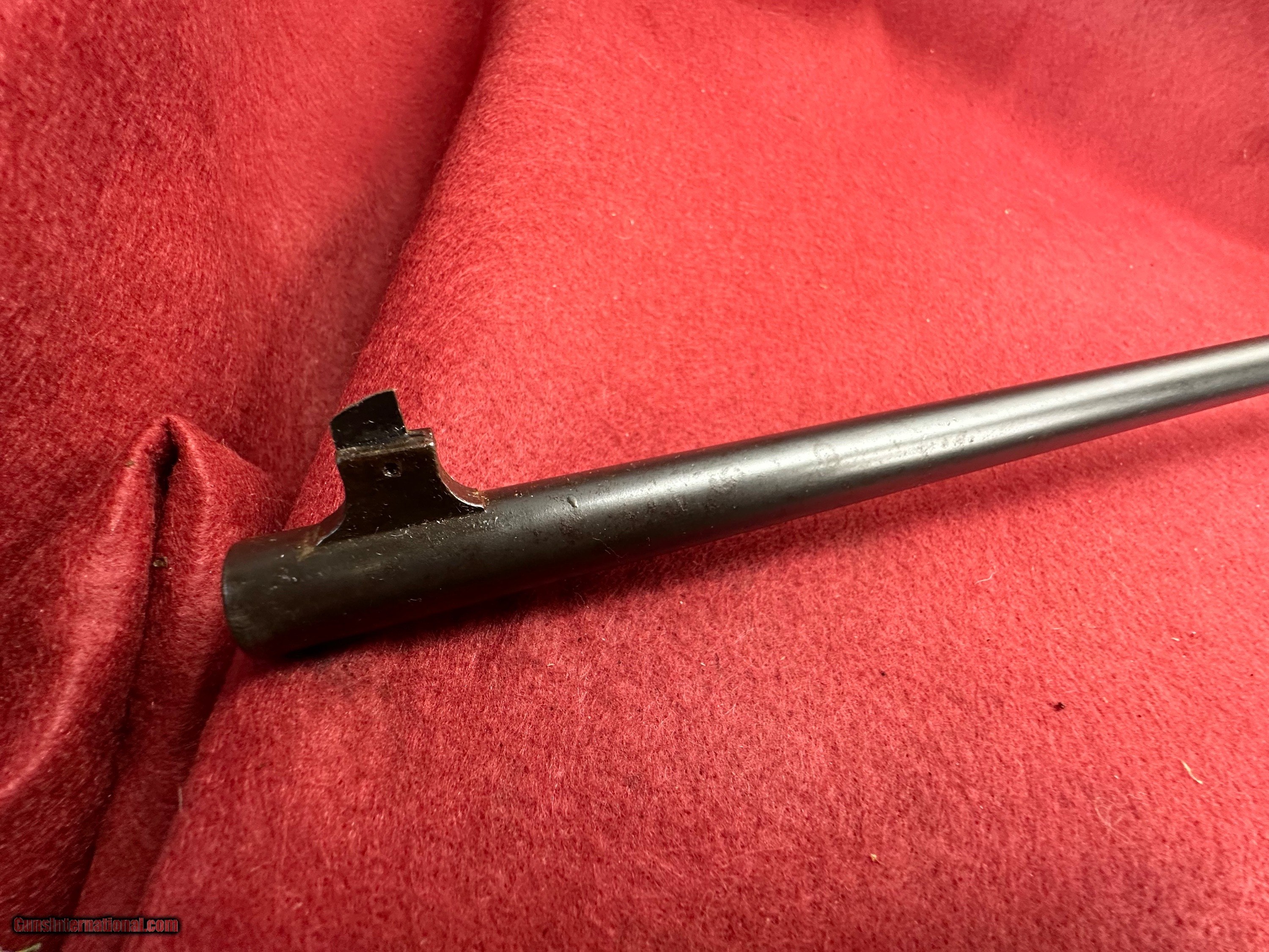 Description: Springfield 30-40 Krag Mfg in 1901 This rifle has a shinny bore strong rifling with some pitting. THe outside of the metal is in original condition and has not been drilled and tapped for any additional sights or altered in any way. The stock has been cut down but the barrel has not making this an excellent candidate for re-stocking with original military wood. since that would bring it back to unaltered original condition. Mechanically excellent. the bluing does not have much physical wear but it does have rust freckling throughout. Price includes all shipping and Credit card Fees SOLD Rifle Caliber: .30-40 Krag Manufacturer: Springfield Model: Krag Jorgensen Serial Number: 332249 Barrel Length: 30 Condition: Fair-Good Action: Bolt Manufacture Date: 1901 Item Location: Buxton Maine |
