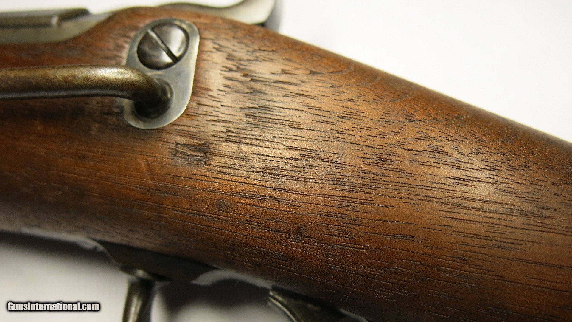 Description: Springfield Model 1877 Carbine Serial number 88358 .45-55-405 The following quote is taken from Al Frasca’ssite, trapdoorcollector. “The title, Model 1877, pertains only to carbines. Springfield did not designate a Model 1877 rifle or cadet rifle. The change from Model 1873 to Model 1877 was prompted by the addition of the cleaning rod holes in the butt stock of the carbine which required a heavier stock wrist to off-set any weakness the holes may have caused. The rifle and cadet rifles did not have the cleaning rod modification so they retained their Model 1873 designation." Many collectors use the name, Model 1877 for rifles and cadet rifles as a means of denoting their time of production. However, Springfield only referred to the Model 1877 when discussing carbines. The model change was brought about by the Little Big Horn battle of 1876, when General George Custer and his men were killed. It was the military's conclusion that access to cleaning rods during the battle would have been advantageous for removing lodged shell casings. At this time, it is thought that an unaltered Model 1877 carbine, made in early 1877, could have a Model 1873 rear sight. There seems to be some question whether the Model 1877 Type I sight was made for carbines. This point will require further research. The results will be published in the Trapdoor Springfield Newsletter.” This carbine was made between April and June in 1878. Its configuration is correct in all respects. The stock is of the short wrist long comb variation that was incorporated between serial numbers 70,000 and 72,000. The stock has been lightly sanded sometime in the past. There is sling ring wear on the left wrist and the oval cartouche is faint but visible. If it was legible it wound say EAS over 1878. This style of cartouche was used from serial number 72,000 to 99,000. The firing proof P is visible rear of the trigger plate. There are some nicks, dings and scratches but no cracks or missing wood. The sling ring and bar are the second type with larger wire diameters utilized after serial number 75,100. The butt has a carved number 32 on the right side and a carved letter H on the left and they are 3/4” tall. The butt plate has the key hole shaped trap opening that was used from about serial numbers 75,000 to 76,000 and up to 130,000. The three section 1877 cleaning rod and the first type 1875 (Tegethoff) shell extractor are present. It is marked on the top tang with US. The barrel proof marks on the left rear are the larger version used after serial number 67,600. The bottom of the barrel is marked with two P’s. There is an additional mark that appears to be an inspector’s mark that may be a &. There are also two marks that look like quotation marks between the two P’s. The reference marks on the right side of barrel and receiver are in perfect alignment. The bore is in very good condition. The muzzle crown shows moderate rod wear. There is evidence that the muzzle has been lightly re-crowned on the inside edge and shows a slight step and was done many years ago. The barrel has a straight sided flat tenon that was used before serial numbers 92,000 to 93,000. The head space checks perfect. The early narrow receivers, as on this carbine, were used until about serial numbers 96,400 to 97,000. The gas ports were lengthened and deepened between serial numbers 77,387 and 77,593 or mid 1877. The low arch breech block has square shoulders. The firing pin tunnels were raised at about serial number 35,000. The firing pin return springs were eliminated on the third type firing pins and they were put into use at about serial number 85,000. The block is marked U.S. / MODEL / 1873. The thumb piece and cam latch are the second type that was utilized in March of 1876 at about serial number 67,000. The height of the extractor lug was raised to 0.10” between serial numbers 77,430 and 78,107. The lock plate is the second type without the 1873 date and utilized after about serial number 80,000. The tumbler has three notches and was used on carbines after serial number 28,000. The hammer is the second type with stamped knurling used after about serial number 45,000. The trigger plate is a Model 1864 with square pads for the trigger bow. The trigger is the early smooth type used up until about serial number 230,000. The barrel band has a stacking swivel that was used on carbines between serial numbers 20,000 and 119,000. The swivel is marked PAT.M 31.74. and the band has the small U. The rear sight is a second type Model 1877 with smooth ramp sides. It was put into use between serial numbers 85,500 and 99,000. The base is graduated from 100 to 600 on the left side and is also marked with the letter C. The leaf is graduated from 700 to 1,200. It is attached to the barrel with slotless screws that appear to be original. The front sight is a two piece with a pinned in first type blade used until about serial number 119,000. Various markings Lock plate &, X, 1, A, S, M, B Tumbler S Bridle L Sear M Sear spring 2 Main spring 16 base end, W hook end Trigger plate 7 Trigger 3 Receiver bottom rear K Breech screw 2 SOLD Antique: Yes Manufacturer: Springfield Armory Model: 1877 Carbine |