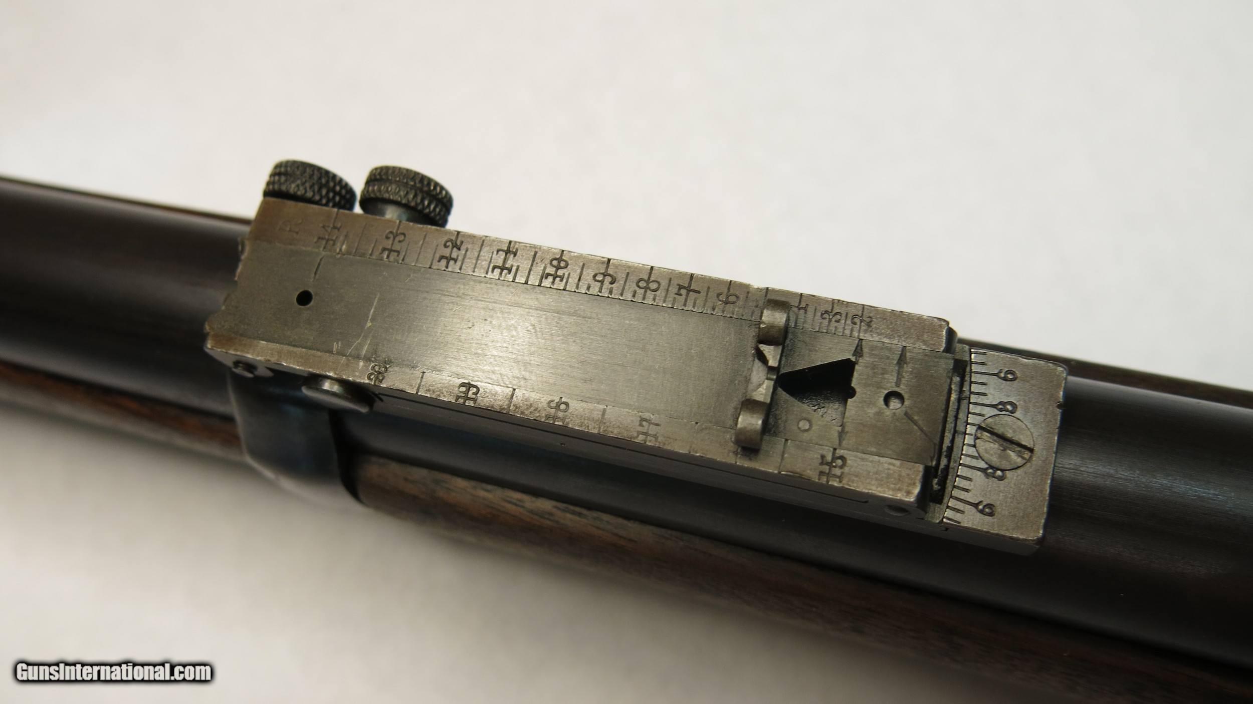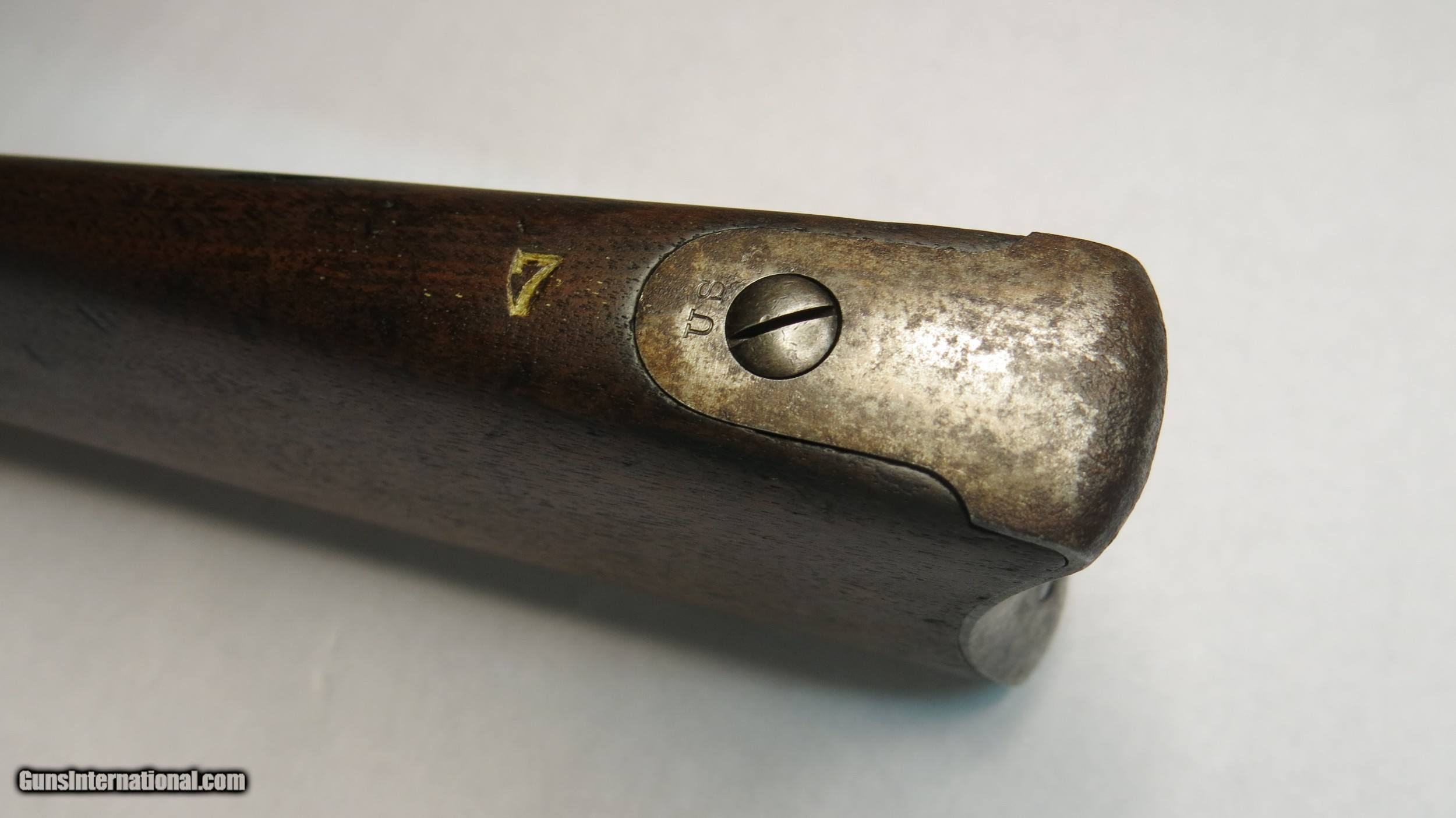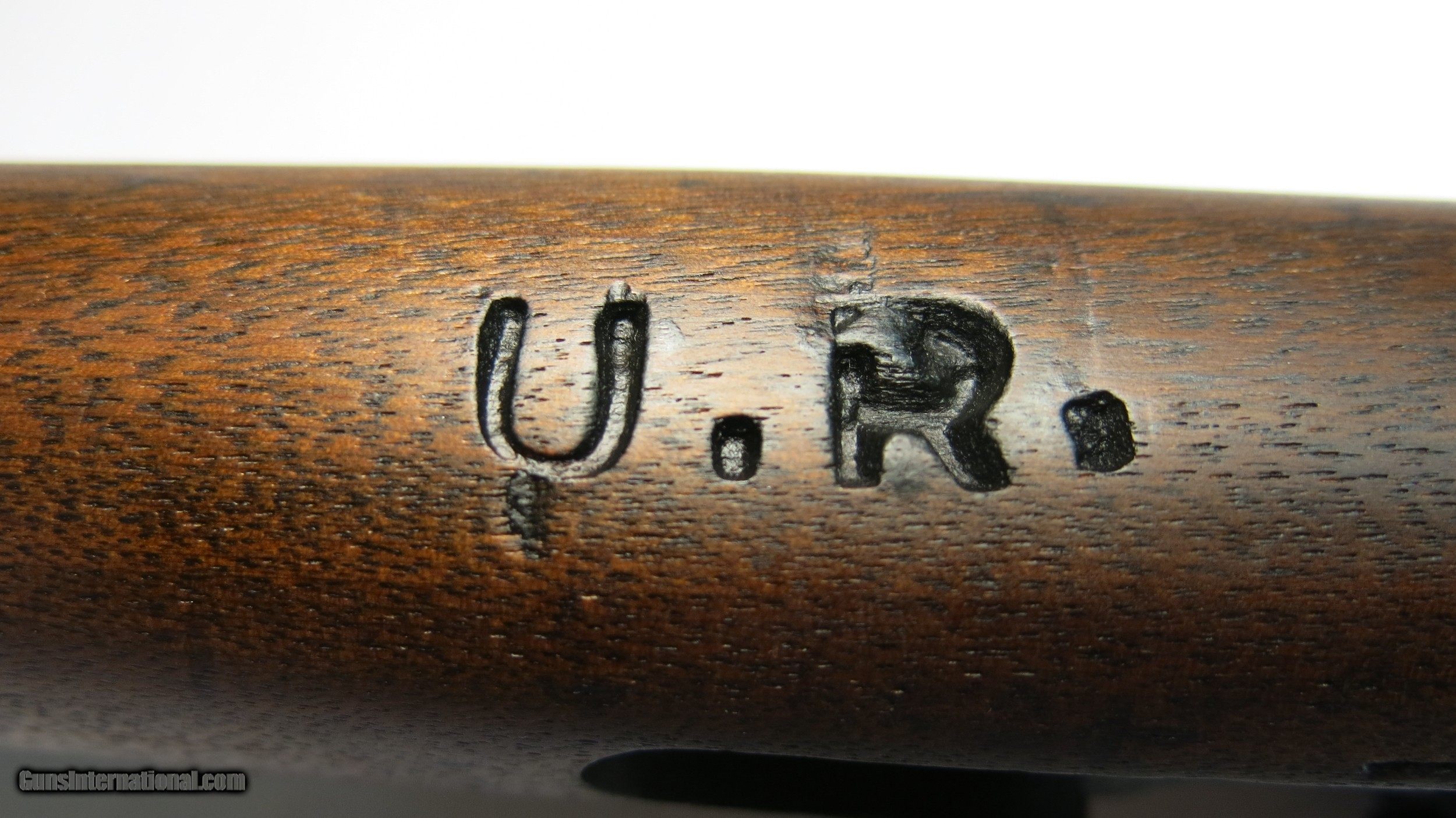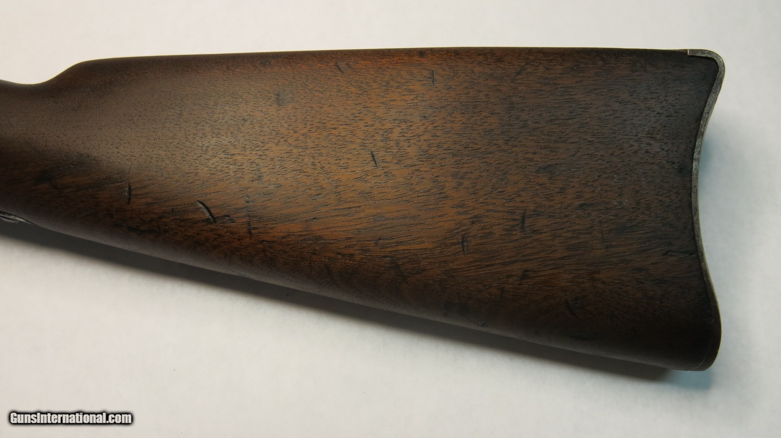 Description: Springfield Armory Model 1888 Cadet Rifle Serial Number 534505 .45/55 Possible Movie Studio Rifle This cadet rifle was made between January and March of 1892. There was a total of 13,500 M84 cadets made, 2,320 made in 1892 and the last 5,000 were made in 1893. The breech block has the low arch. It is marked U.S. / MODEL / 1884. It does have an aluminum bronze firing pin. This rifle has a one piece trigger guard that was adapted in 1888 at approximately serial number 495000 when the supply of two piece carbine style guards was depleted. The trigger and sling swivel are riveted on. The barrels bore is in excellent condition with some minor frosting for the first few inches from the muzzle as well as minor rod wear to the crown. The chamber mouths cartridge rim rebate shows some deformation in the 7 o:clock area. It has been smoothed out and does not interfere with the cartridge. Headspace is good with about .002” excess on a No Go gauge. The stock does not have an inspector’s cartouche or firing proof and it appears that it never had them so it is probably a replacement. It has the long wrist and short comb. The stock has inletting for trigger bow nuts but they are not necessary because of the M1888 one piece guard. There is a 5/16” tall number 7 on the heal forward of the butt plate and is filled with a yellow or gold paint. There is a 3/8” tall branded U.R. on the belly forward of the trigger guard. One possible answer was when Republic Studios bought United Studios in Southern California a lot of their property was marked U.R. This has not been verified. Published data This rifle Overall length 49” 49” Stock length 45 3/4” 45 3/4” Barrel length 29.6” 29 21/32” Front sight length 5/16” 11/32” Front sight from muzzle 1 1/4” 1 1/4” Rod length 32 9/16” 32 9/16 Rod cannelure’s 3 1/8” 3 1/8” Eagle shield height 0.190” 0.190” Eagle height 0.440” 0.440” Eagle wingtip to wingtip 0.675” 0.675” Breech block lettering 0.07” 0.07” SPRINGFIELD 1.0” x 0.110” 1.0” x 0.110” Head space Go = .070” No Go = .075” .077” Other markings PAT / AUG. 16 / 1870 Rod stop A Top of barrel at receiver V, P, eagle head, P Top left of barrel D Above barrel receiver reference marks L Stock rear of trigger plate D Main spring base end Y Sear H Sear spring 6 or 9 Tumbler M Breech screw L, 6 or 9 Bottom of receiver ~, P, 4 dots Bottom of barrel SOLD Antique: Yes Manufacturer: Springfield Armory Model: 1888 Cadet |