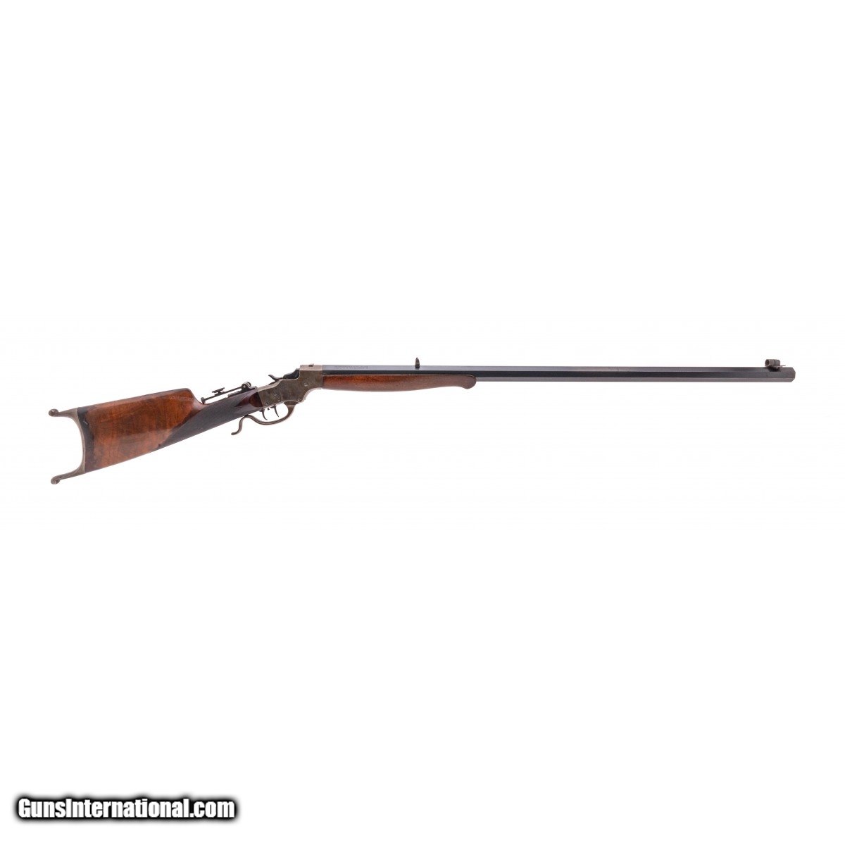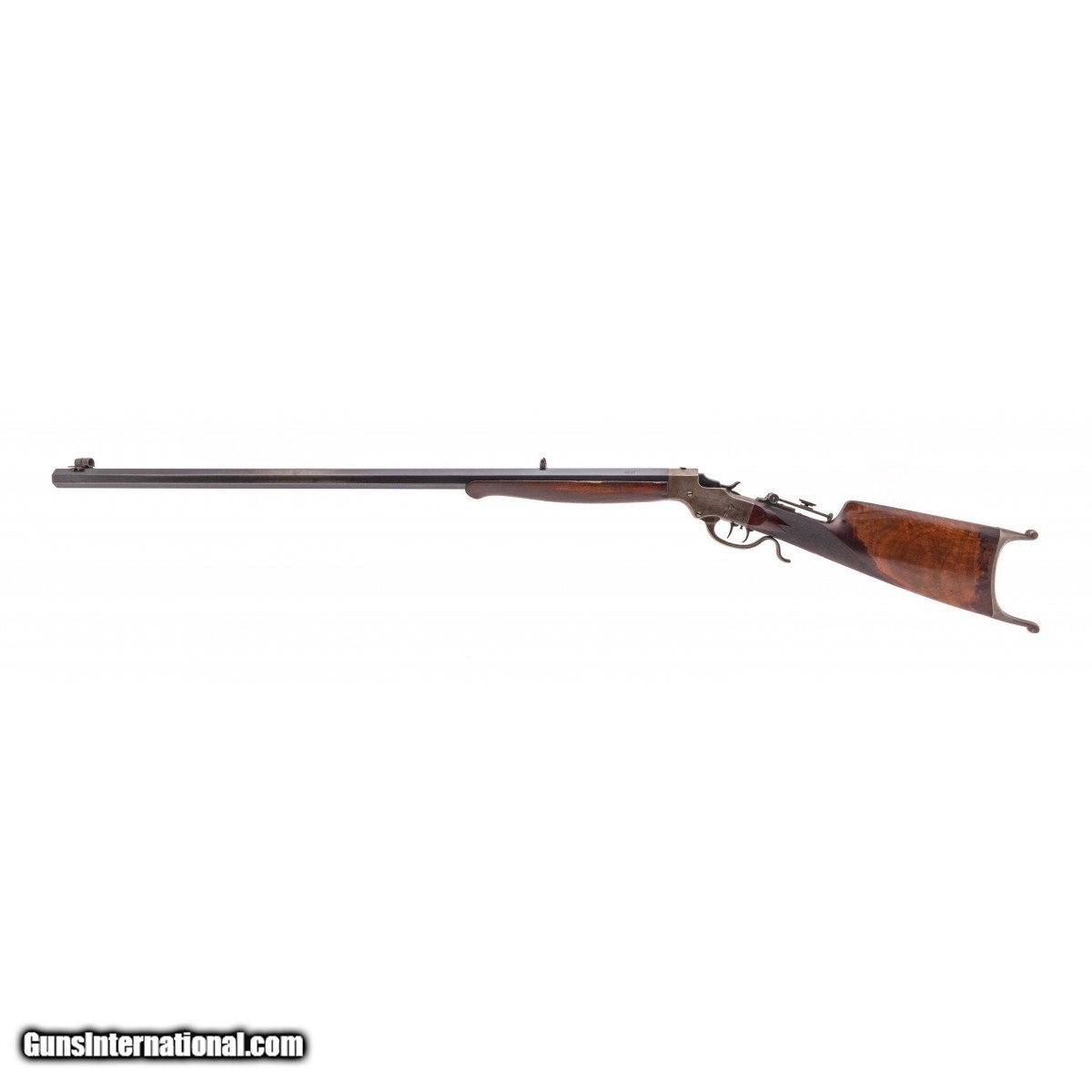 Description: " SN:3151. Circa 1900s, .28-30, with a 32"" bull barrel. Bore is good. Single shot schutzen style rifle. Has 90% original finish on the barrel, with about 30% case colors on the receiver. The stock is figured walnut and is very good. Overall in very good condition. Consignment. SOLD |