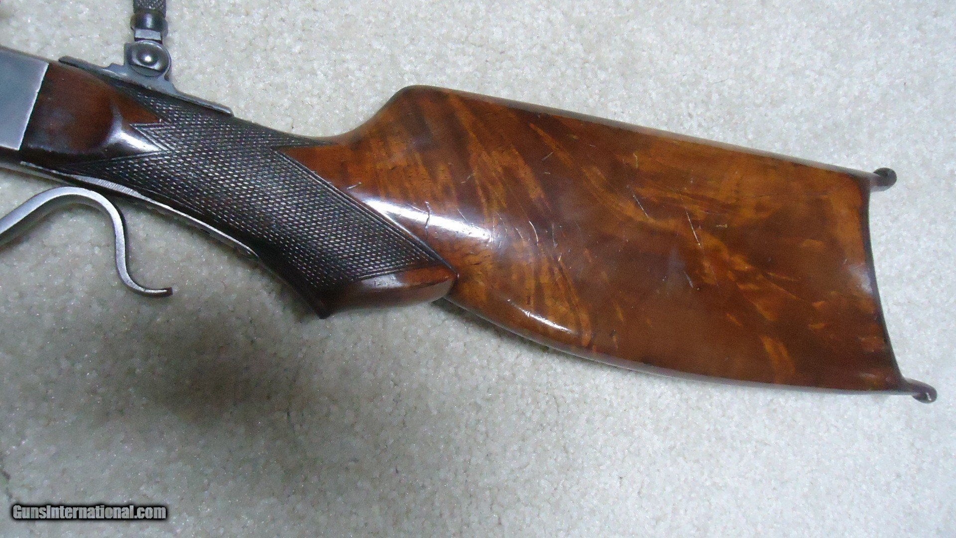 Description: VERY LIMITED PRODUCTION AND HARD TO FIND STEVENS 55 LADIES' MODEL, .22 LONG RIFLE, #64XXX, MADE 1897-1916. The Ladies' Model was built on the small "Favorite" frame and was a lightweight deluxe model in every way geared toward lady and youth shooters. This example has the standard 24" half octagon barrel fitted with the correct Beach combination folding globe front sight, gallery rear barrel sight and Lyman tang sight with small folding aperture intact. The stock is a beautiful rich fancy burl walnut with checkered pistol grip and Swiss butt plate. The forend has a graceful schnable and is also checkered. The barrel retains about all of the lightly aged blue with excellent markings and matching number on the bottom. The uncleaned receiver has aged dark with some darkened case colors mainly on the left side and on the receiver top around the hammer. The professionally relined bore is excellent and only noticeable by looking carefully for the liner ring at the muzzle. The action is tight with light trigger pull. A most attractive Stevens takedown rifle with model designation "55" stamped in the front face of the receiver when the barrel assembly is removed. This fine and fancy rifle must have been someone's pride and joy around the turn of the last century! SOLD Curio/Relic: Yes Rifle Caliber: .22 Long Rifle Manufacturer: STEVENS Model: M-55 Lady's Model Serial Number: 64XXX Barrel Length: 24" HALF OCTAGON Condition: FINE Bore Condition: EXCELLENT |