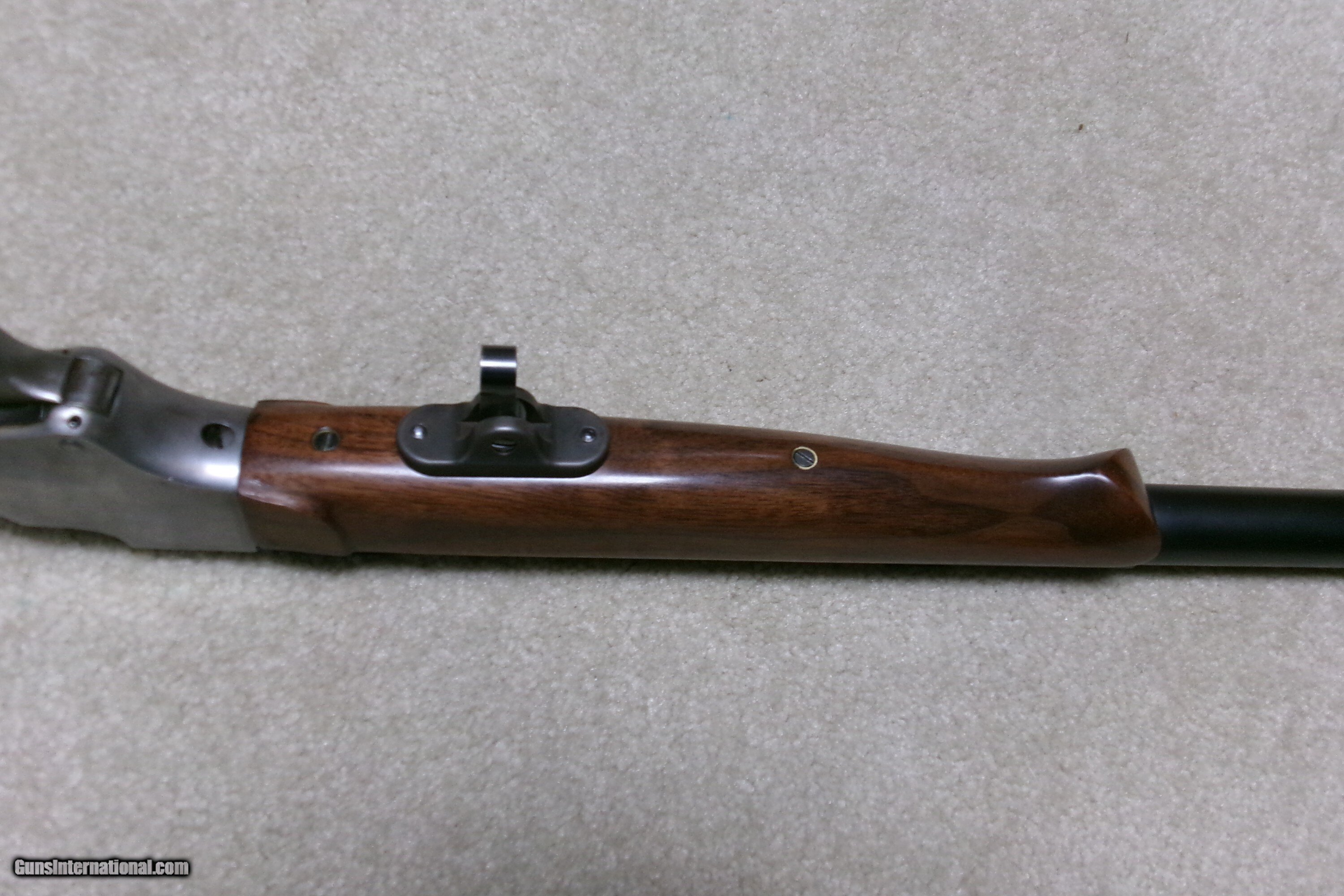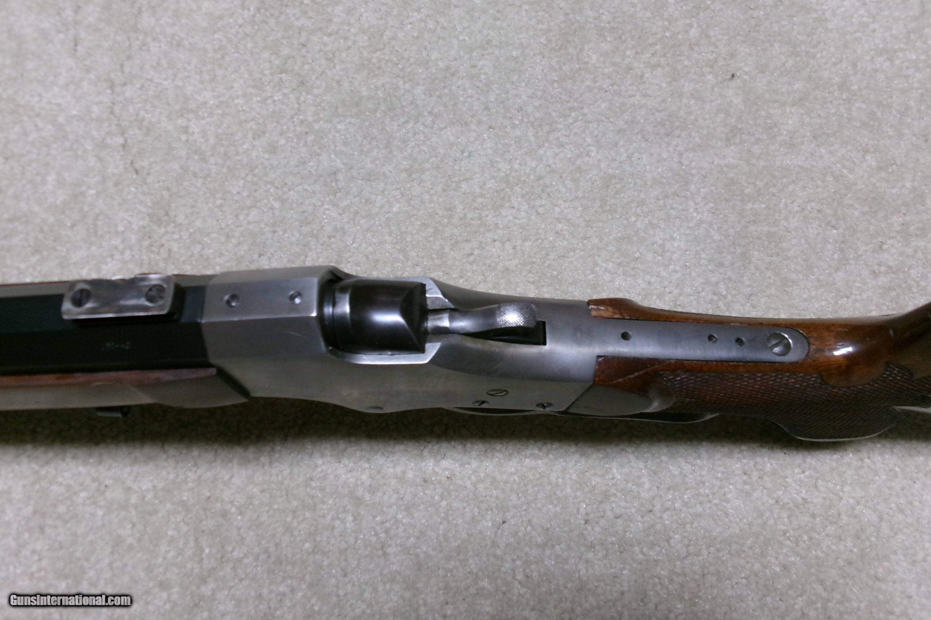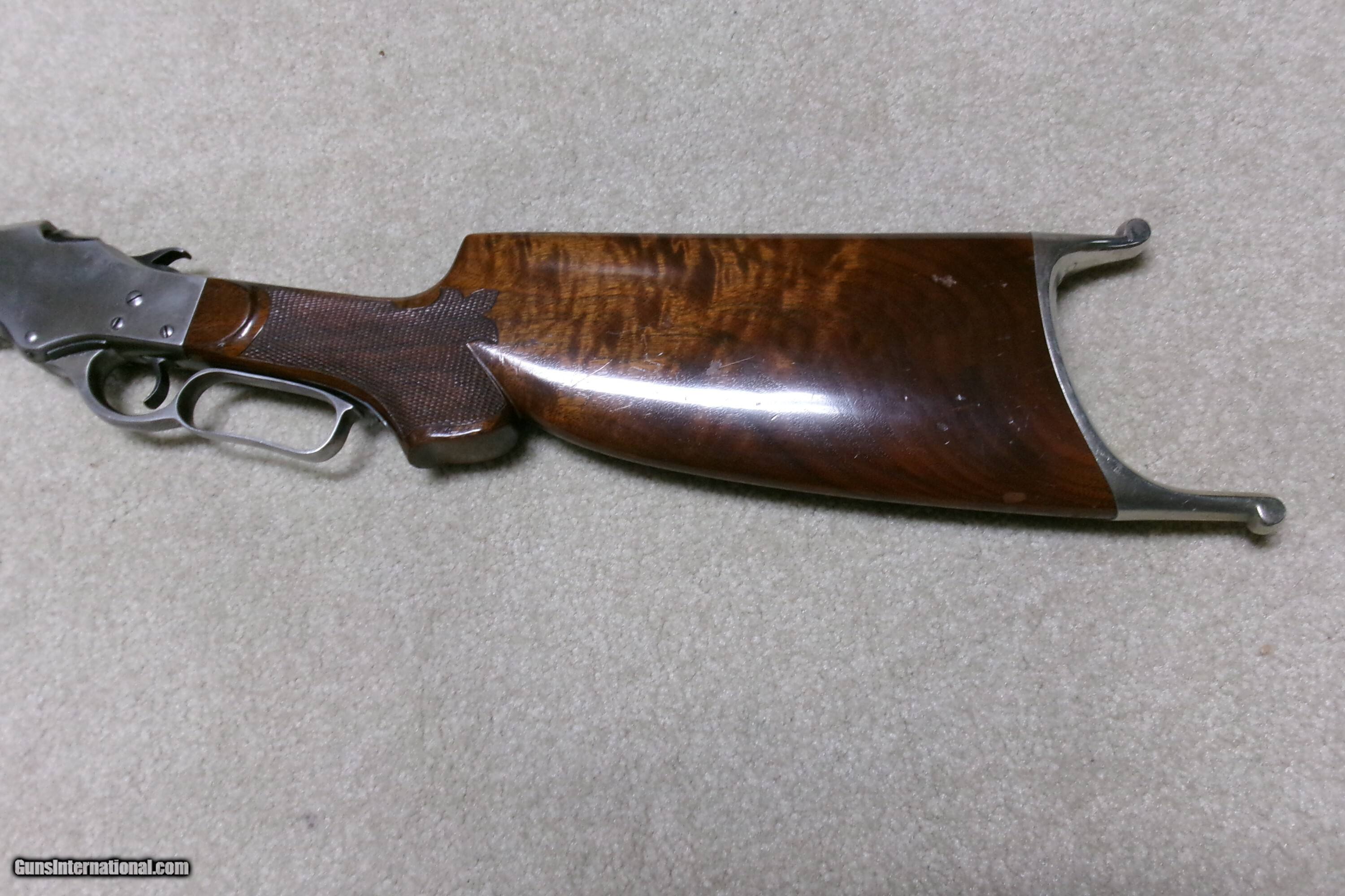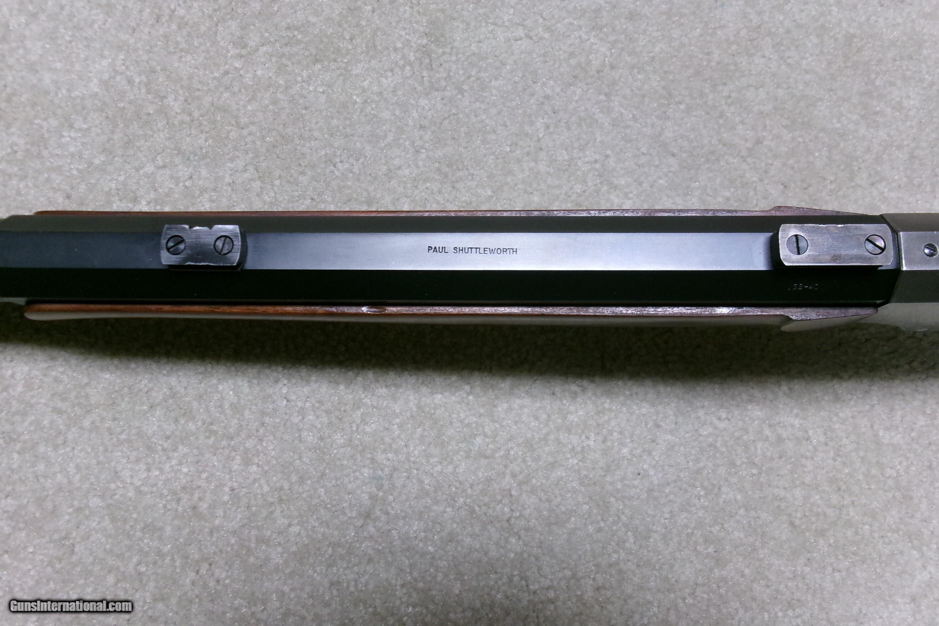 Description: PAUL SHUTTLEWORTH STEVENS 44 ½ SCHUETZEN RIFLE, .32-40 CAL. This one appears to be an original Stevens action and butt stock with a Paul Shuttleworth installed barrel and forend. The receiver is in the white (French Gray) and is very tight with very light trigger pull. The hammer spring is heavy and strong. The butt stock has the fancy Stevens checkering and schnable pistol grip bottom with dense fancy grain walnut and fitted with a nickel plated Swiss butt plate with about all the nickel remaining. The 28” medium heavy half octagon barrel is fitted with scope blocks spaced about 7 ½” center to center. The front sight dovetail is empty. There is no rear sight dovetail. The top of the octagon receiver top is drilled and tapped with two holes with filler screws and the upper tang appears to have an extra hole (?). The forend is excellent and is equipped with a palm rest base (looks to be a CPA base). The barrel is marked “PAUL SHUTTLEWORTH” on top. Under the forend is stamped “DOUGLAS XX 15 TW .3210 GR 12.11.07 726” The number 726 is is written on the inside of the forend. Overall excellent with perfect bore. A couple small repaired chips/cracks at the upper tang receiver juncture- minor. Weighs 10 ¾ lbs. Should e a great shooting .32-40 built on the strong 44 ½ action! Manufacturer: STEV./SHUTTLEWORTH Model: 44 12 SCHUETZEN Serial Number: N/A Barrel Length: 28 HALF OCT. Condition: EXCELLENT Bore Condition: EXCELLENT Price: $2,850.00 Contact Seller |