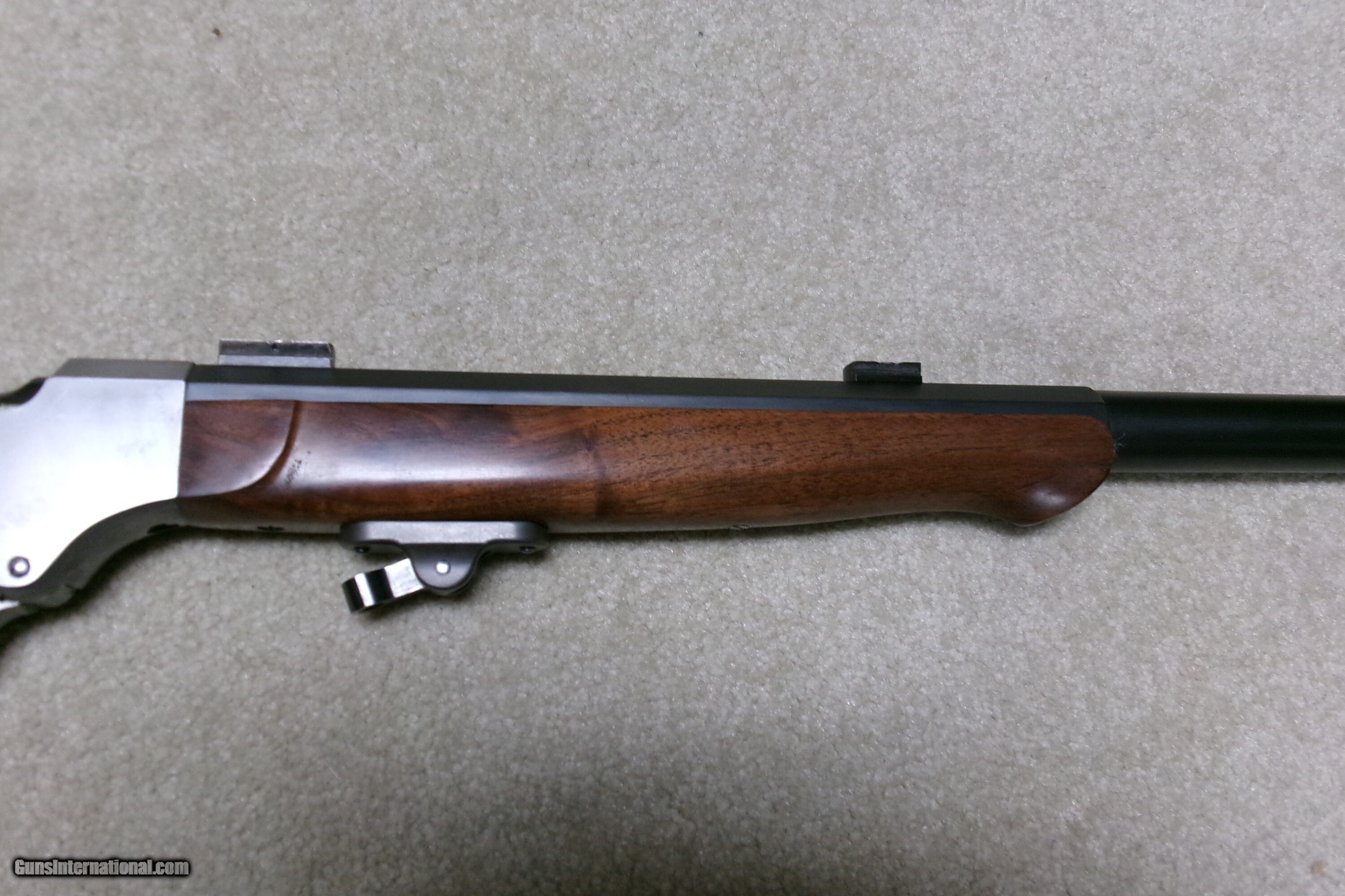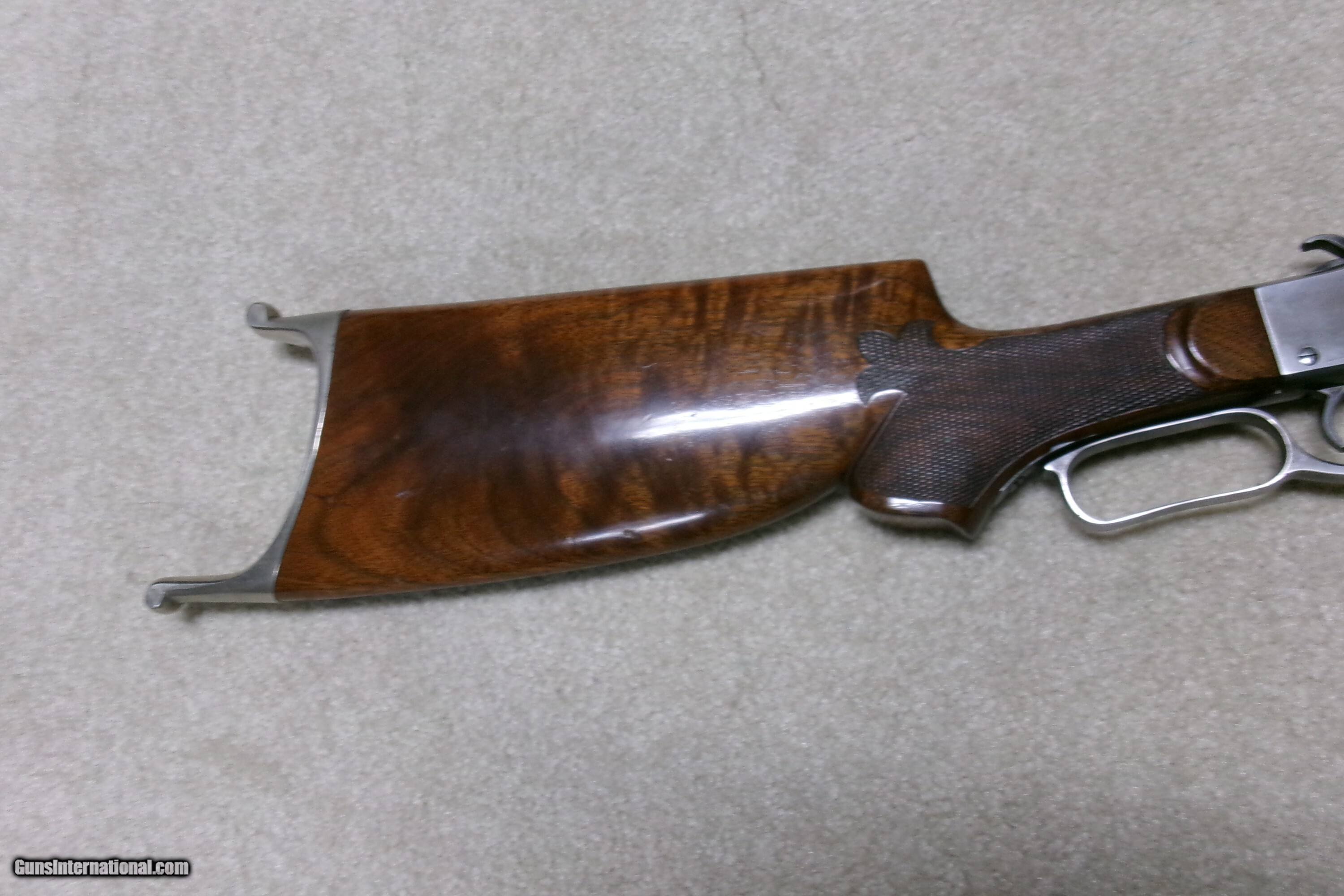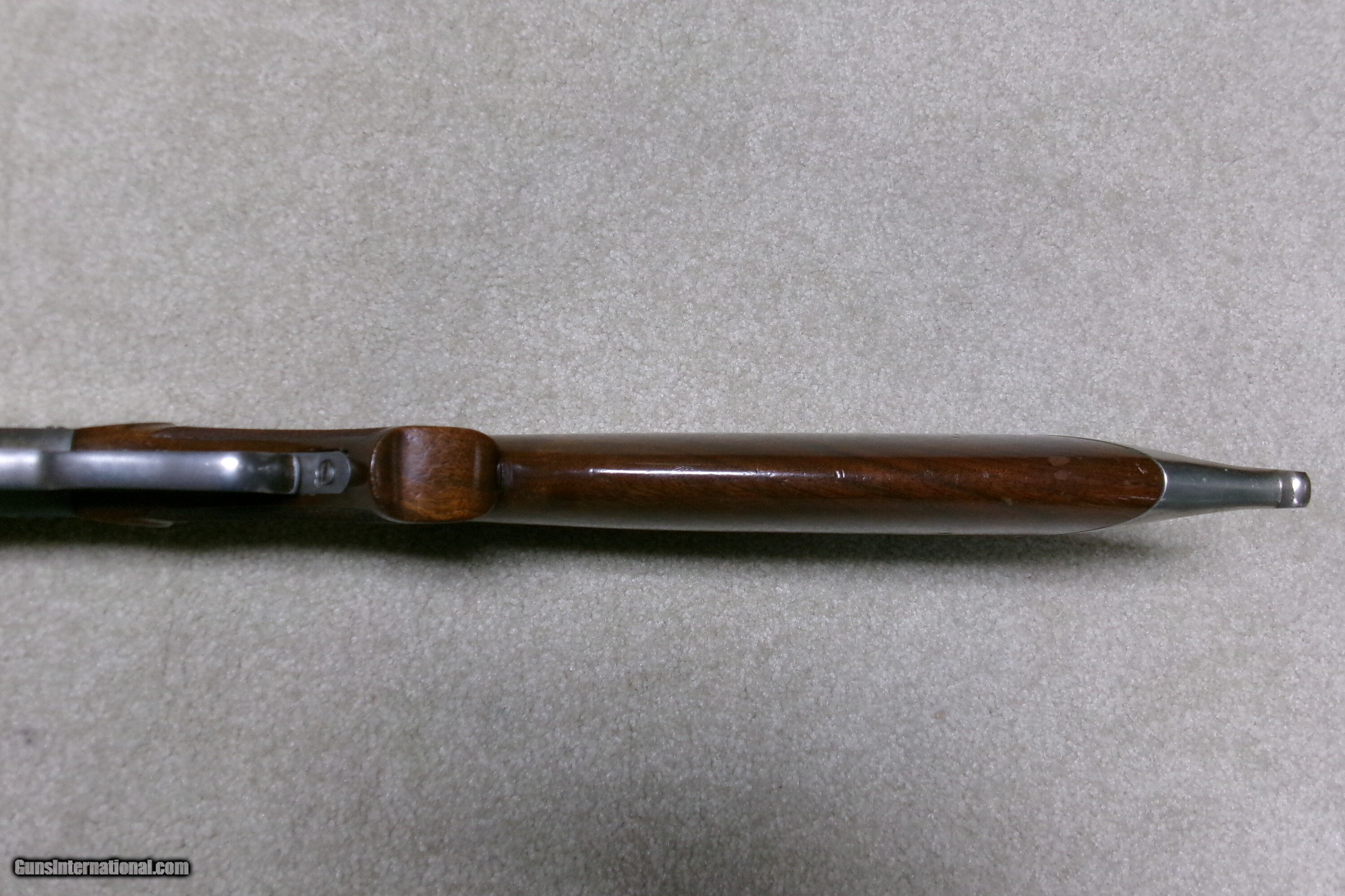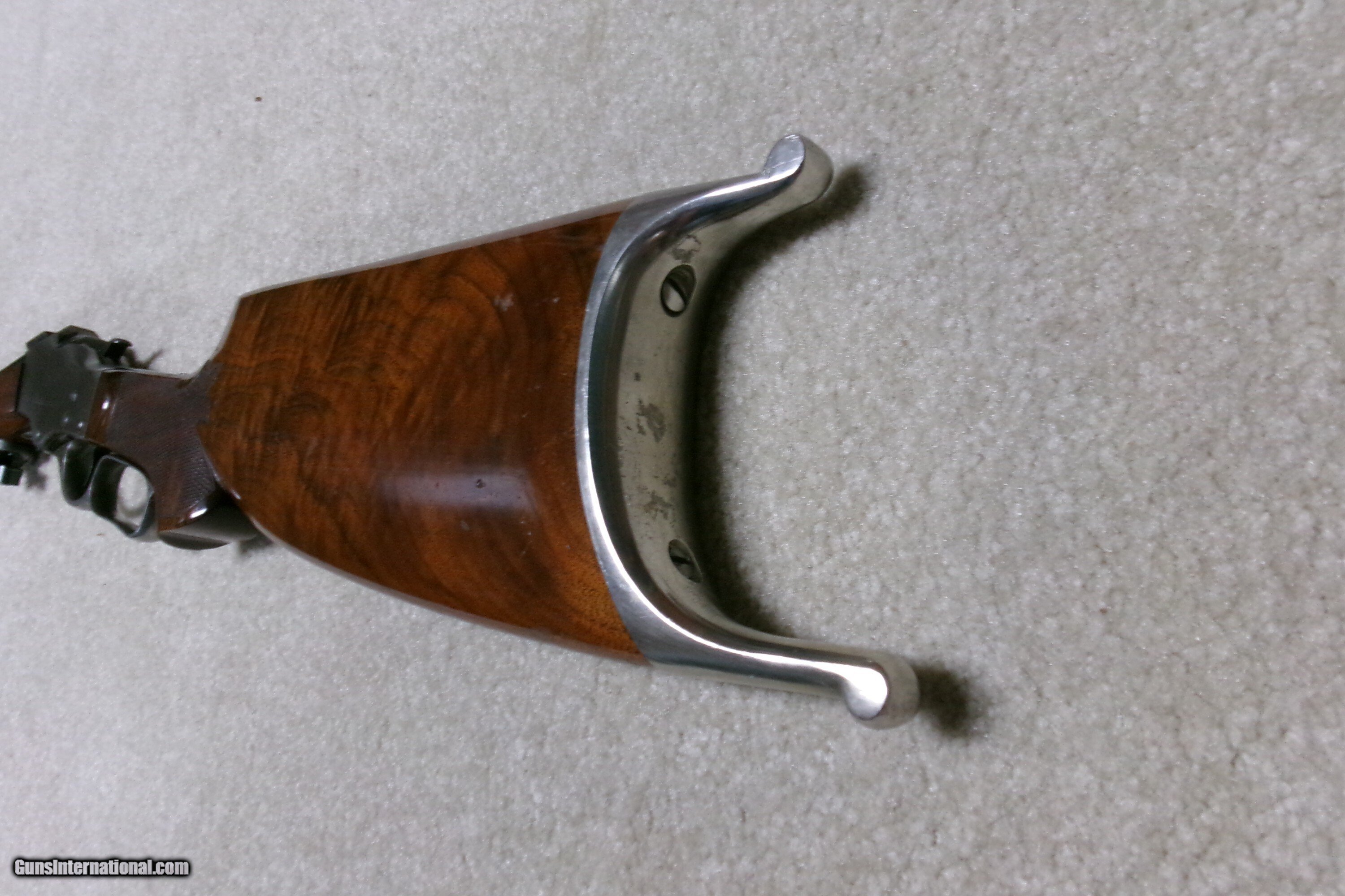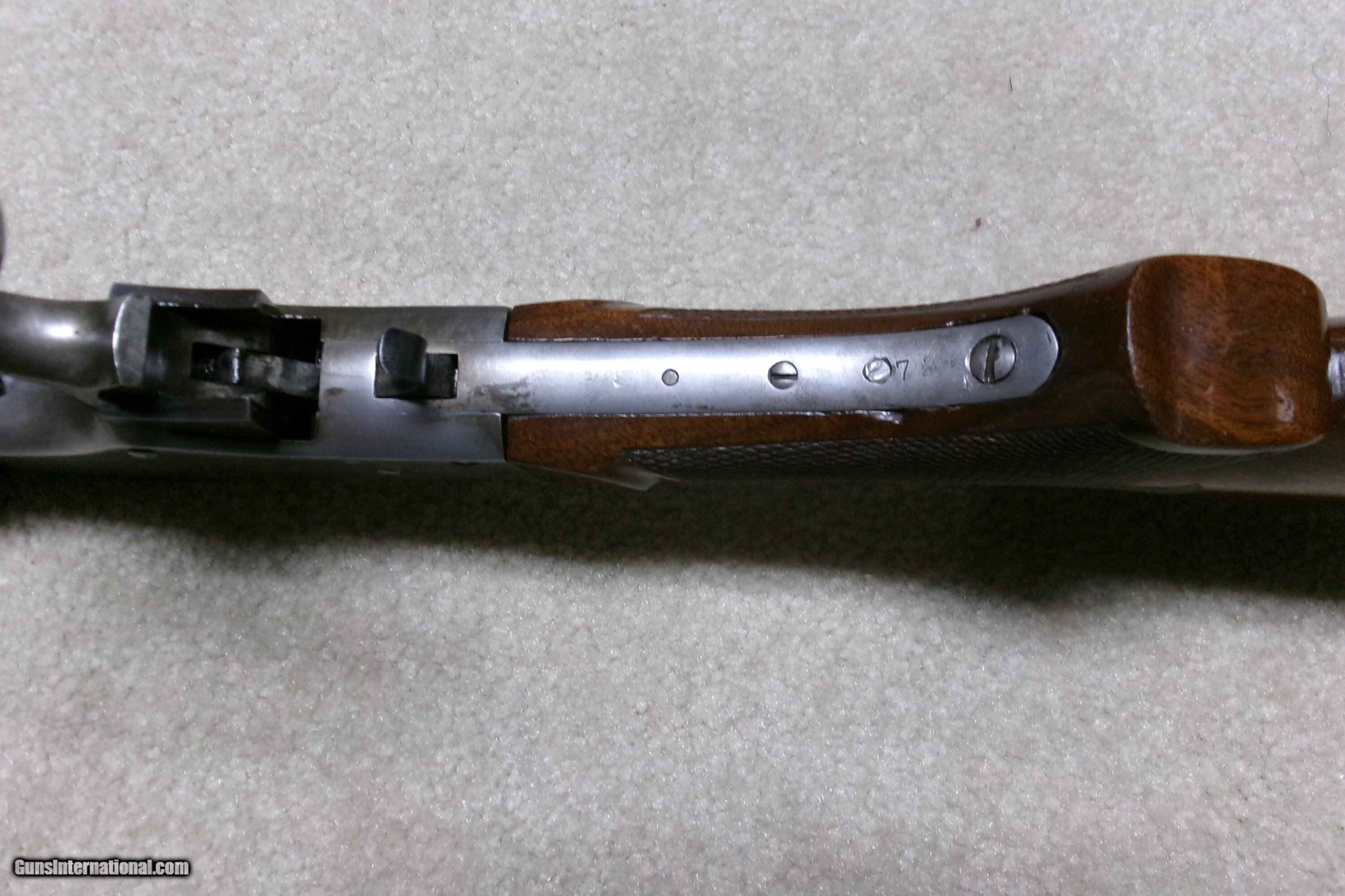 Description: PAUL SHUTTLEWORTH STEVENS 44 ½ SCHUETZEN RIFLE, .32-40 CAL. This one appears to be an original Stevens action and butt stock with a Paul Shuttleworth installed barrel and forend. The receiver is in the white (French Gray) and is very tight with very light trigger pull. The hammer spring is heavy and strong. The butt stock has the fancy Stevens checkering and schnable pistol grip bottom with dense fancy grain walnut and fitted with a nickel plated Swiss butt plate with about all the nickel remaining. The 28” medium heavy half octagon barrel is fitted with scope blocks spaced about 7 ½” center to center. The front sight dovetail is empty. There is no rear sight dovetail. The top of the octagon receiver top is drilled and tapped with two holes with filler screws and the upper tang appears to have an extra hole (?). The forend is excellent and is equipped with a palm rest base (looks to be a CPA base). The barrel is marked “PAUL SHUTTLEWORTH” on top. Under the forend is stamped “DOUGLAS XX 15 TW .3210 GR 12.11.07 726” The number 726 is is written on the inside of the forend. Overall excellent with perfect bore. A couple small repaired chips/cracks at the upper tang receiver juncture- minor. Weighs 10 ¾ lbs. Should e a great shooting .32-40 built on the strong 44 ½ action! Manufacturer: STEV./SHUTTLEWORTH Model: 44 12 SCHUETZEN Serial Number: N/A Barrel Length: 28 HALF OCT. Condition: EXCELLENT Bore Condition: EXCELLENT Price: $2,850.00 Contact Seller |