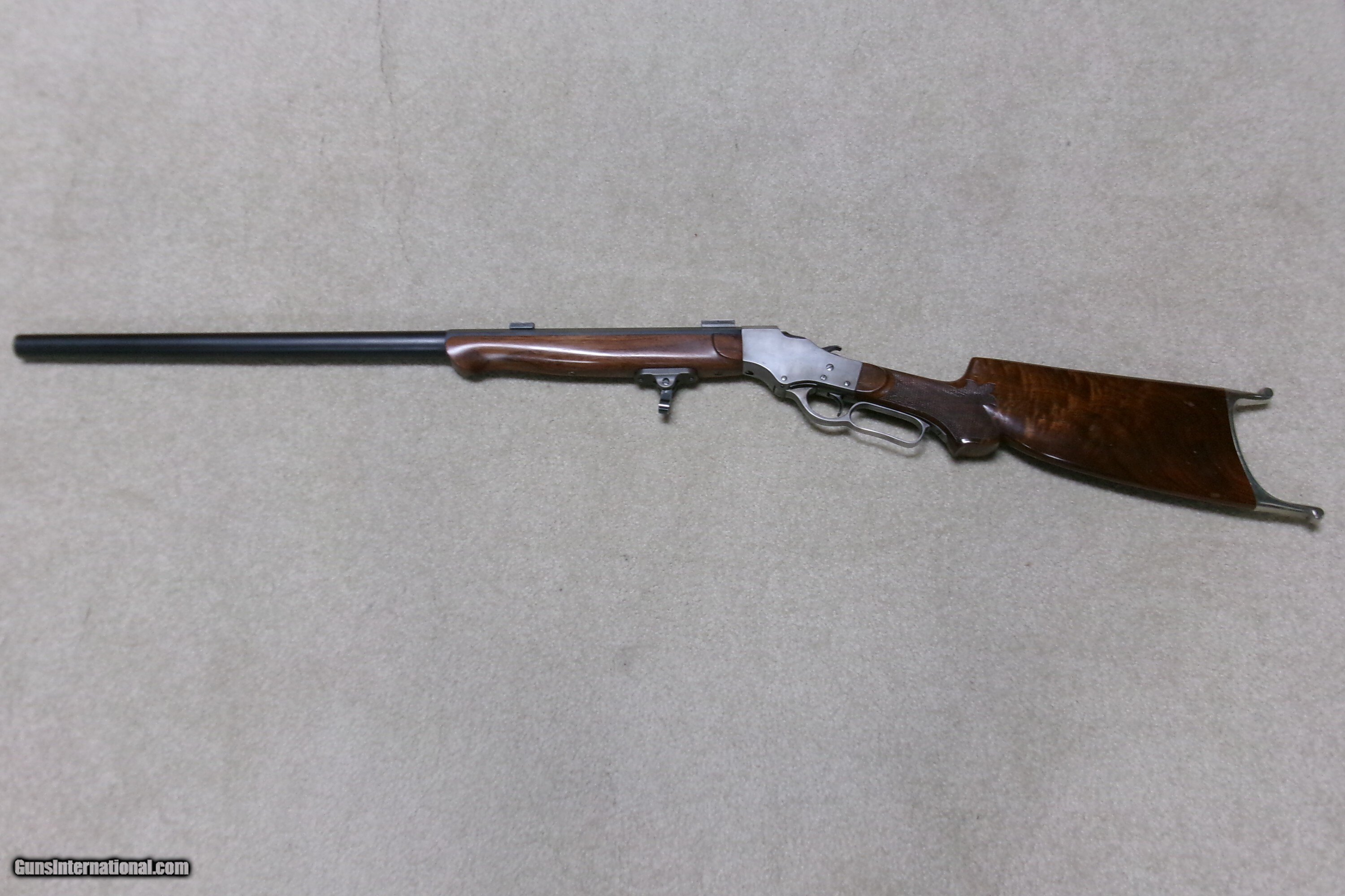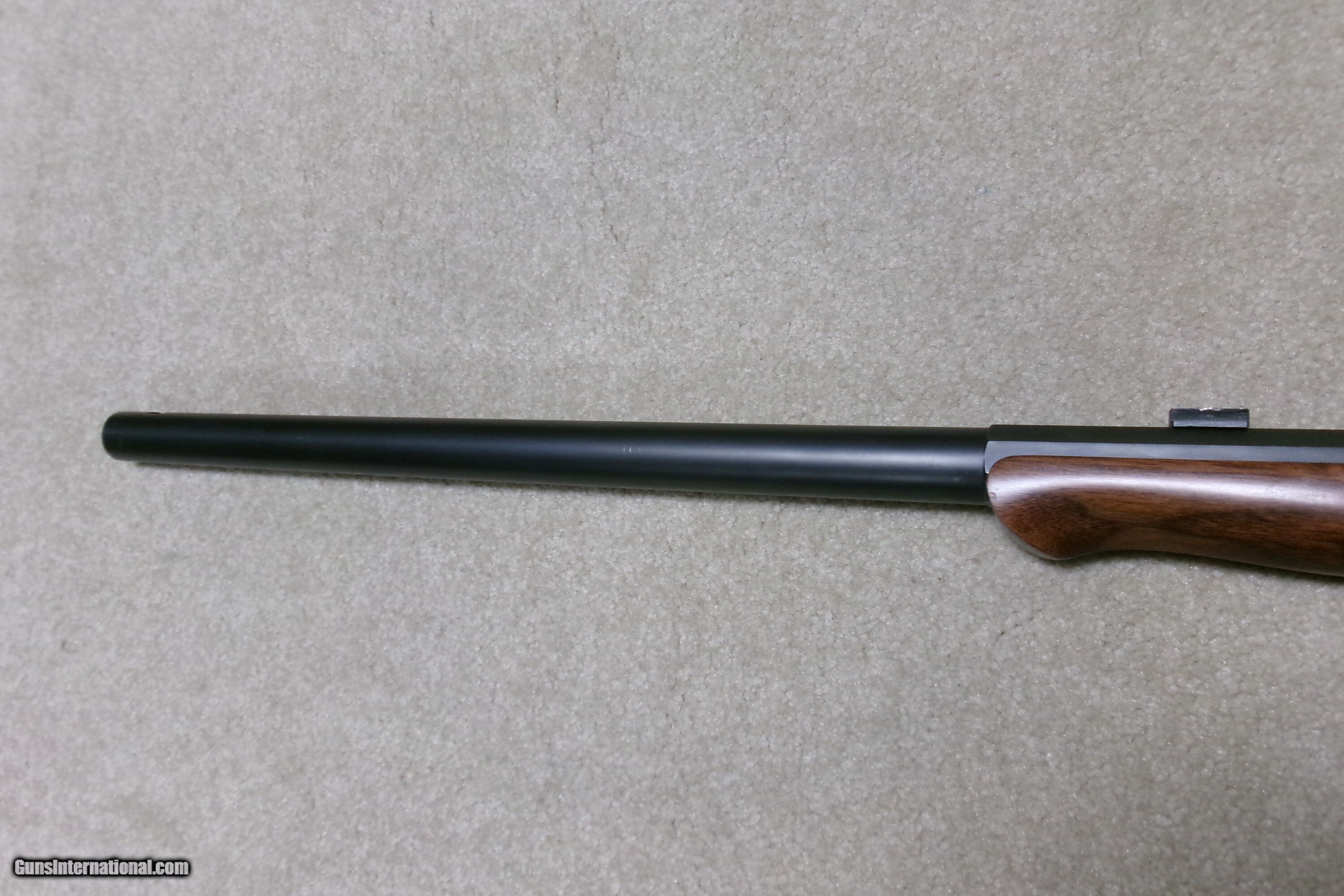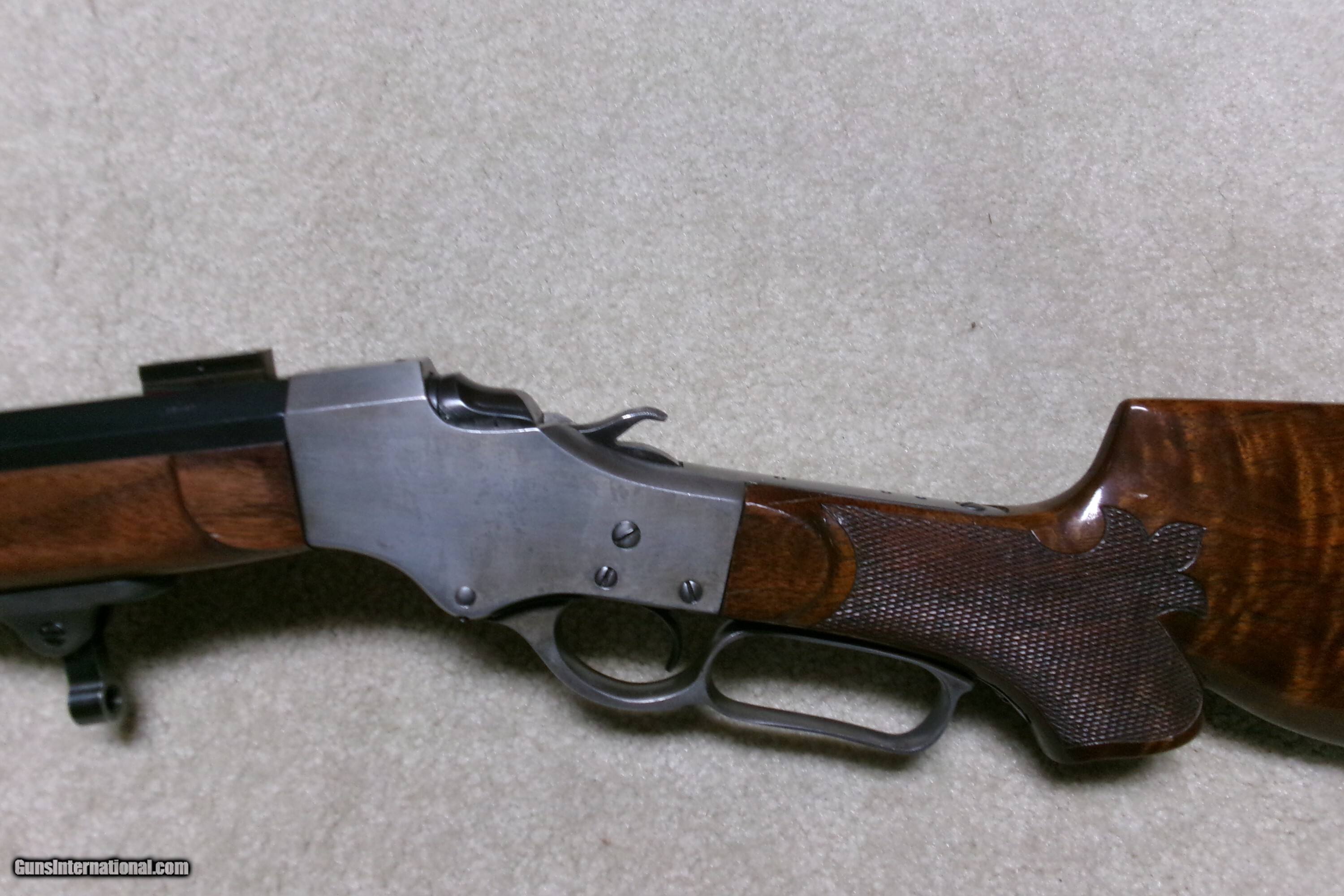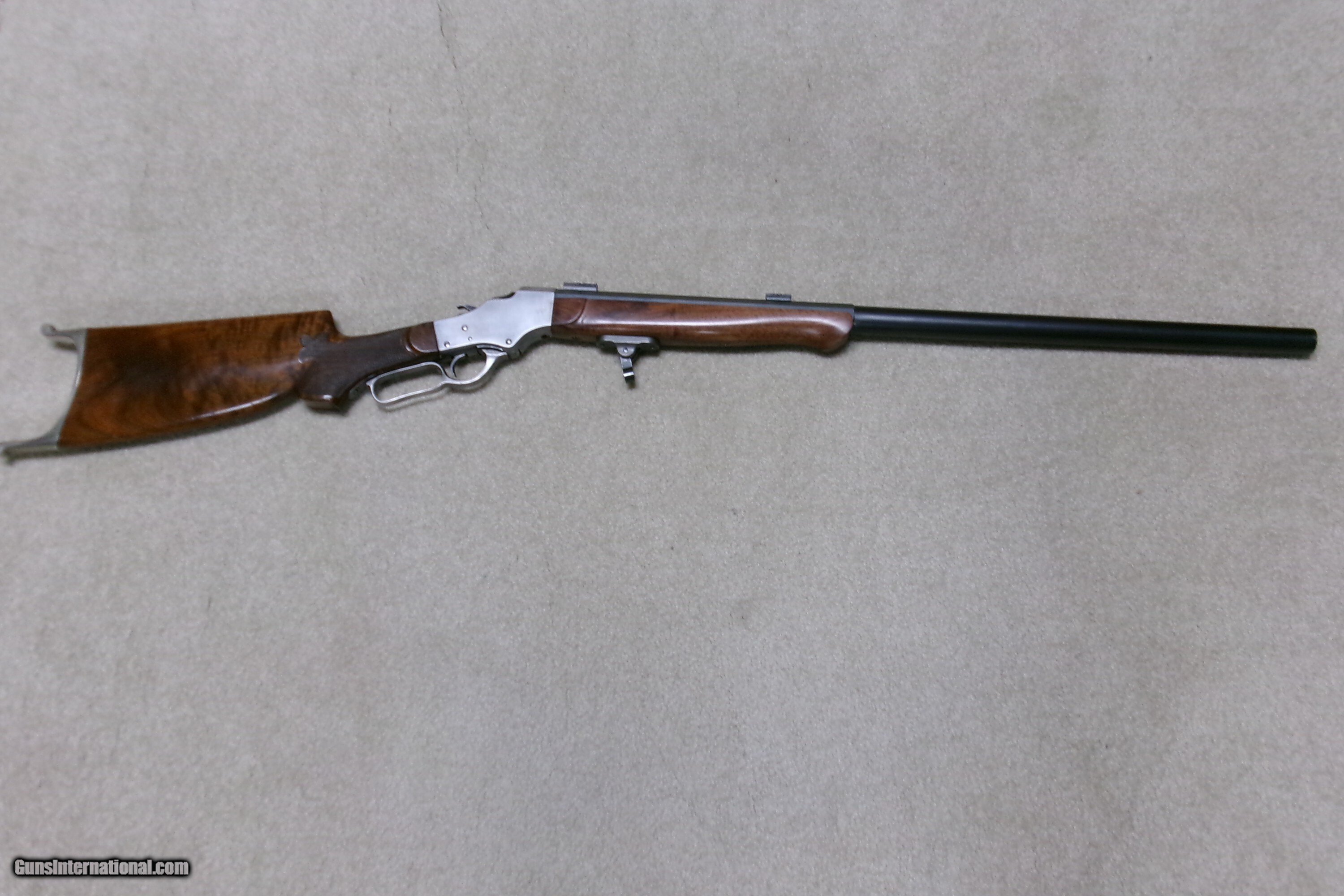 Description: PAUL SHUTTLEWORTH STEVENS 44 ½ SCHUETZEN RIFLE, .32-40 CAL. This one appears to be an original Stevens action and butt stock with a Paul Shuttleworth installed barrel and forend. The receiver is in the white (French Gray) and is very tight with very light trigger pull. The hammer spring is heavy and strong. The butt stock has the fancy Stevens checkering and schnable pistol grip bottom with dense fancy grain walnut and fitted with a nickel plated Swiss butt plate with about all the nickel remaining. The 28” medium heavy half octagon barrel is fitted with scope blocks spaced about 7 ½” center to center. The front sight dovetail is empty. There is no rear sight dovetail. The top of the octagon receiver top is drilled and tapped with two holes with filler screws and the upper tang appears to have an extra hole (?). The forend is excellent and is equipped with a palm rest base (looks to be a CPA base). The barrel is marked “PAUL SHUTTLEWORTH” on top. Under the forend is stamped “DOUGLAS XX 15 TW .3210 GR 12.11.07 726” The number 726 is is written on the inside of the forend. Overall excellent with perfect bore. A couple small repaired chips/cracks at the upper tang receiver juncture- minor. Weighs 10 ¾ lbs. Should e a great shooting .32-40 built on the strong 44 ½ action! Manufacturer: STEV./SHUTTLEWORTH Model: 44 12 SCHUETZEN Serial Number: N/A Barrel Length: 28 HALF OCT. Condition: EXCELLENT Bore Condition: EXCELLENT Price: $2,850.00 Contact Seller |