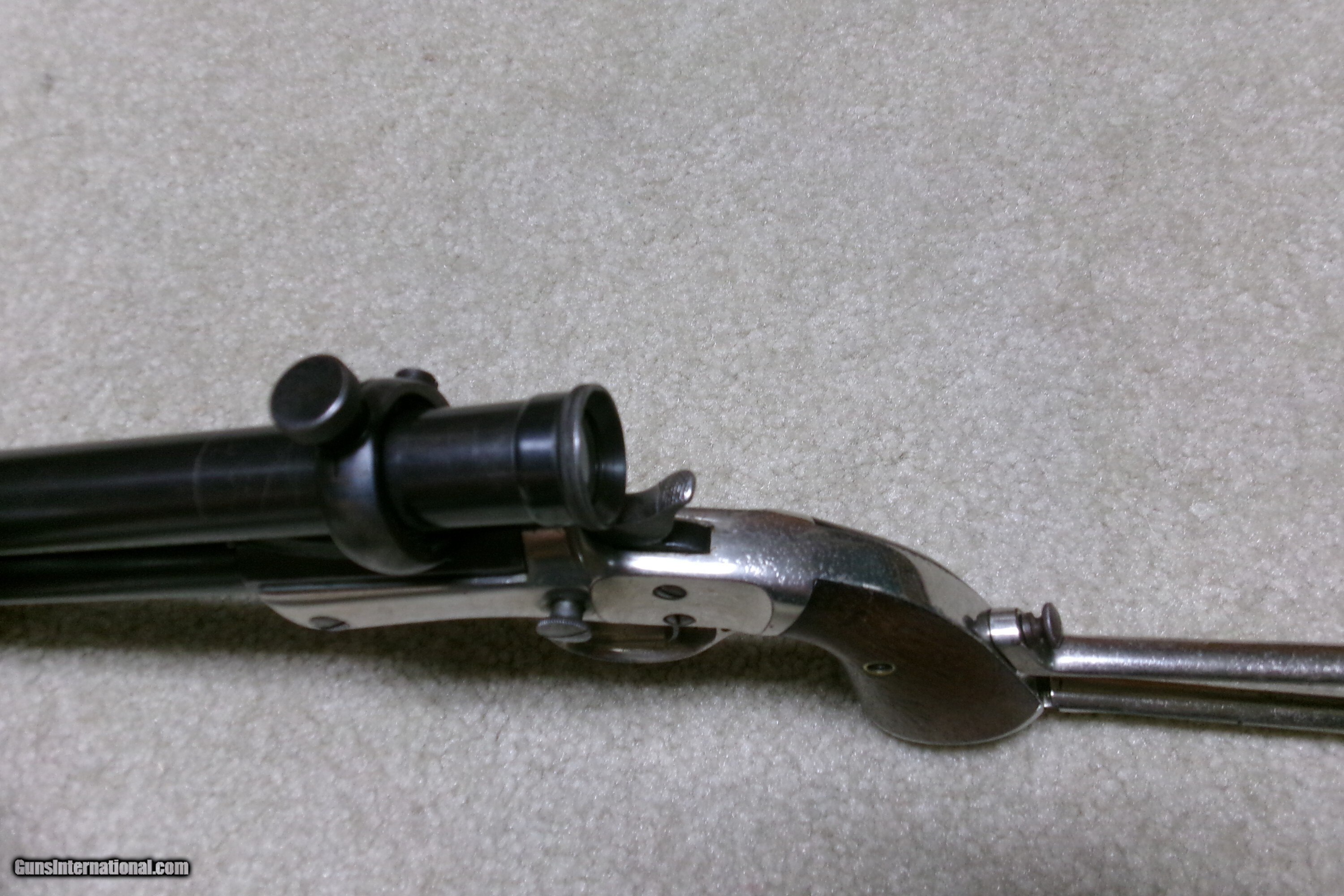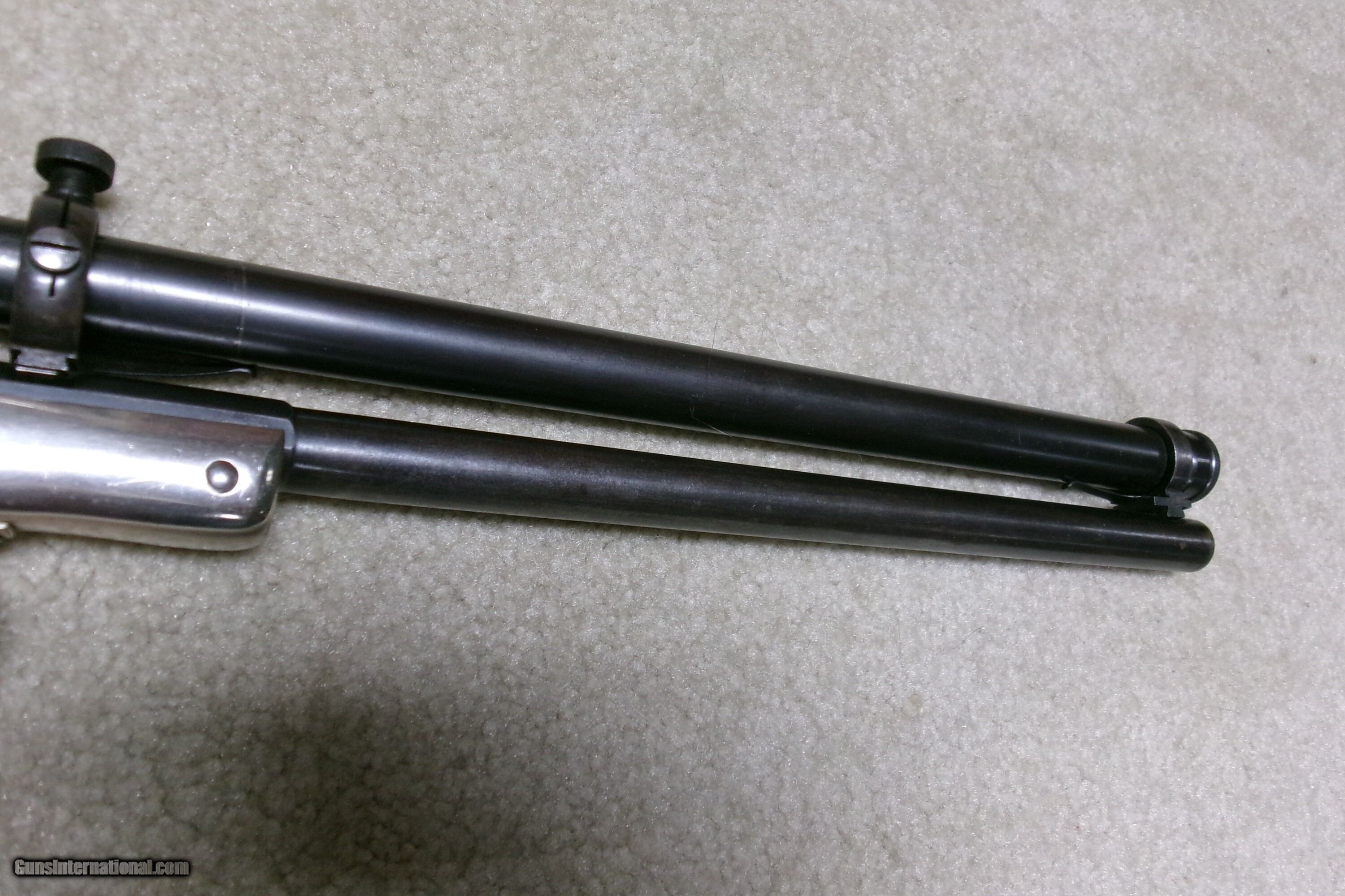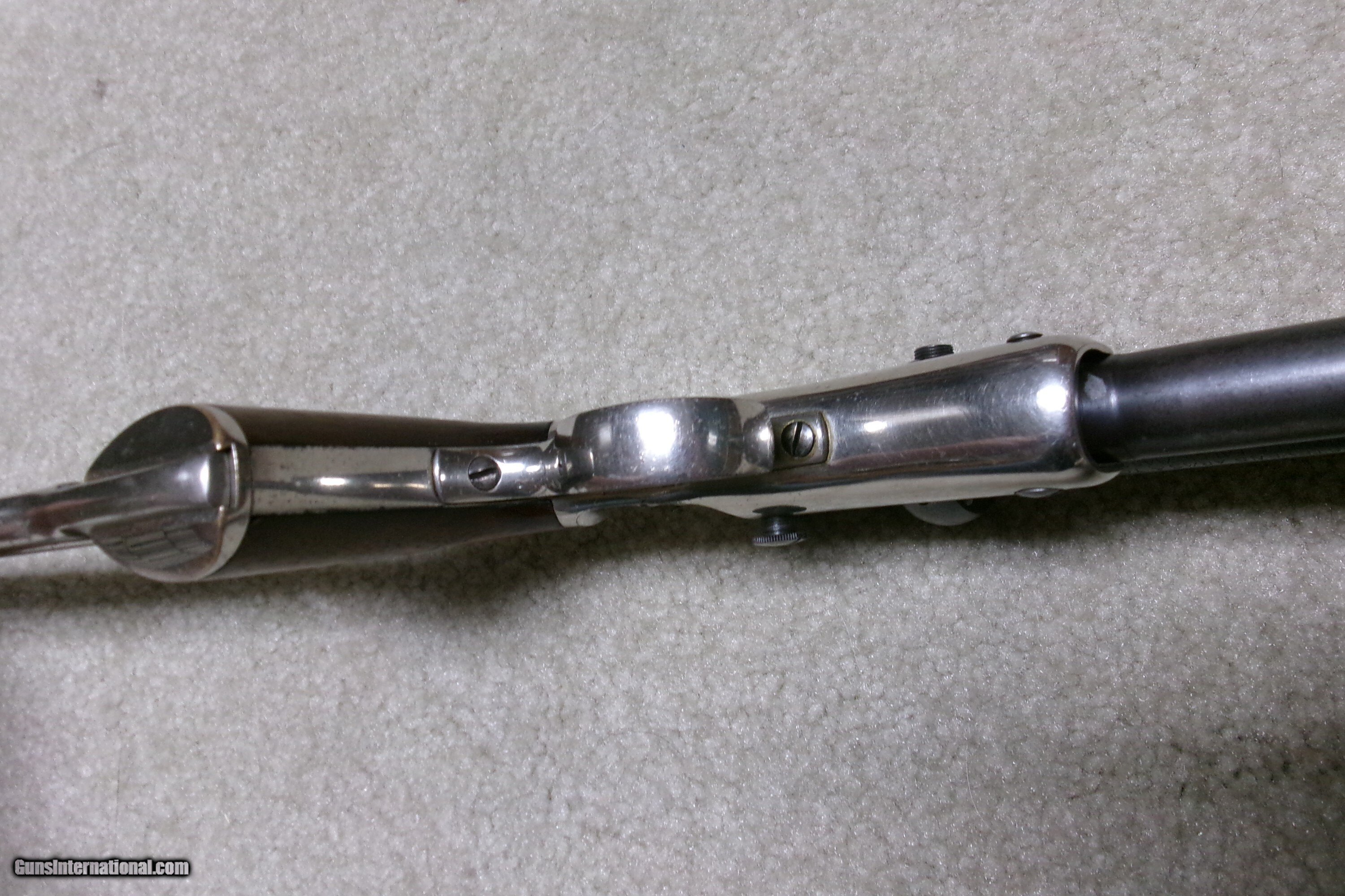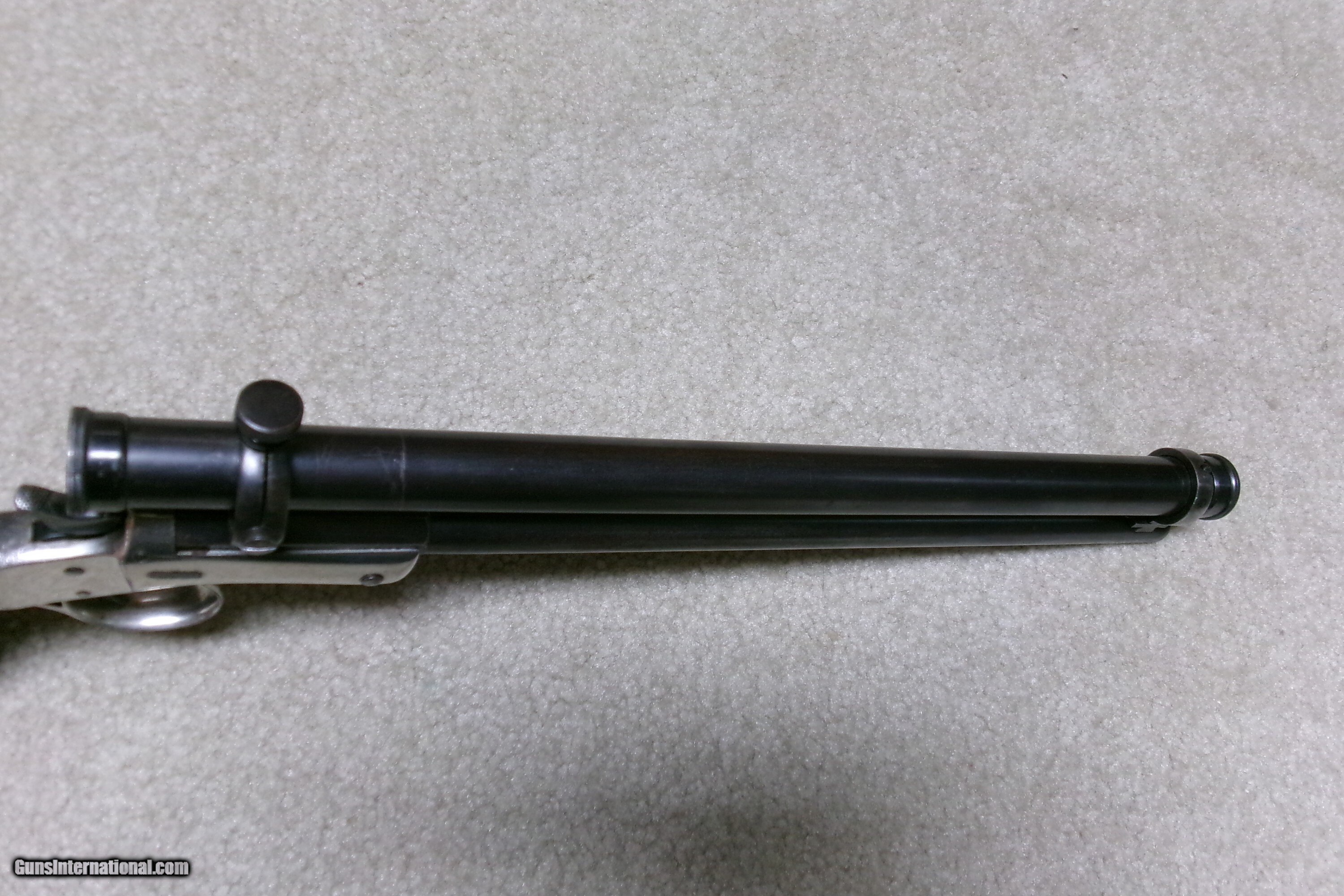 Description: SUPER RARE STEVENS NEW MODEL POCKET RIFLE No. 40 WITH FACTORY CORRECT STEVENS SCOPE, #18XXX. Only about 15,000 of this model was made from 1896-1916 in all calibers and barrel lengths. Very few were scoped. This one has the correct No. 550 marked scope which is a 3X made only for the 12” New Model Pocket Rifle. The scope has all the correct Stevens markings, adjustable rear mount and good optics with cross hair. The mounts are made to fit the original front and rear sight dovetails without extra screw holes or extra dovetails. Caliber is .22 Long Rifle and the barrel measures 12”. The scope and barrel show good blue with light thinning/aging on the bottom rear portion of the barrel. Nearly all the bright nickel remains on the frame, trigger guard and matching numbered stock. Exc. wood grips and screw heads. Bore is also excellent. Tight barrel to frame lock-up and strong safety half cock. These Stevens scoped Pocket Rifles are rarely seen or offered. This is a fine one. The final photo shows a photo of one from a 1908 Stevens catalog listing the No. 550 scope being made for the 12” barrel Pocket Rifle. Cost of the scope was $10- a large sum in 1908! Curio/Relic: Yes Rifle Caliber: .22 Long Rifle Manufacturer: STEVENS Model: No. 40 Serial Number: 18XXX Barrel Length: 12 Condition: EXCELLENT Bore Condition: EXCELLENT Price: $1,895.00 Contact Seller |