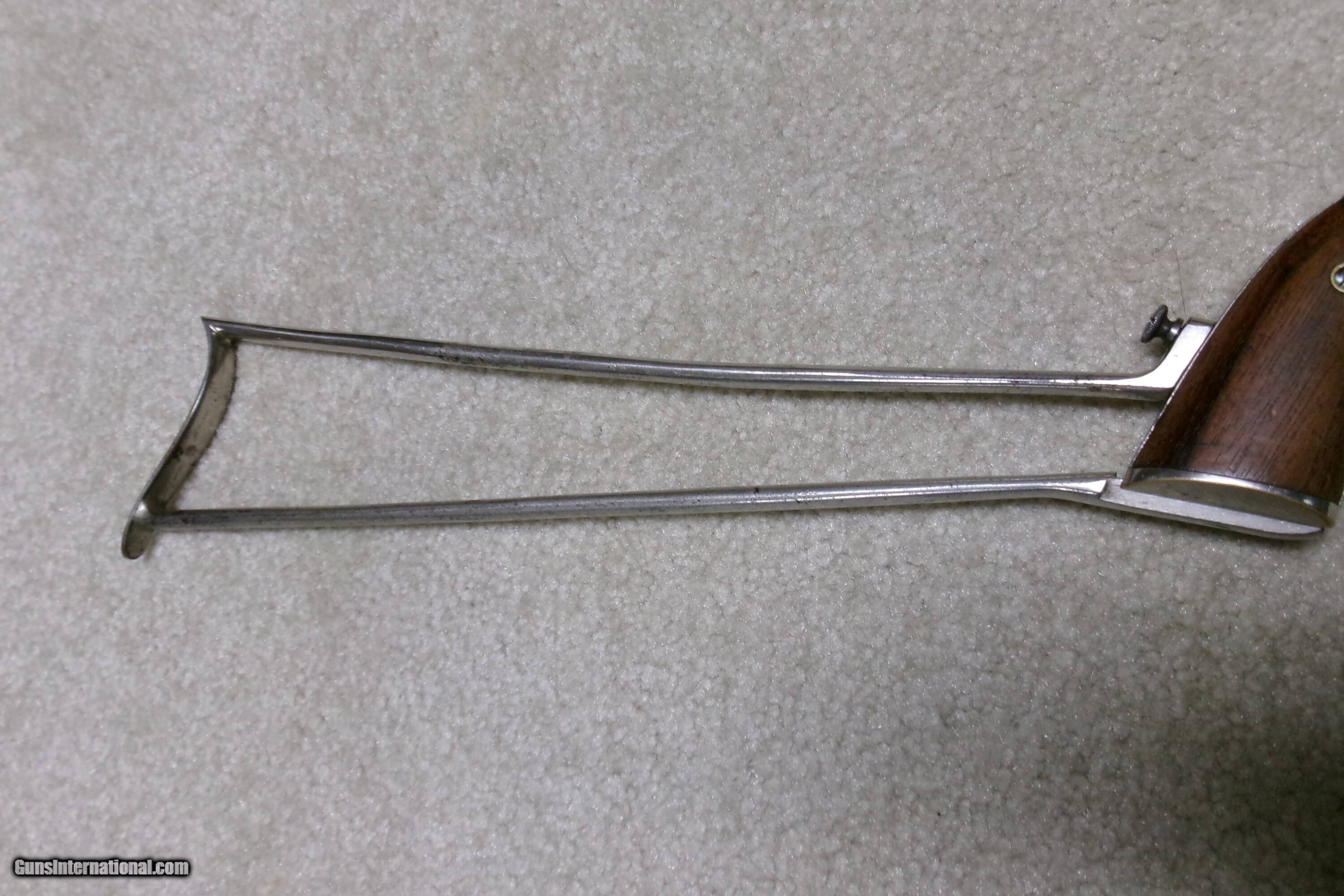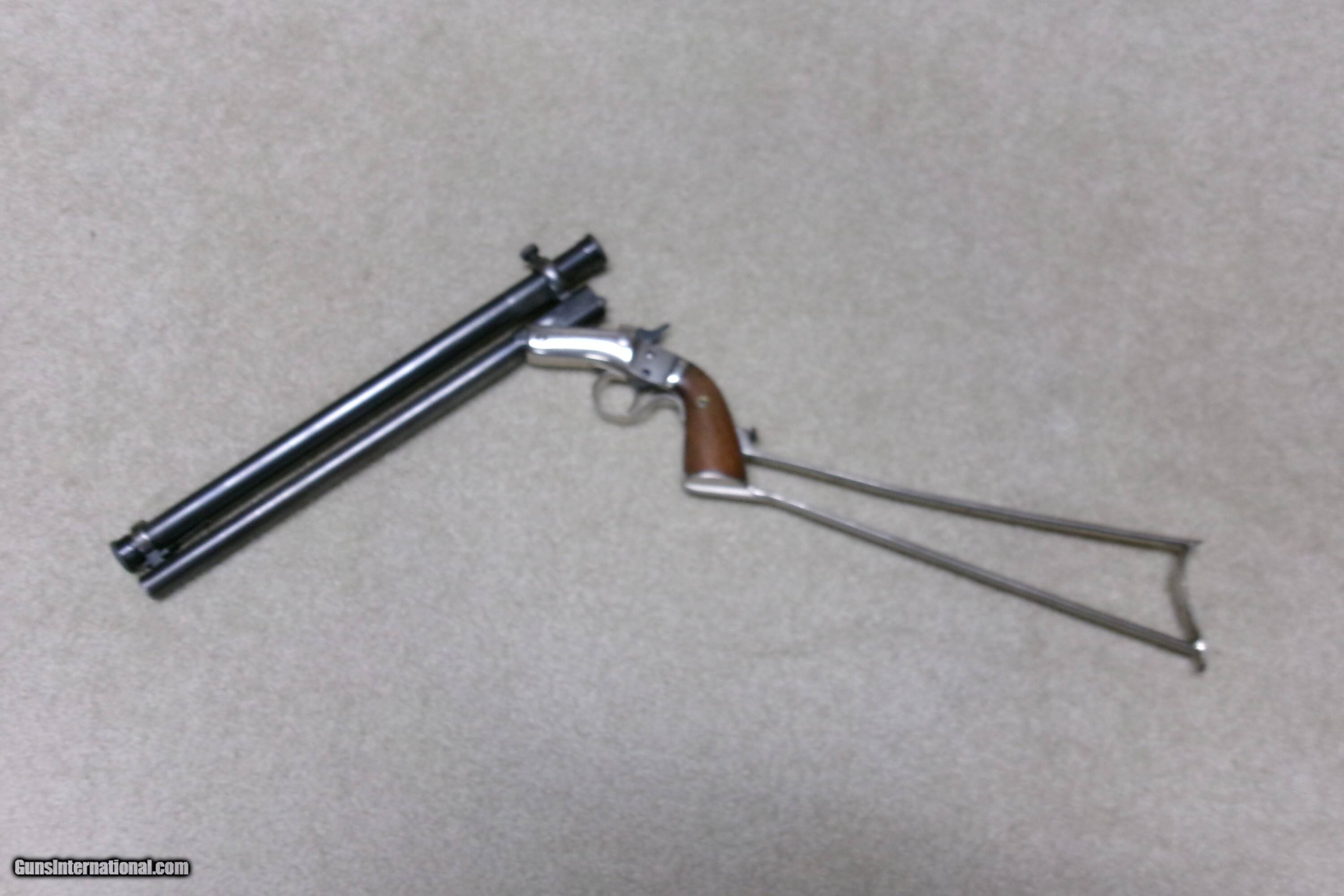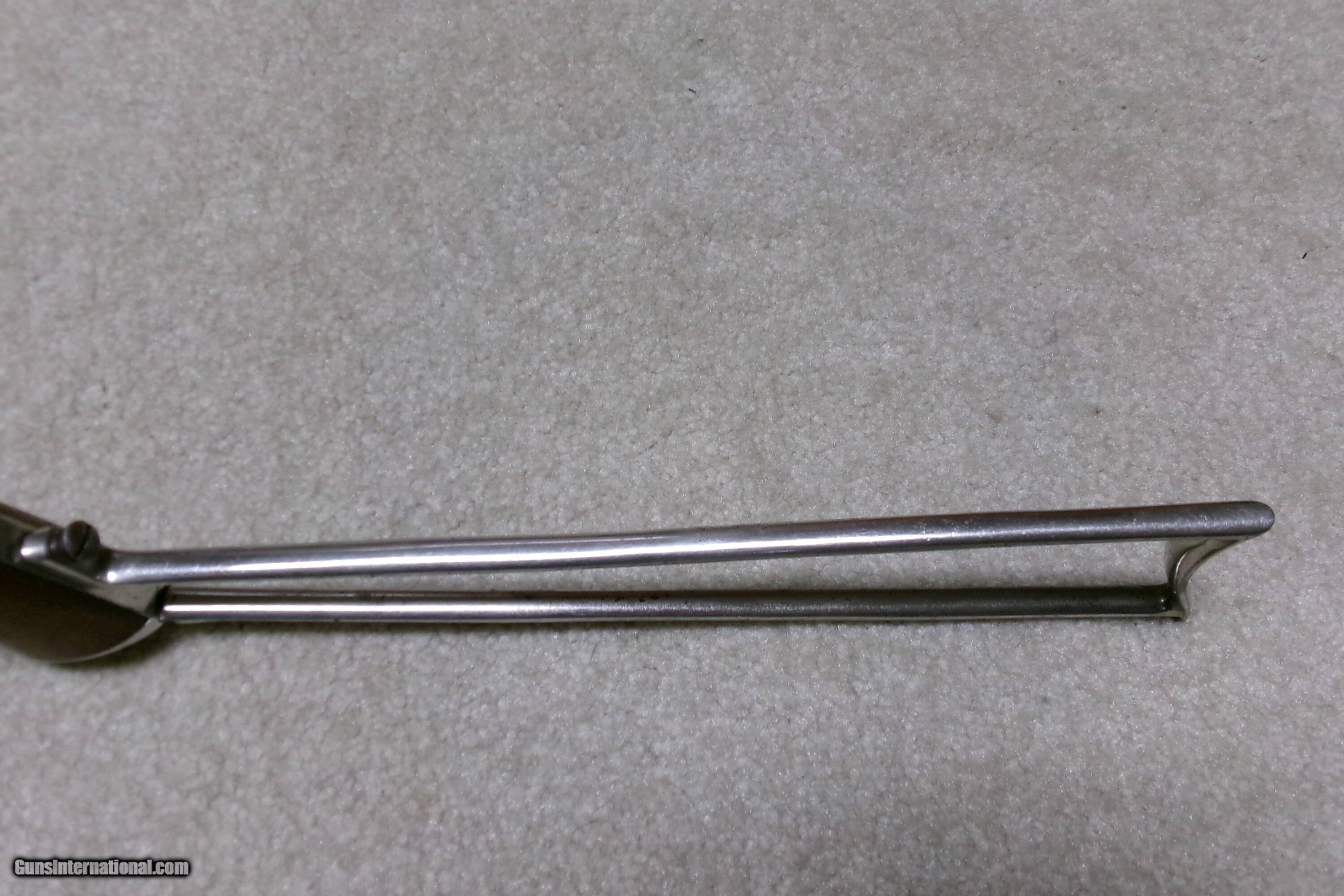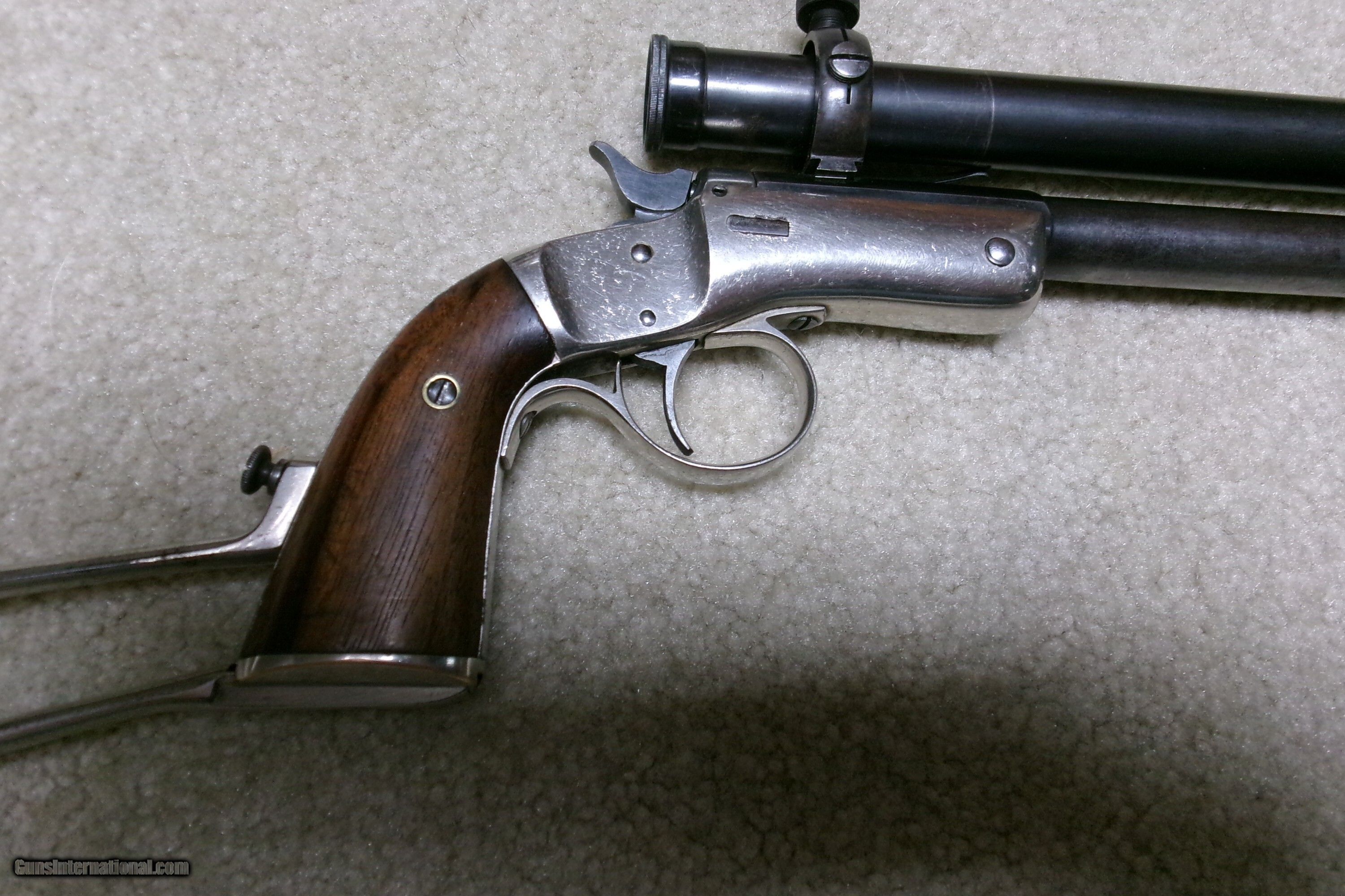 Description: SUPER RARE STEVENS NEW MODEL POCKET RIFLE No. 40 WITH FACTORY CORRECT STEVENS SCOPE, #18XXX. Only about 15,000 of this model was made from 1896-1916 in all calibers and barrel lengths. Very few were scoped. This one has the correct No. 550 marked scope which is a 3X made only for the 12” New Model Pocket Rifle. The scope has all the correct Stevens markings, adjustable rear mount and good optics with cross hair. The mounts are made to fit the original front and rear sight dovetails without extra screw holes or extra dovetails. Caliber is .22 Long Rifle and the barrel measures 12”. The scope and barrel show good blue with light thinning/aging on the bottom rear portion of the barrel. Nearly all the bright nickel remains on the frame, trigger guard and matching numbered stock. Exc. wood grips and screw heads. Bore is also excellent. Tight barrel to frame lock-up and strong safety half cock. These Stevens scoped Pocket Rifles are rarely seen or offered. This is a fine one. The final photo shows a photo of one from a 1908 Stevens catalog listing the No. 550 scope being made for the 12” barrel Pocket Rifle. Cost of the scope was $10- a large sum in 1908! Curio/Relic: Yes Rifle Caliber: .22 Long Rifle Manufacturer: STEVENS Model: No. 40 Serial Number: 18XXX Barrel Length: 12 Condition: EXCELLENT Bore Condition: EXCELLENT Price: $1,895.00 Contact Seller |