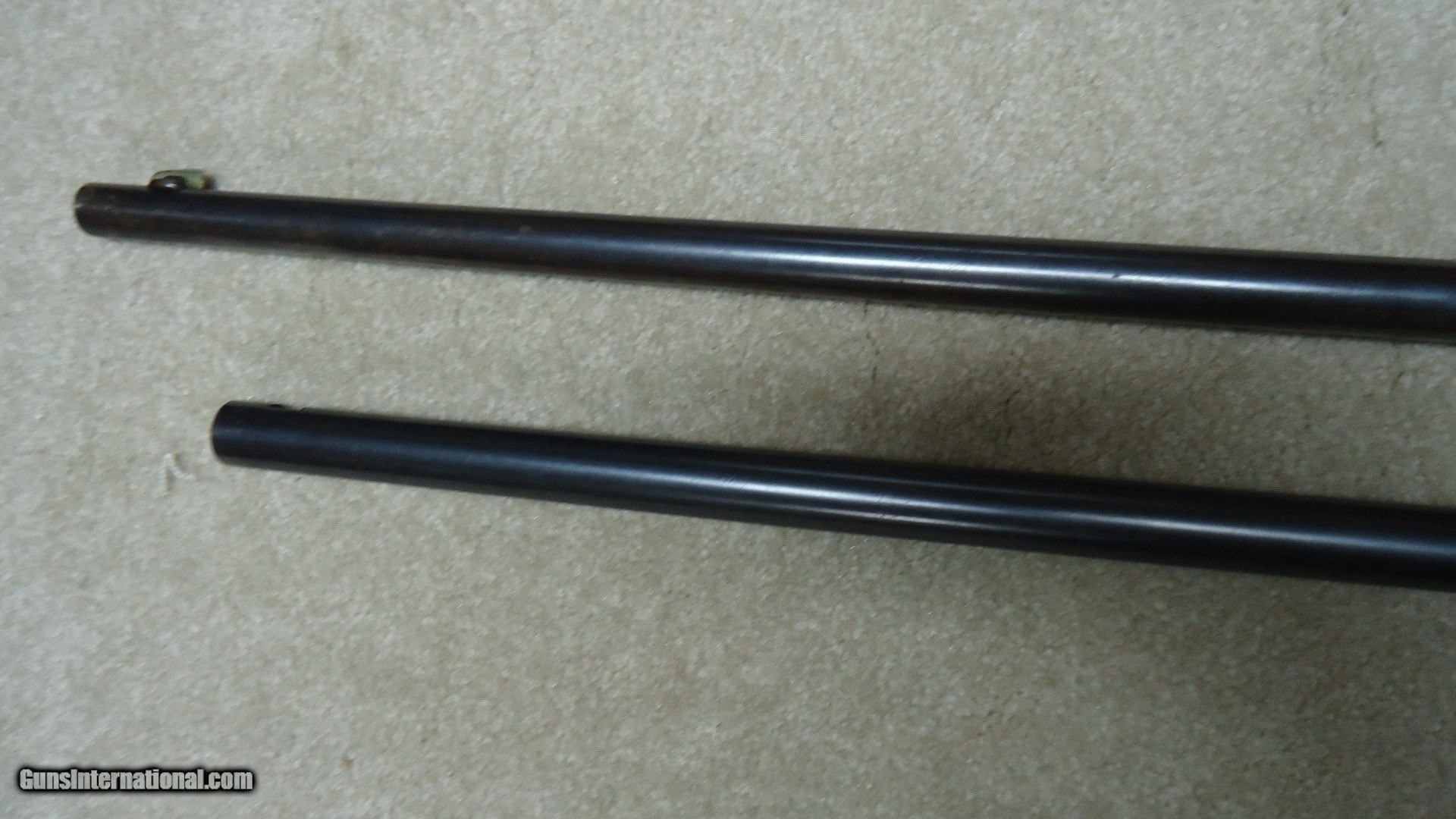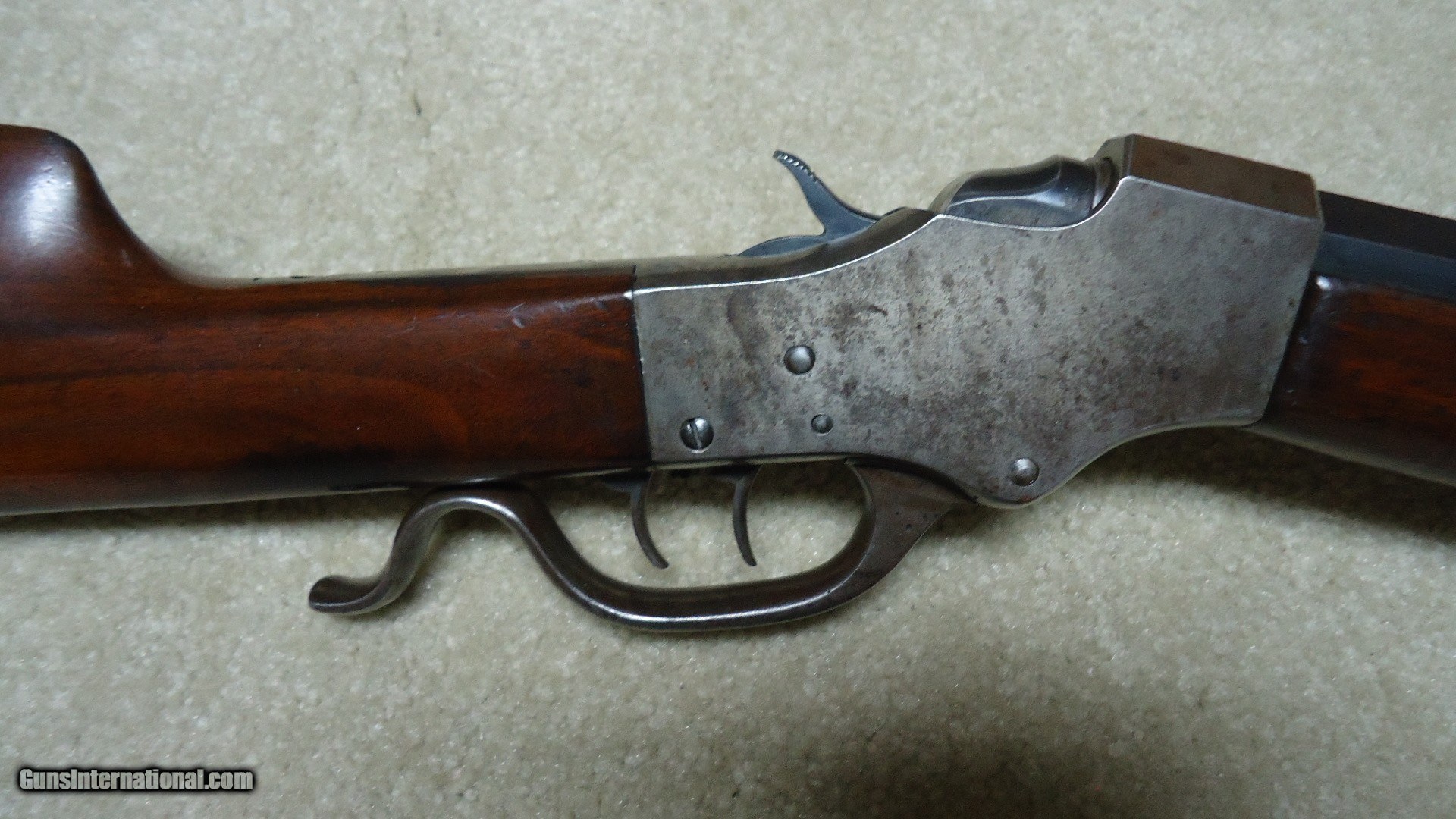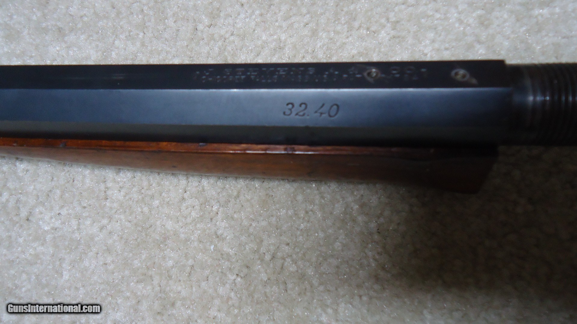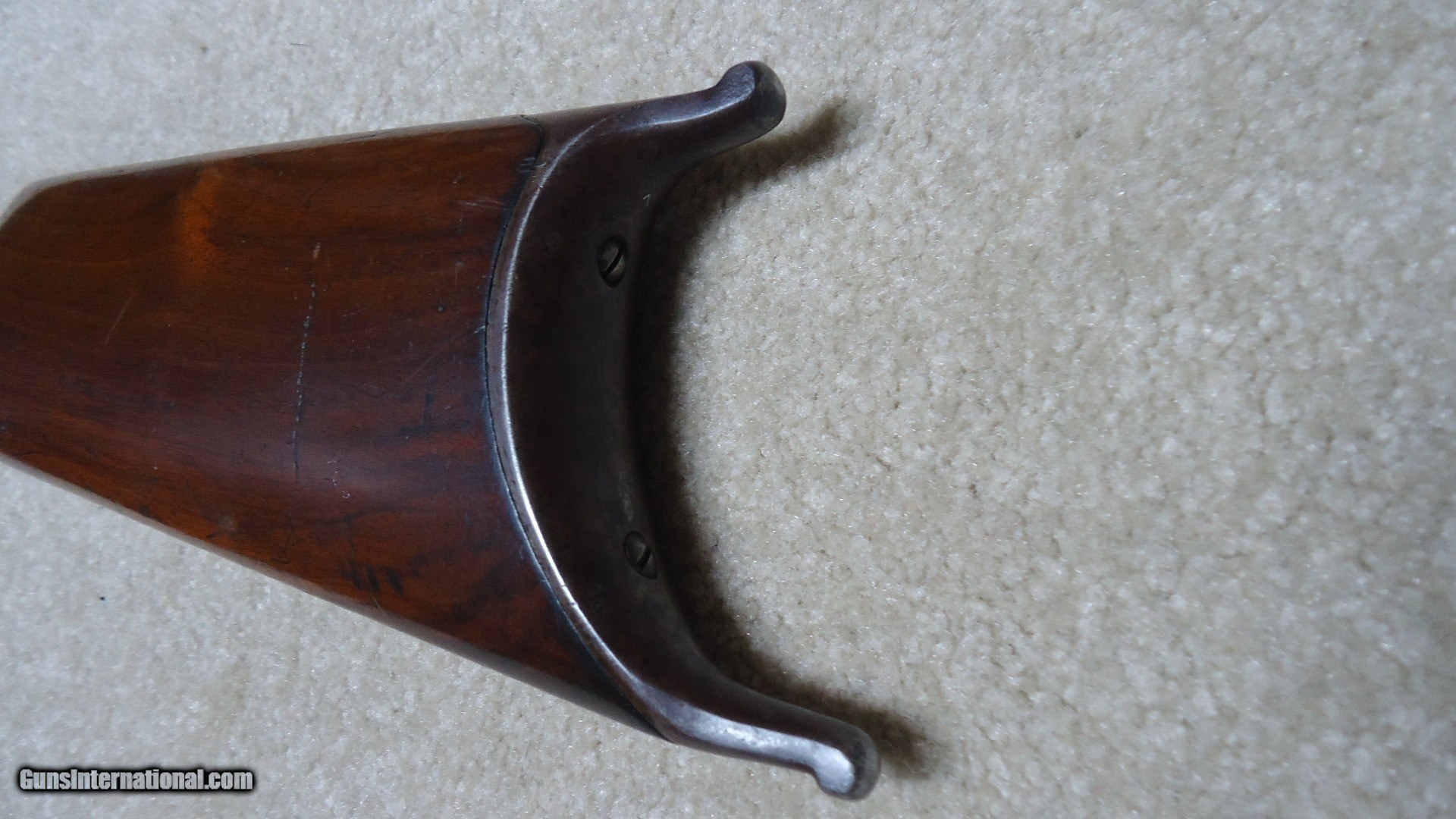 Description: SPECIAL ORDER STEVENS No. 45 "RANGE MODEL" ON THE DESIRABLE 44-1/2 ACTION, WITH EXTRA BARREL AND DOUBLE SET TRIGGERS. This one comes with the matching number .22 Long Rifle half octagon barrel that is 30" long (standard for rim fire cartridges was 26"). It also comes with a 26" half octagon barrel and forend in .32-40 caliber that is not numbered to match. the action is mostly an uncleaned gray with traces of case color in the more protected areas. The double set triggers retain the adjustment screw and function properly. The matching .22 LR barrel retains fine deep blue and is fitted with a Lyman two leaf folding rear sight with a Rocky Mountain blade front sight. The receiver was factory drilled and tapped for a tang sight, but none is with this rifle. The bore is a bit dark with good rifling and some scattered roughness toward the middle of the bore- some brushing and scrubbing with J-B bore paste would probably improve it somewhat. The wood is generally excellent and the stock retains the attractive and distinctive Swiss butt plate. Wood to metal fit is tight and the stock and forend show only light handling and no abuse. The extra .32-40 barrel shows an excellent bore, no sights and has been drilled and tapped for scope blocks (10" spacing from the middle of the two pairs of holes). It retains fine blue with an fine forend that has one hairline sliver/crack coming forward from the receiver on the left side that is about invisible. This barrel might take some minor fitting as it does not quite screw in all the way to the receiver to have the top of the barrel exactly at the 12 O'clock position- better this way than screwing in too far. Should be easy to fit. the breech block is missing a firing pin and may be set up for center fire. It may need separate blocks to use both barrels. I would think that the company CPA who reproduces the Stevens 44-1/2 could make everything right with this fine set. Very unusual with extra long barrel and double set triggers. The extra barrel is a plus. SOLD Curio/Relic: Yes Rifle Caliber: .22 Long Rifle Manufacturer: STEVENS Model: No. 45 RANGE MOD. 44 1/2 Serial Number: 4XXX Barrel Length: 30" & 26 Condition: FINE |
