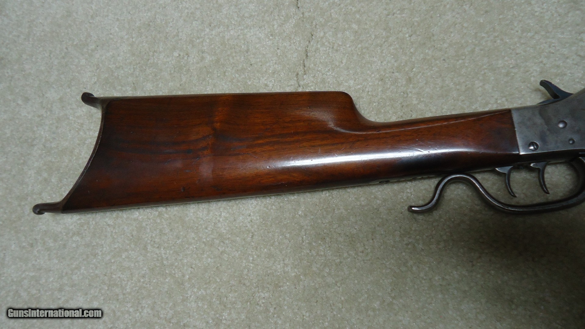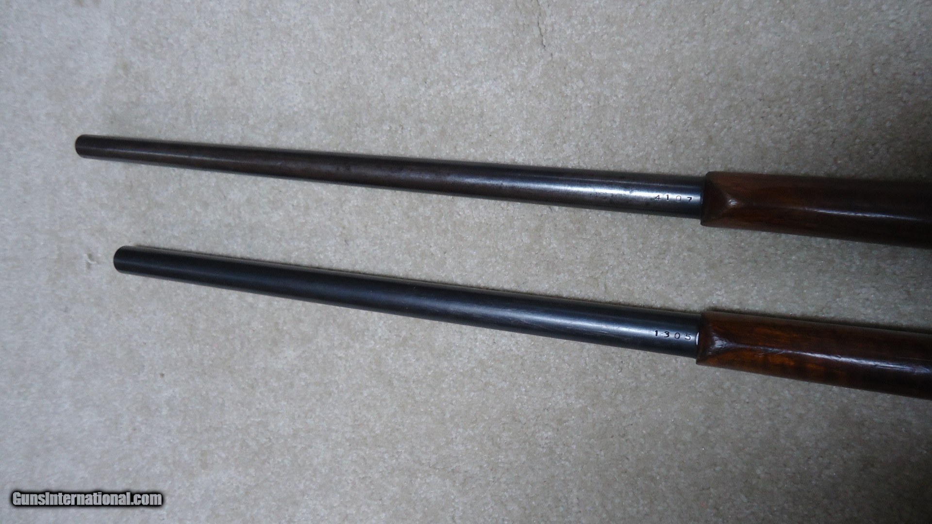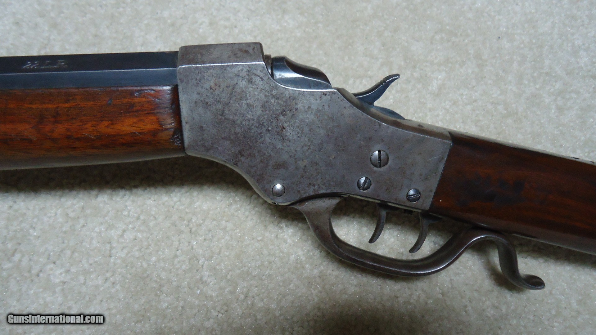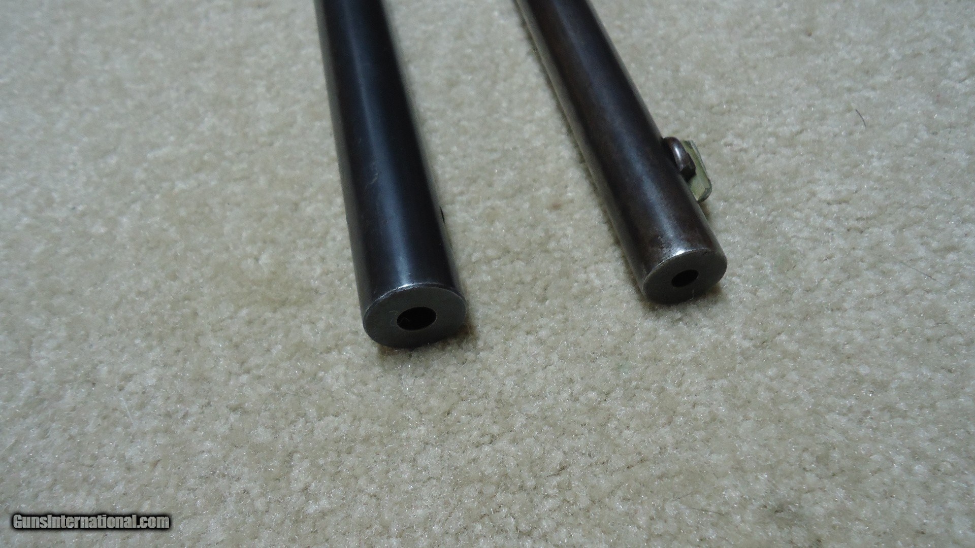 Description: SPECIAL ORDER STEVENS No. 45 "RANGE MODEL" ON THE DESIRABLE 44-1/2 ACTION, WITH EXTRA BARREL AND DOUBLE SET TRIGGERS. This one comes with the matching number .22 Long Rifle half octagon barrel that is 30" long (standard for rim fire cartridges was 26"). It also comes with a 26" half octagon barrel and forend in .32-40 caliber that is not numbered to match. the action is mostly an uncleaned gray with traces of case color in the more protected areas. The double set triggers retain the adjustment screw and function properly. The matching .22 LR barrel retains fine deep blue and is fitted with a Lyman two leaf folding rear sight with a Rocky Mountain blade front sight. The receiver was factory drilled and tapped for a tang sight, but none is with this rifle. The bore is a bit dark with good rifling and some scattered roughness toward the middle of the bore- some brushing and scrubbing with J-B bore paste would probably improve it somewhat. The wood is generally excellent and the stock retains the attractive and distinctive Swiss butt plate. Wood to metal fit is tight and the stock and forend show only light handling and no abuse. The extra .32-40 barrel shows an excellent bore, no sights and has been drilled and tapped for scope blocks (10" spacing from the middle of the two pairs of holes). It retains fine blue with an fine forend that has one hairline sliver/crack coming forward from the receiver on the left side that is about invisible. This barrel might take some minor fitting as it does not quite screw in all the way to the receiver to have the top of the barrel exactly at the 12 O'clock position- better this way than screwing in too far. Should be easy to fit. the breech block is missing a firing pin and may be set up for center fire. It may need separate blocks to use both barrels. I would think that the company CPA who reproduces the Stevens 44-1/2 could make everything right with this fine set. Very unusual with extra long barrel and double set triggers. The extra barrel is a plus. SOLD Curio/Relic: Yes Rifle Caliber: .22 Long Rifle Manufacturer: STEVENS Model: No. 45 RANGE MOD. 44 1/2 Serial Number: 4XXX Barrel Length: 30" & 26 Condition: FINE |