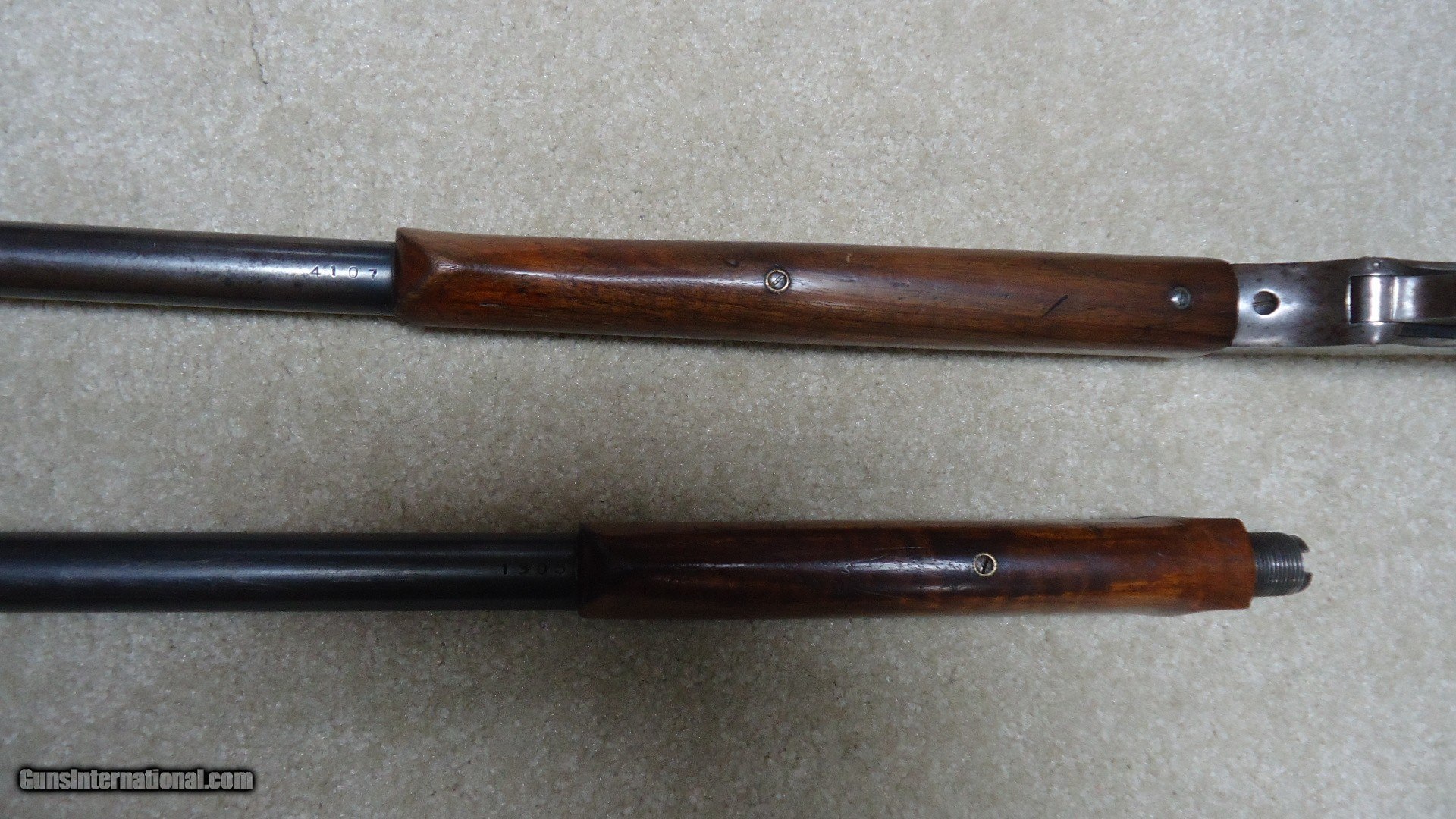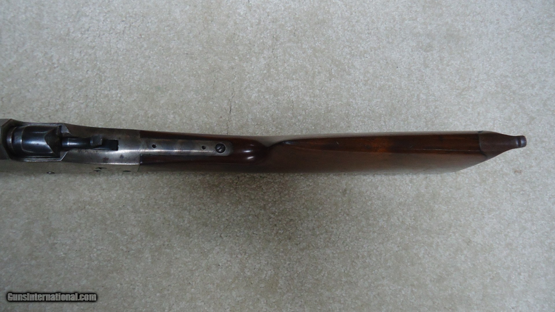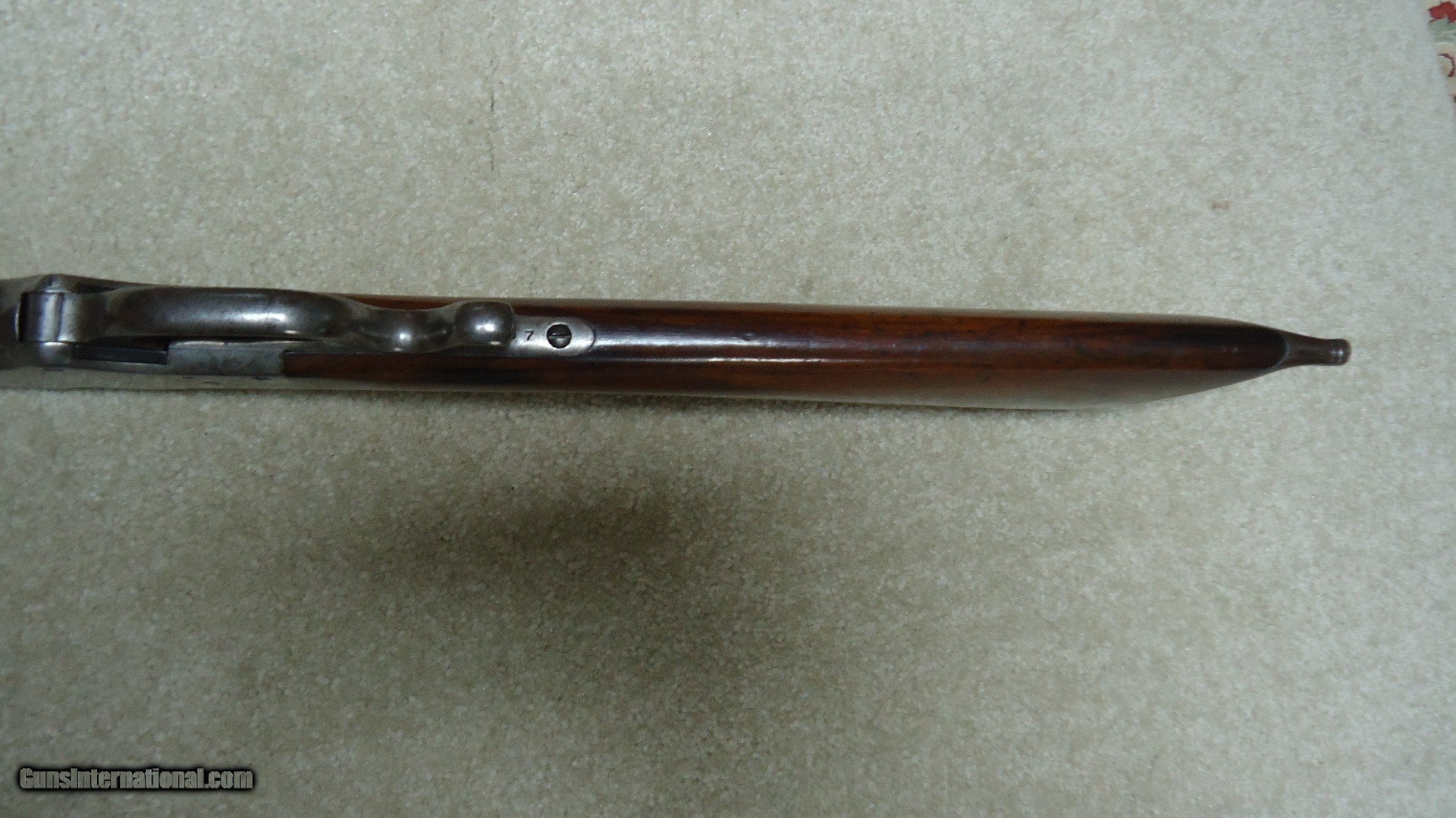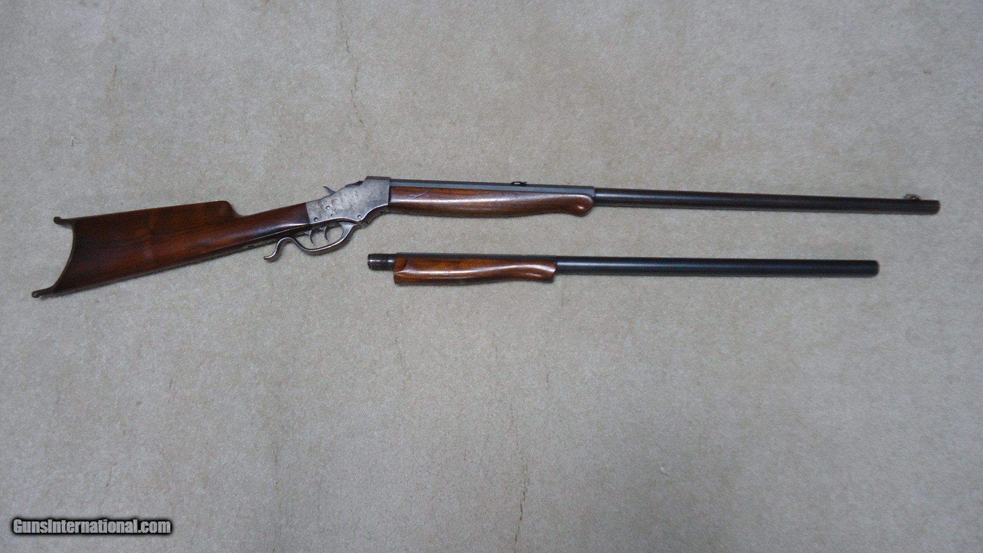 Description: SPECIAL ORDER STEVENS No. 45 "RANGE MODEL" ON THE DESIRABLE 44-1/2 ACTION, WITH EXTRA BARREL AND DOUBLE SET TRIGGERS. This one comes with the matching number .22 Long Rifle half octagon barrel that is 30" long (standard for rim fire cartridges was 26"). It also comes with a 26" half octagon barrel and forend in .32-40 caliber that is not numbered to match. the action is mostly an uncleaned gray with traces of case color in the more protected areas. The double set triggers retain the adjustment screw and function properly. The matching .22 LR barrel retains fine deep blue and is fitted with a Lyman two leaf folding rear sight with a Rocky Mountain blade front sight. The receiver was factory drilled and tapped for a tang sight, but none is with this rifle. The bore is a bit dark with good rifling and some scattered roughness toward the middle of the bore- some brushing and scrubbing with J-B bore paste would probably improve it somewhat. The wood is generally excellent and the stock retains the attractive and distinctive Swiss butt plate. Wood to metal fit is tight and the stock and forend show only light handling and no abuse. The extra .32-40 barrel shows an excellent bore, no sights and has been drilled and tapped for scope blocks (10" spacing from the middle of the two pairs of holes). It retains fine blue with an fine forend that has one hairline sliver/crack coming forward from the receiver on the left side that is about invisible. This barrel might take some minor fitting as it does not quite screw in all the way to the receiver to have the top of the barrel exactly at the 12 O'clock position- better this way than screwing in too far. Should be easy to fit. the breech block is missing a firing pin and may be set up for center fire. It may need separate blocks to use both barrels. I would think that the company CPA who reproduces the Stevens 44-1/2 could make everything right with this fine set. Very unusual with extra long barrel and double set triggers. The extra barrel is a plus. SOLD Curio/Relic: Yes Rifle Caliber: .22 Long Rifle Manufacturer: STEVENS Model: No. 45 RANGE MOD. 44 1/2 Serial Number: 4XXX Barrel Length: 30" & 26 Condition: FINE |