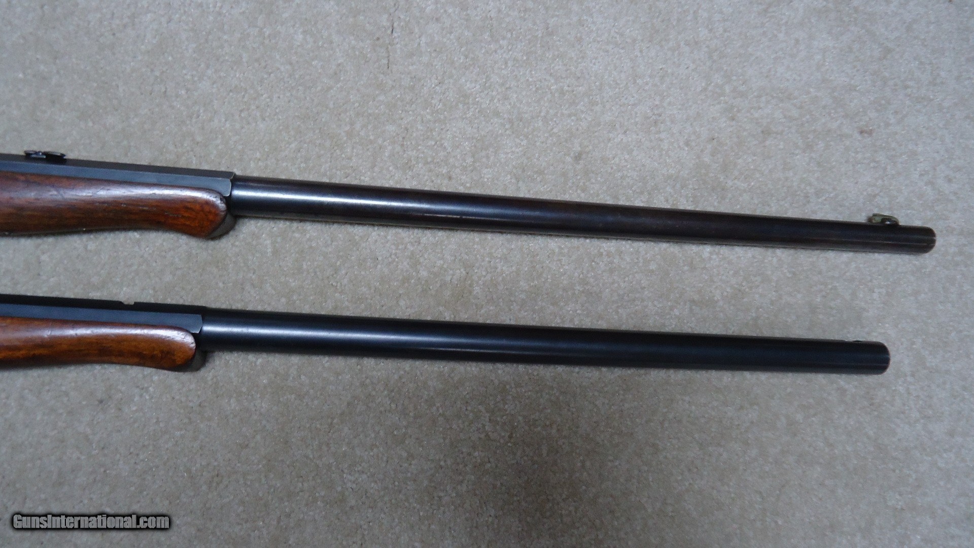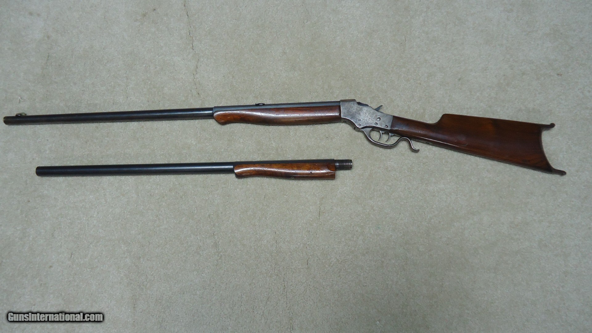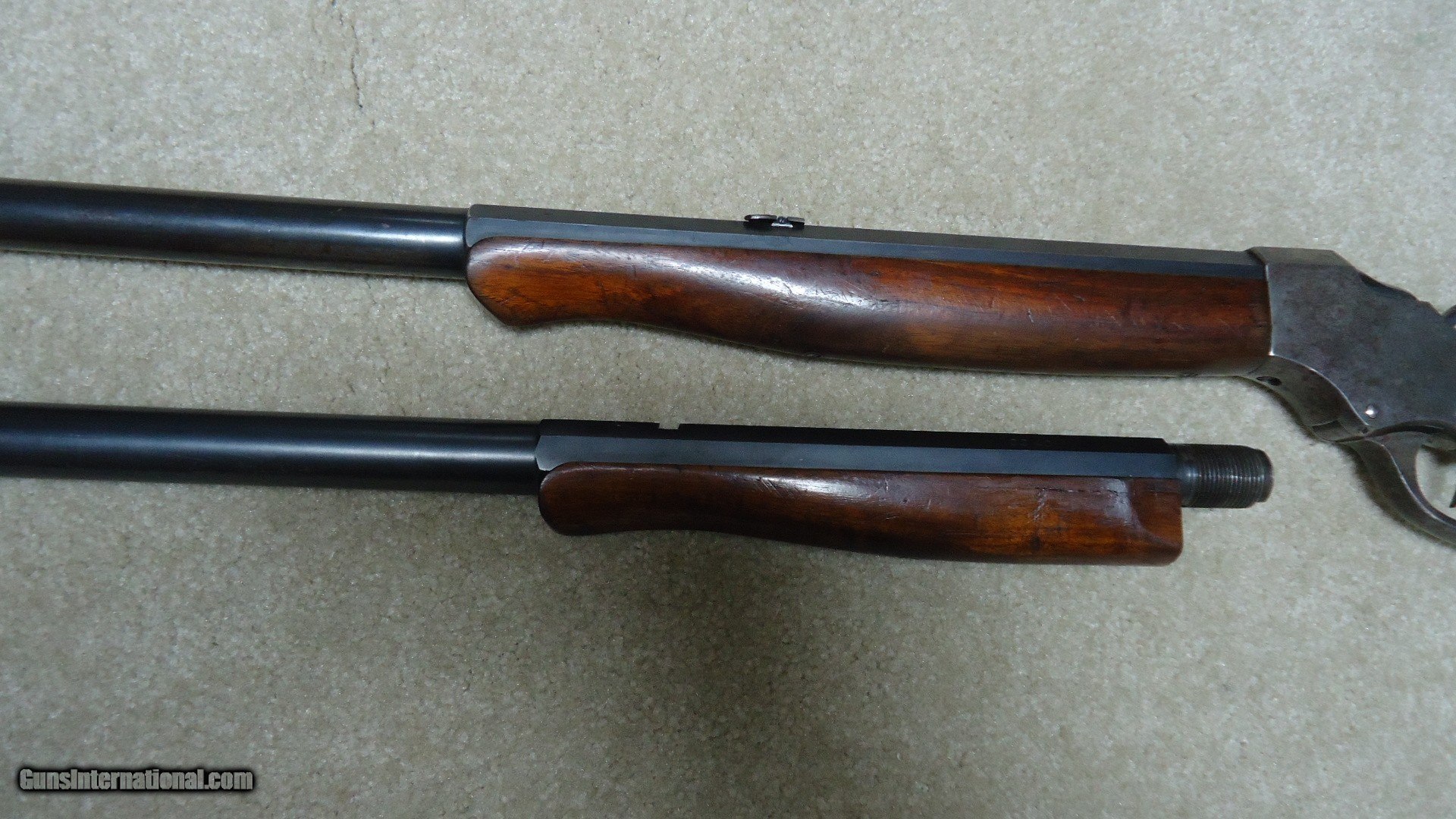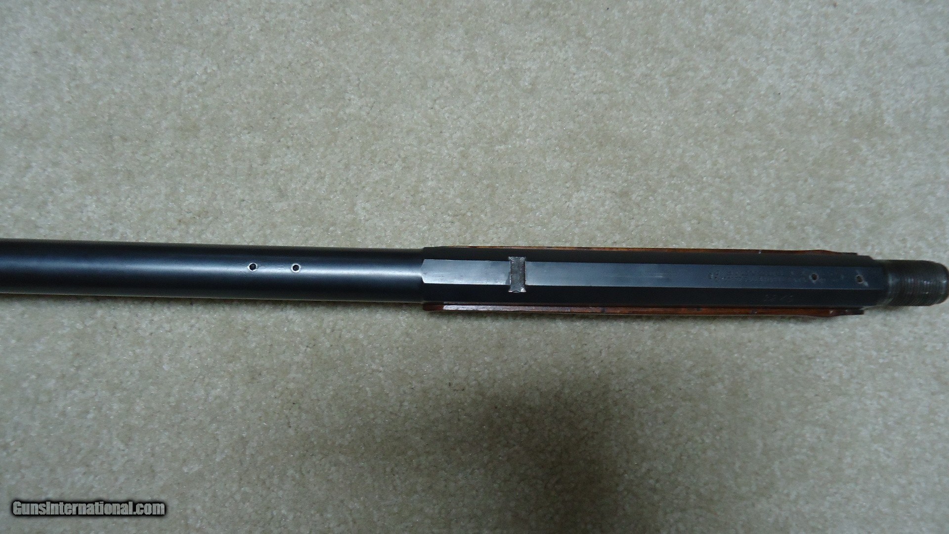 Description: SPECIAL ORDER STEVENS No. 45 "RANGE MODEL" ON THE DESIRABLE 44-1/2 ACTION, WITH EXTRA BARREL AND DOUBLE SET TRIGGERS. This one comes with the matching number .22 Long Rifle half octagon barrel that is 30" long (standard for rim fire cartridges was 26"). It also comes with a 26" half octagon barrel and forend in .32-40 caliber that is not numbered to match. the action is mostly an uncleaned gray with traces of case color in the more protected areas. The double set triggers retain the adjustment screw and function properly. The matching .22 LR barrel retains fine deep blue and is fitted with a Lyman two leaf folding rear sight with a Rocky Mountain blade front sight. The receiver was factory drilled and tapped for a tang sight, but none is with this rifle. The bore is a bit dark with good rifling and some scattered roughness toward the middle of the bore- some brushing and scrubbing with J-B bore paste would probably improve it somewhat. The wood is generally excellent and the stock retains the attractive and distinctive Swiss butt plate. Wood to metal fit is tight and the stock and forend show only light handling and no abuse. The extra .32-40 barrel shows an excellent bore, no sights and has been drilled and tapped for scope blocks (10" spacing from the middle of the two pairs of holes). It retains fine blue with an fine forend that has one hairline sliver/crack coming forward from the receiver on the left side that is about invisible. This barrel might take some minor fitting as it does not quite screw in all the way to the receiver to have the top of the barrel exactly at the 12 O'clock position- better this way than screwing in too far. Should be easy to fit. the breech block is missing a firing pin and may be set up for center fire. It may need separate blocks to use both barrels. I would think that the company CPA who reproduces the Stevens 44-1/2 could make everything right with this fine set. Very unusual with extra long barrel and double set triggers. The extra barrel is a plus. SOLD Curio/Relic: Yes Rifle Caliber: .22 Long Rifle Manufacturer: STEVENS Model: No. 45 RANGE MOD. 44 1/2 Serial Number: 4XXX Barrel Length: 30" & 26 Condition: FINE |