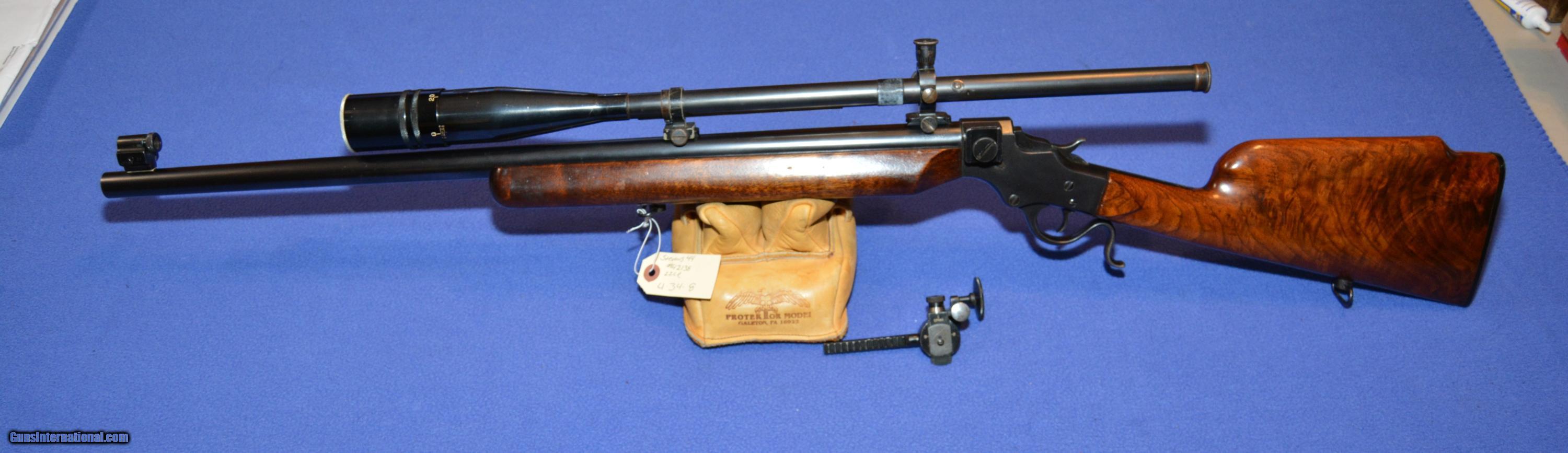 Description: Stevens No 44 22 LR target Fantastic wood adorns this Stevens No 44 single shot rifle; the receiver is serial numbered 42138. The rifle has a 26-inch heavy target barrel chambered in 22 Long R with gradual taper and recessed muzzle crown. The bore is perfect. The barrel is marked C.C. Johnson on the side and under the fore end is 470032 DLR. According to the ASSRA site this indicates from the records of C. C. Johnson that this was job # 32 in 1947. The DLR was Mr. Johnsons shop code for Dillard barrels. C.C. Johnson was a very well-known barrel and target rifle builder in the late 30’s-40’s hailing from, Thackery and Lawrenceville OH. The rifle is set up with scope mount blocks and a Lyman #438 Field Scope with lens cover and adjustable and a Lyman # 525 rear sight and a Lyman #77 front globe sight. The front globe can have various apertures installed. The tang is also drilled for the use of a tang mounted sight. The rifle has sling mounts and loops in the beautiful for precision prone or other position shooting. This rifle is extremely accurate. Yes, we can and do ship into California. Shipping will be $25.00 USPS Priority Mail if east of the Mississippi River, West will be $31.00, West Coast states $40.00. Alaska and Hawaii will need a quote. If illegal to own in your area don’t bid. Payment with US Funds from US Banks ONLY!!! We accept Cash, Checks, Money Order and US Postal Money Orders. We also accept Visa, MasterCard and Discover at 2.8% service fee. All items ship when payment clears, no exceptions. We do not accept PayPal or American Express. Call 865-805-1187 for details or questions. Out of state buyers no sales tax yet. Local buyers must pay TN sales tax and $10.00 TBI state back ground check fee. Please encourage your congressman and senator to vote against an internet sales tax and instead encourage local shops to hire persons to post on the web. I’ve done both! SOLD Curio/Relic: Yes Manufacturer: Steven and CC Johnson Model: 44 Serial Number: 42138 Caliber Info: 22 LR Condition: Excellent Plus Metal Condition: 99% Wood Condition: Excellent Bore Condition: Excellent plus Barrels: 26 inches Barrel Type: Steel Action: Single Triggers: Single |