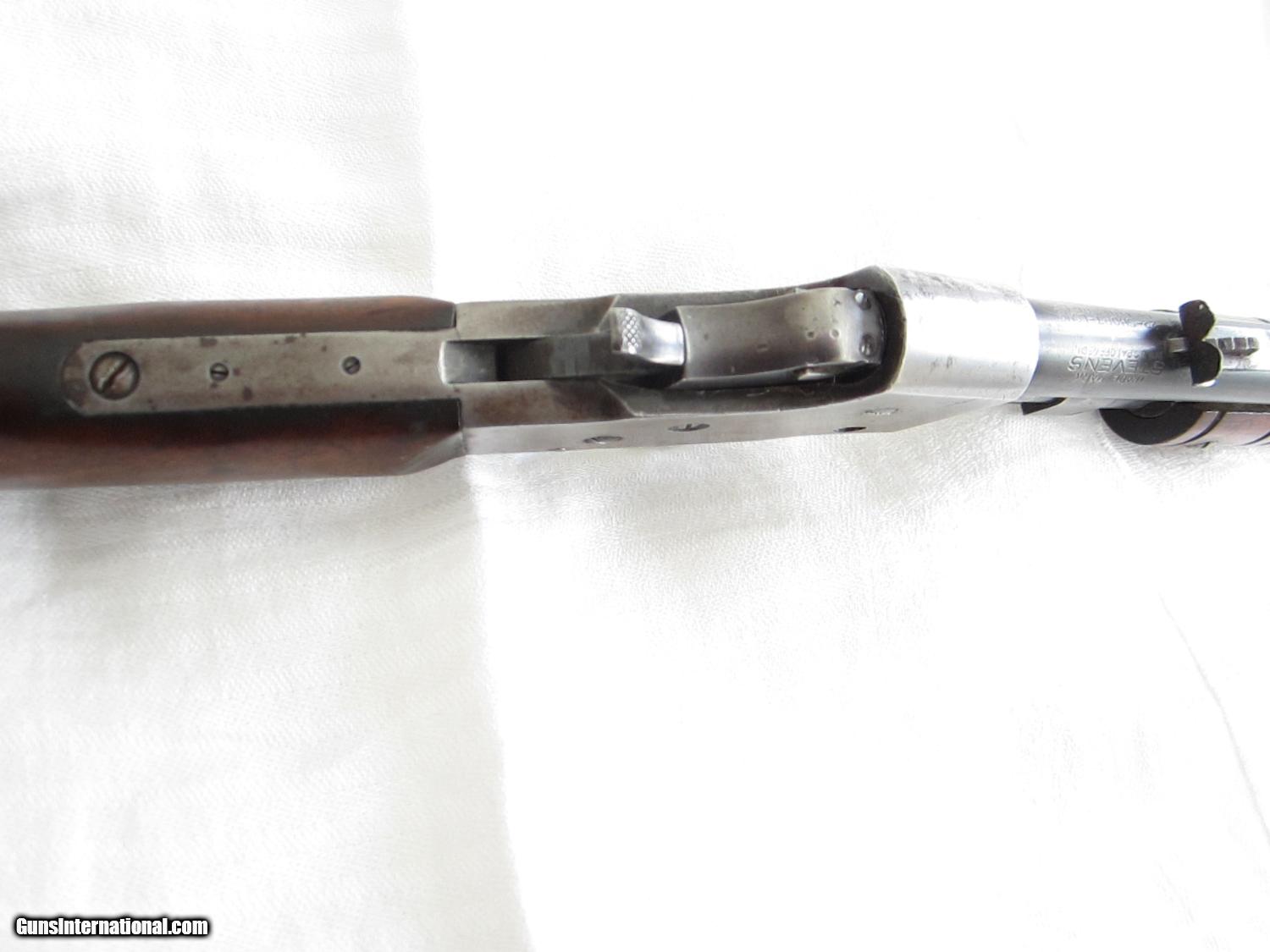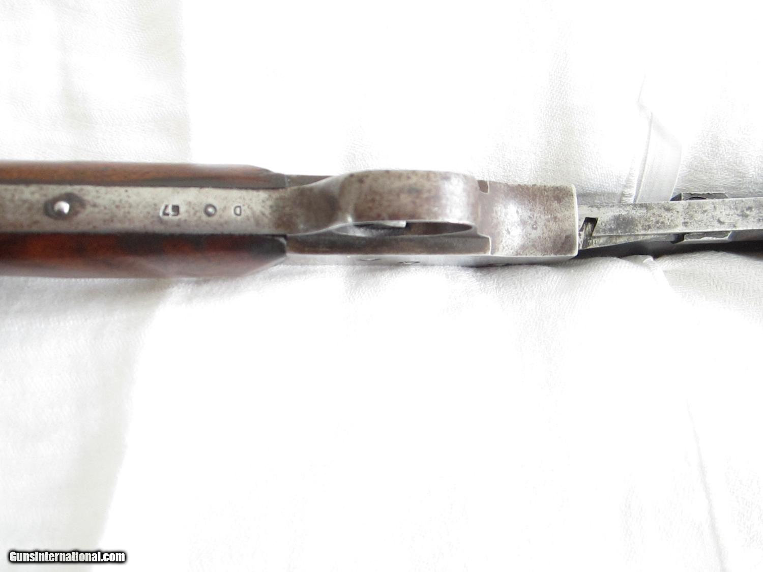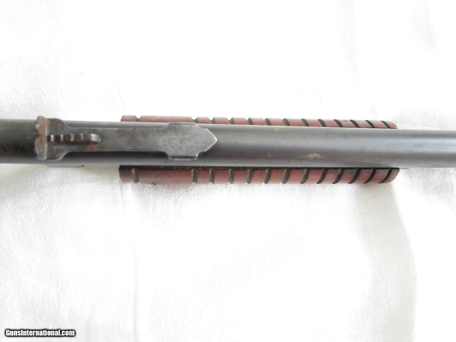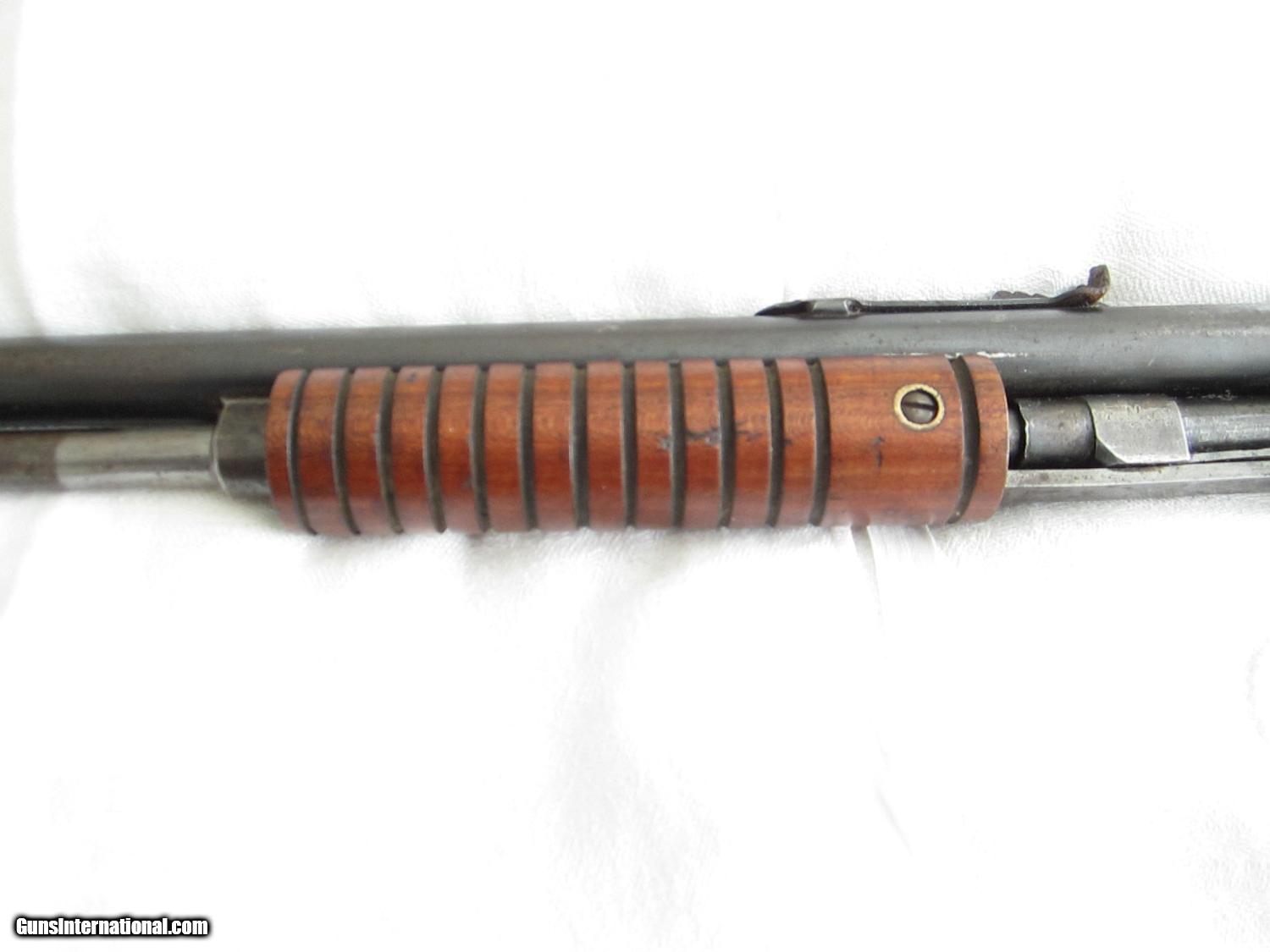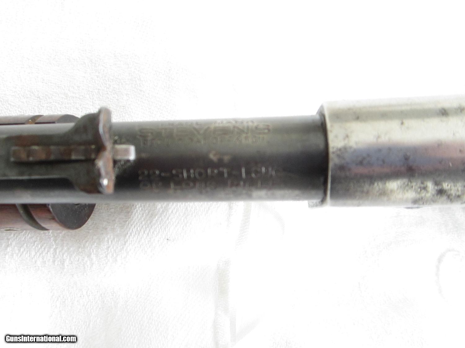 Description: This Stevens Pump Action rifle fires .22 caliber short, long and long rifle cartridges. The Model 70 was made from 1907 to the early 1930's. It is fun to shoot and the action is strong with everything working properly. The round barrel is 20 and 3/4" long and shows 60 to 70 % of the original blue finish. The overall length is 36" There are a few minor marks in the metal here and there but the overall condition is very good. The stock is in very good condition with a few use marks, but no splits, cracks or wood loss. The wood forepiece looks almost new but it is original.. The bore is somewhat dark but lots of rifling can be seen so it probably needs a good cleaning. This rifle looks and functions a lot like an old Winchester Model 1890 or 1906 pump. The big difference is you can buy thie nice Stevens for a third or less than what a Winchester sells for. The serial # is D 67 and on the left side of the action there are two marks, an 1 and a P both in circles.The top of the barrel contains the name "Stevens" and "Short, Long, Long Rifle". This is not a take down model and there is an exposed hammer. A sale must go through an FFL or the holder of a Curio/Relic license/ See others for sale under the name "ROMSEY" on this . SOLD Curio/Relic: Yes Manufacturer: Stevens Model: Model 70 Serial Number: D 67 Caliber Info: .22, S,L,LR Condition: good + good Wood Condition: very good Bore Condition: needs cleaning Barrels: one Barrel Type: round Action: pump Triggers: one Fore End: excellent very good Finish: blued Manufacture Date: 1907- 1932 Engraving: no Item Location: California |