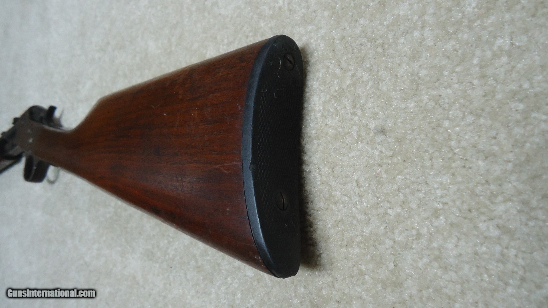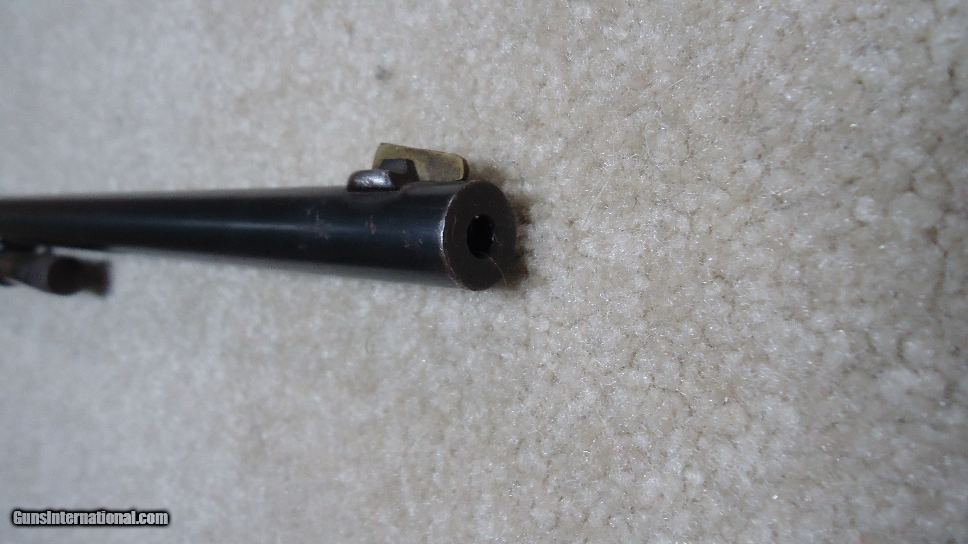 Description: STEVENS "VISIBLE LOADER" PUMP ACTION .22 LR RIFLE, #M1X, MADE 1908-1931. The best information on this unusual rifle comes from the book American Boys' Rifles 1890-1945 by Jim Perkins. In the Stevens section he writes: The most unusual .22 caliber pump action rifle ever made was brought out by Stevens in late 1908. Called the Visible Loader No. 70... This unusual rifle has a tube magazine under the barrel which holds cartridges. The short wood forearm is attached to the magazine tube, and the breech end of the tube is attached to the breech block. When the forearm slides back, the breech block travels to the rear and automatically cocks the hammer. The cartridge lifter is connected to the rear of the breech block, and when the hammer moves to full cock, the lifter is tripped and moves upwards, lifting a cartridge from the magazine and simultaneously ejecting an empty shell. The cartridges move up a shallow vertical groove in the face of the breech block. Early rifles were chambered in .22 Short only with later models chambered in .22 Short, Long & Long Rifle (like this one). He also states barrels were originally 20" and in 1912 were changed to 22" (again ,like this one.) In 1912 this rifle sold for $8. As most of these rifles were intended for young boys (girls?) who generally used them frequently and hard, those encountered today are usually pretty beat up. This is a nice example that retains fine barrel and mag blue. The receiver is mainly aged dark. The barrel markings are sharp including the 1907 patent date and "Visible Loading Repeater." Wood is excellent and the stock retains the correct original butt plate. Open buckhorn rear sight needs an elevator bar only and is mated with a blade front sight. Bore is a little dark, but fine+ with only some scattered very light roughness and deep rifling throughout. Tight action. A very high quality approx. 100 year old Stevens. SOLD Curio/Relic: Yes Manufacturer: STEVENS Model: VISIBLE LOADER M-70 Serial Number: M1X Barrel Length: 22 Condition: FINE Bore Condition: FINE |